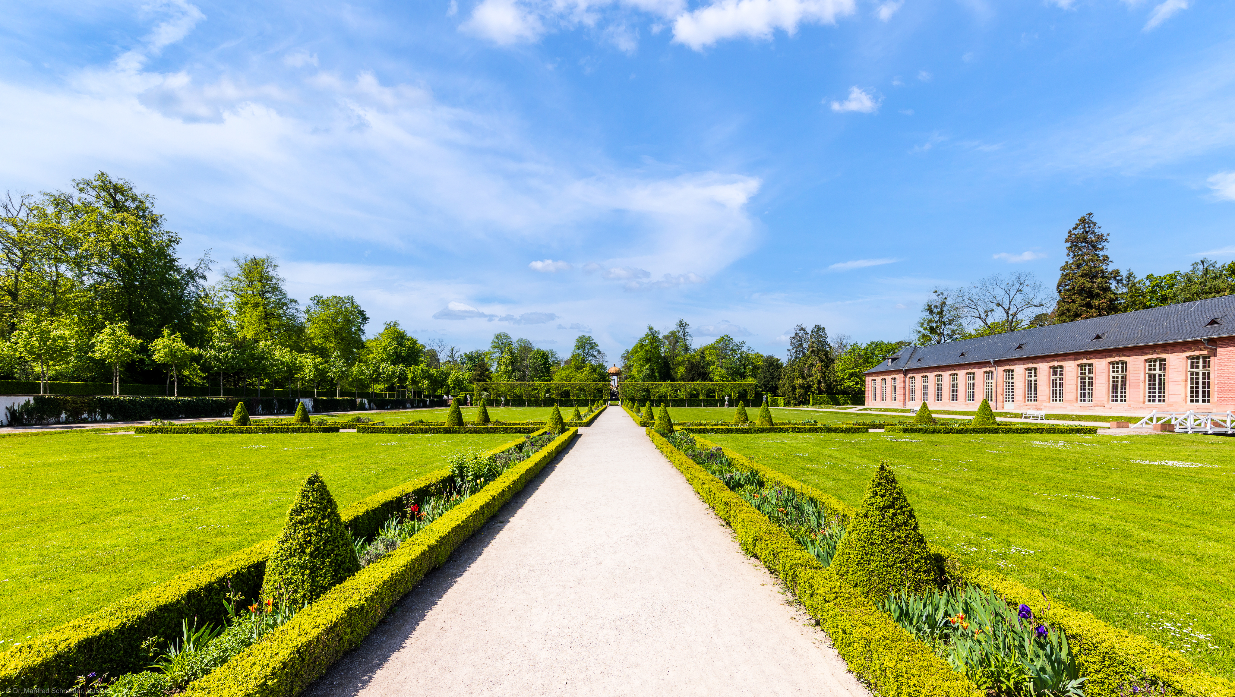 Schloss und Schlossgarten Schwetzingen - Garten - Orangeriegarten - Von Osten - Blick nach Westen in den Orangeriegarten; mittig im Hintergrund der Apollotempel, rechts die Neue Orangerie (aufgenommen im Mai 2023, um die Mittagszeit)