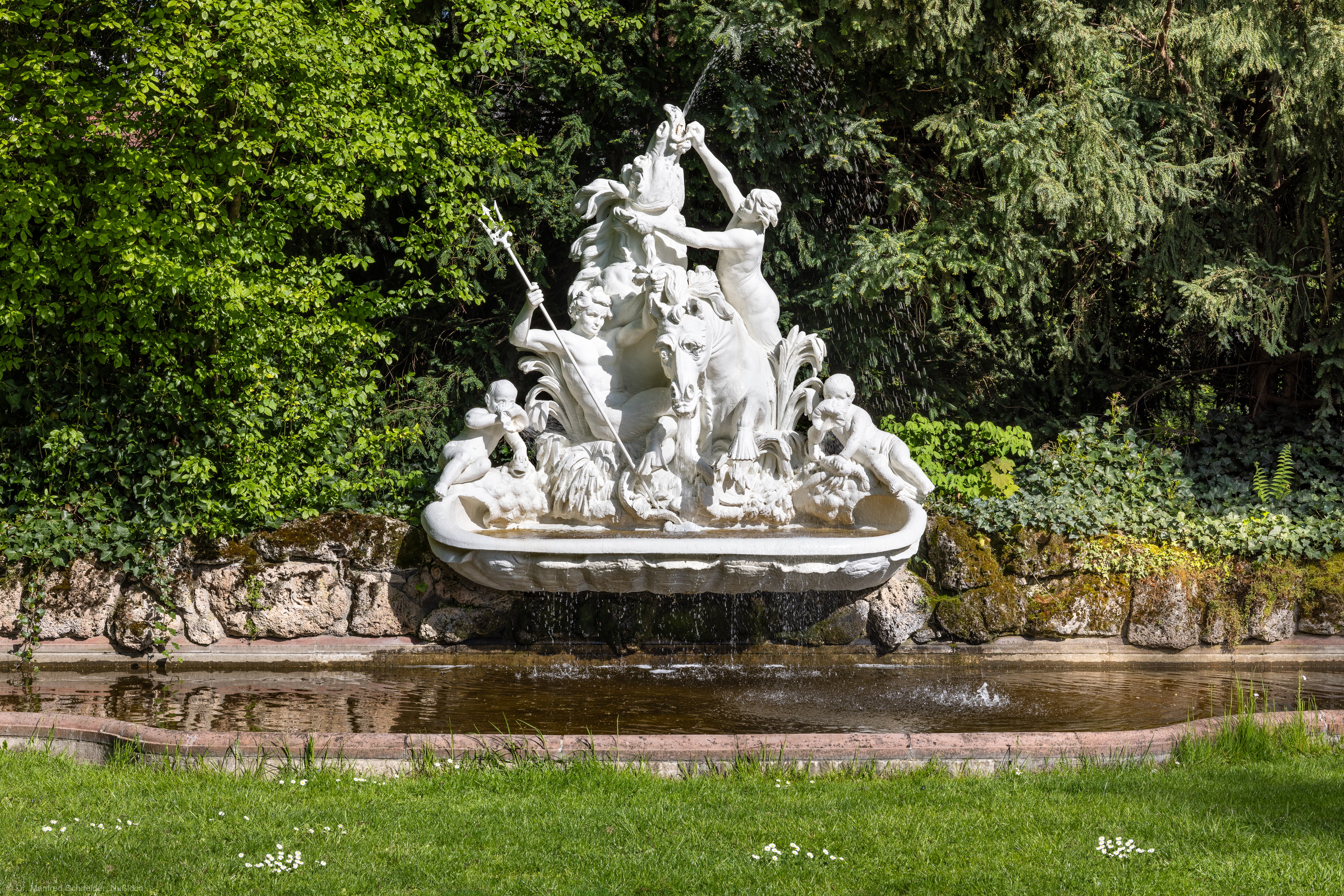 Schloss und Schlossgarten Schwetzingen - Garten - Seepferdgarten - Seepferdgruppe - Von Nordwest - Blick auf die Seepferdgruppe; Tritonen (Wasserwesen der griechischen Sage, je zur Hälfte bestehend aus einem menschlichen Oberkörper und fischartigem Unterkörper mit Schwanzflosse) bekämpfen zwei wilde Wasserrösser (Bildhauer: Gabriel Grupello (1644-1730) zugeschrieben; Datierung: 1709 bis 1716; Versetzung um 1824 in den Westflügel des Karlsruher Schlossgartens; 1994 in Karlsruhe abgebaut, 1996 durch Kopie aus Epoxidharz ersetzt; Original heute im Südlichen Zirkel ausgestellt; zweite Kopie ebenso 1996 am Originalstandort im Seepferdgarten aufgestellt) (aufgenommen im Mai 2023, am späten Nachmittag)