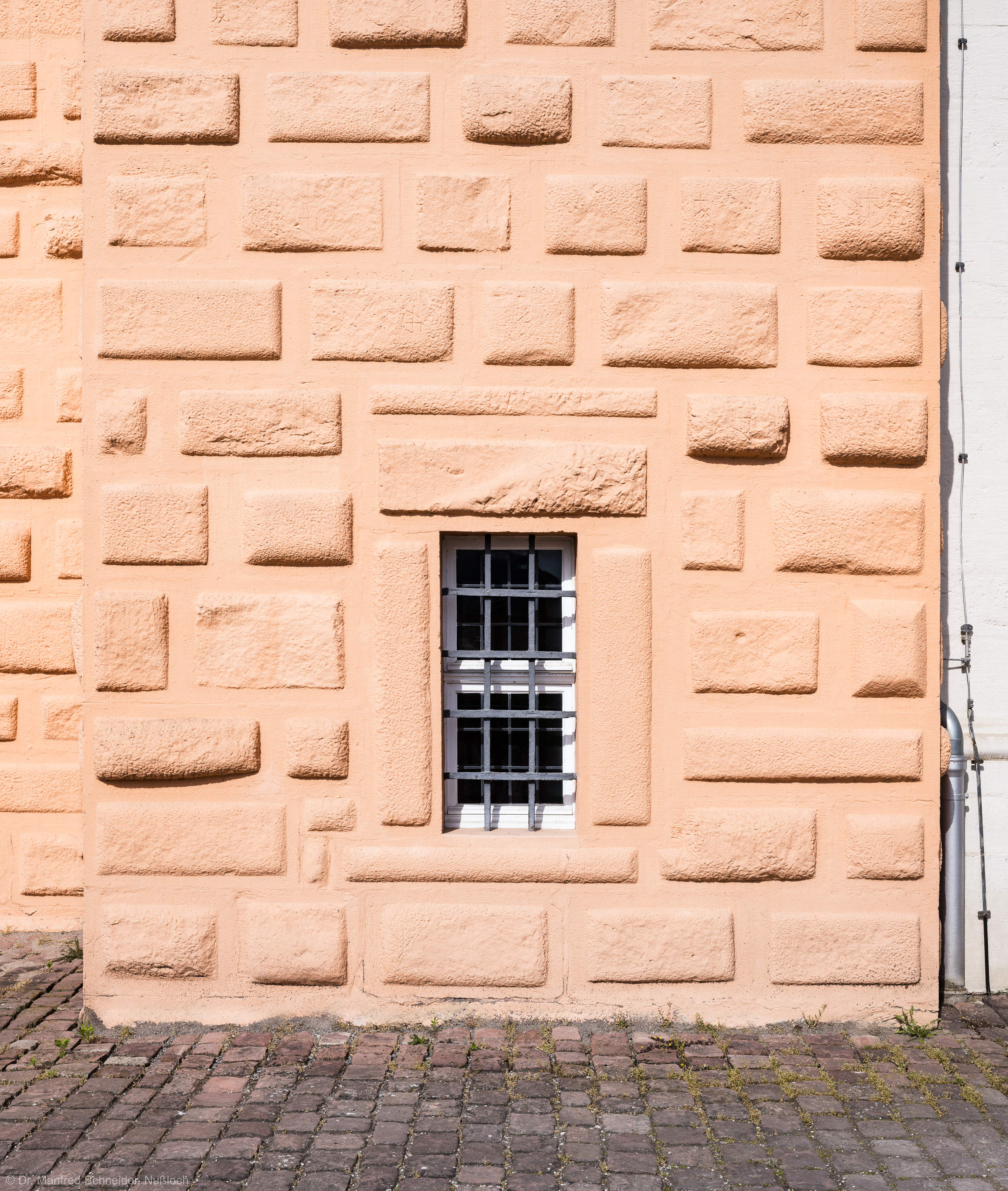 Schloss und Schlossgarten Schwetzingen - Schloss - Mittelbau - Hofseite - Nordturm - Von Osten - Blick auf Quader des Nordturms und auf eine Lichtöffnung für die (ehemals) dahinter liegende Kemenate (heute: Besucherzentrum) (Mittelbau: Länge Westseite ca. 45 Meter, Breite Süd-/Nordseite ca. 38 Meter; Wiederaufbau / Erweiterung: 1698-1717; Architekten: Johann Adam Breunig) (aufgenommen im Mai 2023, am Vormittag)