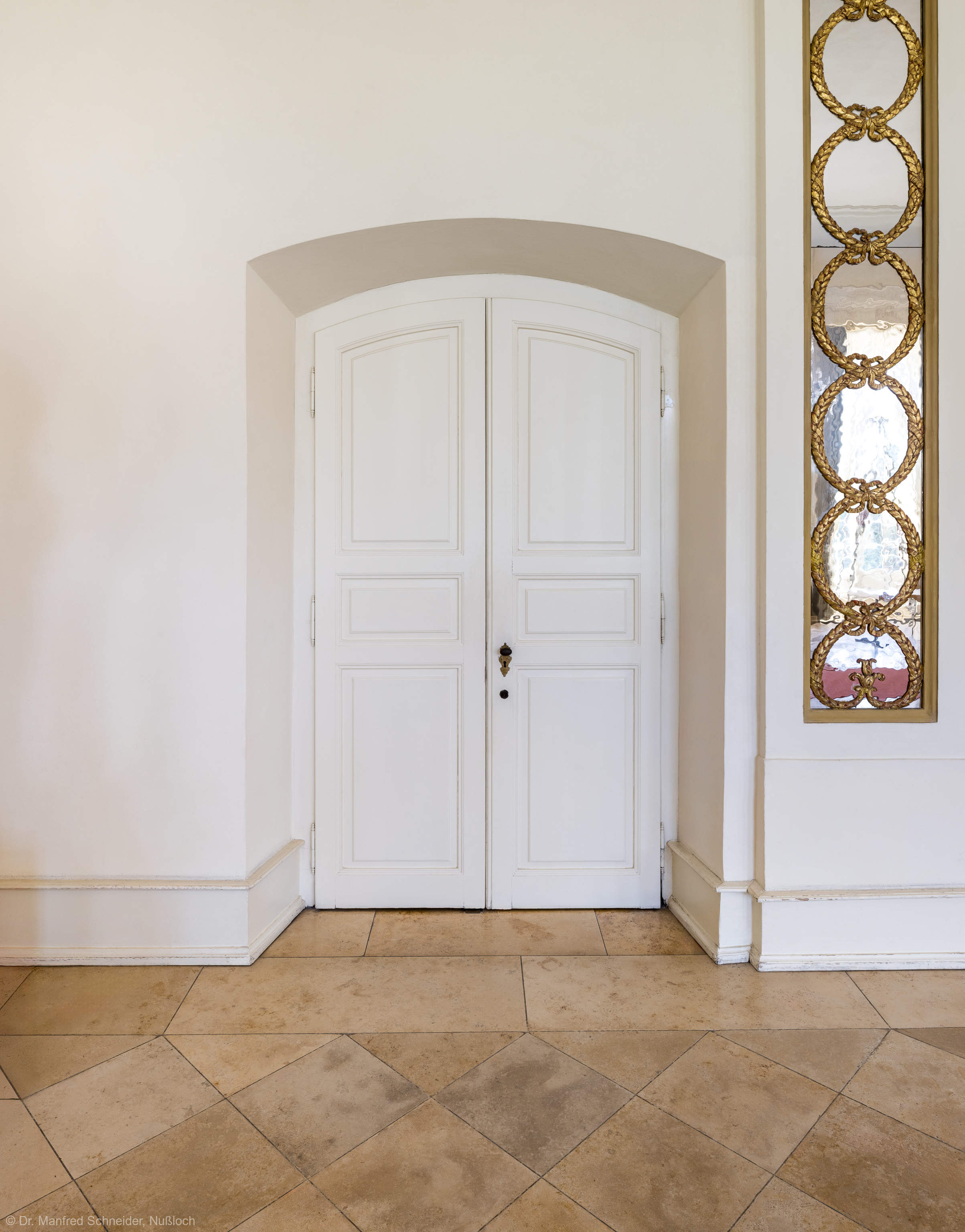 Schloss und Schlossgarten Schwetzingen - Garten - Nördlicher Zirkelbau - Westlicher Pavillon / Foyer des Schlosstheaters - Von innen - Nordwand, Mitte - Von Südwest - Blick auf die Eingangstür zum südlichen Foyer im Erdgeschoss des Schlosstheaters (Gesamter Bau: Länge Bogen ca. 175 Meter, Breite zwischen ca. 11 und 18 Meter, 51 Achsen, 5 Pavillons, 4 Zwischenbauten; Architekt: Alessandro Alessandro Galli da Bibiena (1686-1748), Bauleitung: zuerst Guillaume d’Hauberat (1680–1749), dann Nicolas de Pigage (1723-1796); Bauzeit: 1748-1750) (aufgenommen im September 2025, am späten Vormittag)