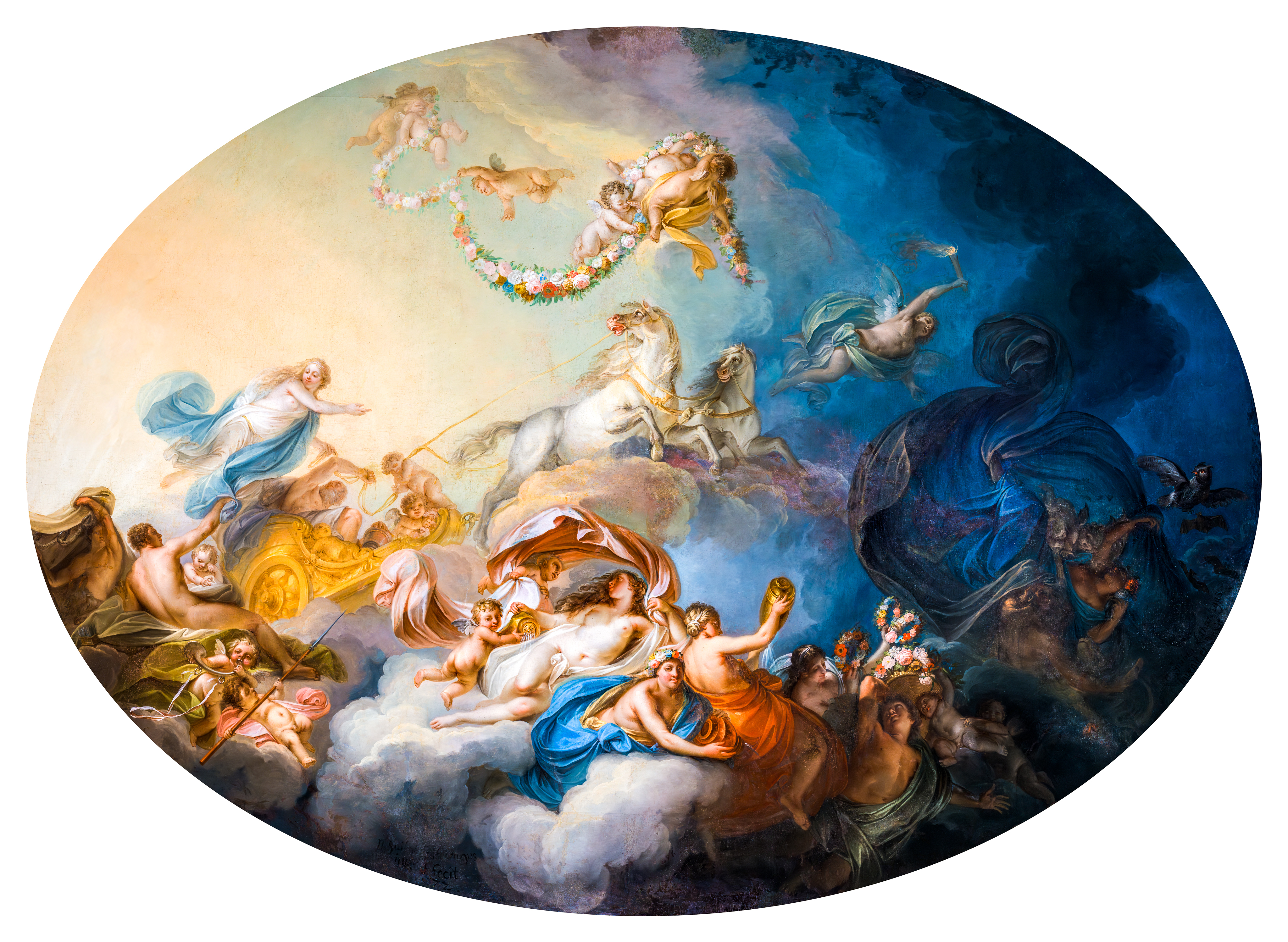 Schloss und Schlossgarten Schwetzingen - Garten - Badhaus - Von innen - Ovalsaal - Deckengemälde - Von unten - Deckengemälde "Aurora vertreibt die Nacht"; links Aurora (Göttin der Morgenröte, mit blauem Mantel, auf goldenem Wagen, von zwei weißen Sonnenpferden gezogen), darüber schwebende Putti mit Rosenkränzen, links unten Uranus (Gott des Himmels und Urahn der Götter, versucht Aurora zurück zu halten), links ganz unten zwei spielende Putti mit Jagdhorn, unterhalb Bildmitte Tauschwestern (auf Wolkenbank, aus goldenen Gefäßen den Tau spendend), rechts etwas oberhalb der Bildmitte der Morgenstern (mit Fackel, Aurora den Weg zeigend), ganz rechts eine Eule (als Nachtvogel, den Weg zeigend) (Maler: Nicolas Guibal (1725-1784); Datierung: 1772; Signaturen: links unten "N. Guibal Lotharingus inv et fecit 1772" und rechts unten "N. Guibal Lotharingus invenit et pinxit 1772"; Öl auf Leinwand, mit vergoldeten Eichenlaubkranz eingefasst; Restaurierungen: 1890, 1949, 2006) (Gesamter Bau: Länge x Breite ca. 18 x 15 Meter, Höhe ca. 11 Meter; Architekt: Nicolas de Pigage (1723-1796); Bauzeit: 1768-1772; Gesamtinstandsetzung innen und außen: 1999-2006) (aufgenommen im Oktober 2025, am Nachmittag)