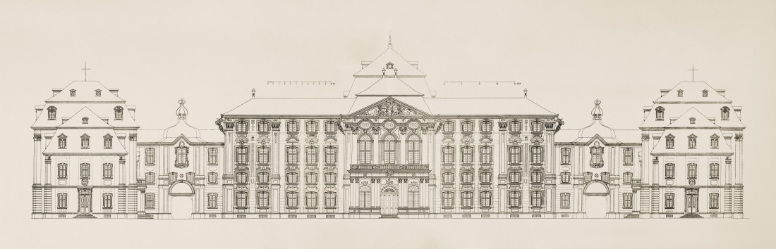 Aufriss-, Grundriss- und Querschnittspläne des Hauptbaus, der Verbindungsbauten, des Kirchenflügels und des Kammerflügels von Schloss Bruchsal. Klicken bzw. tippen Sie auf ein Vorschaubild, um den Riss groß zu sehen.