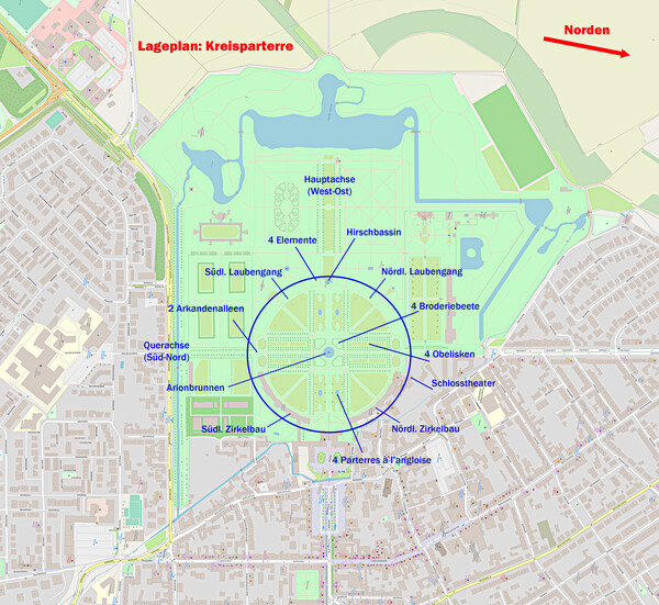 Schloss und Schlossgarten Schwetzingen - Garten - Kreisparterre - Südliche Arkadenallee - Ostseite - Von Osten - Blick auf die beiden ovalen Rasenfelder (aufgenommen im Mai 2023, am Nachmittag)