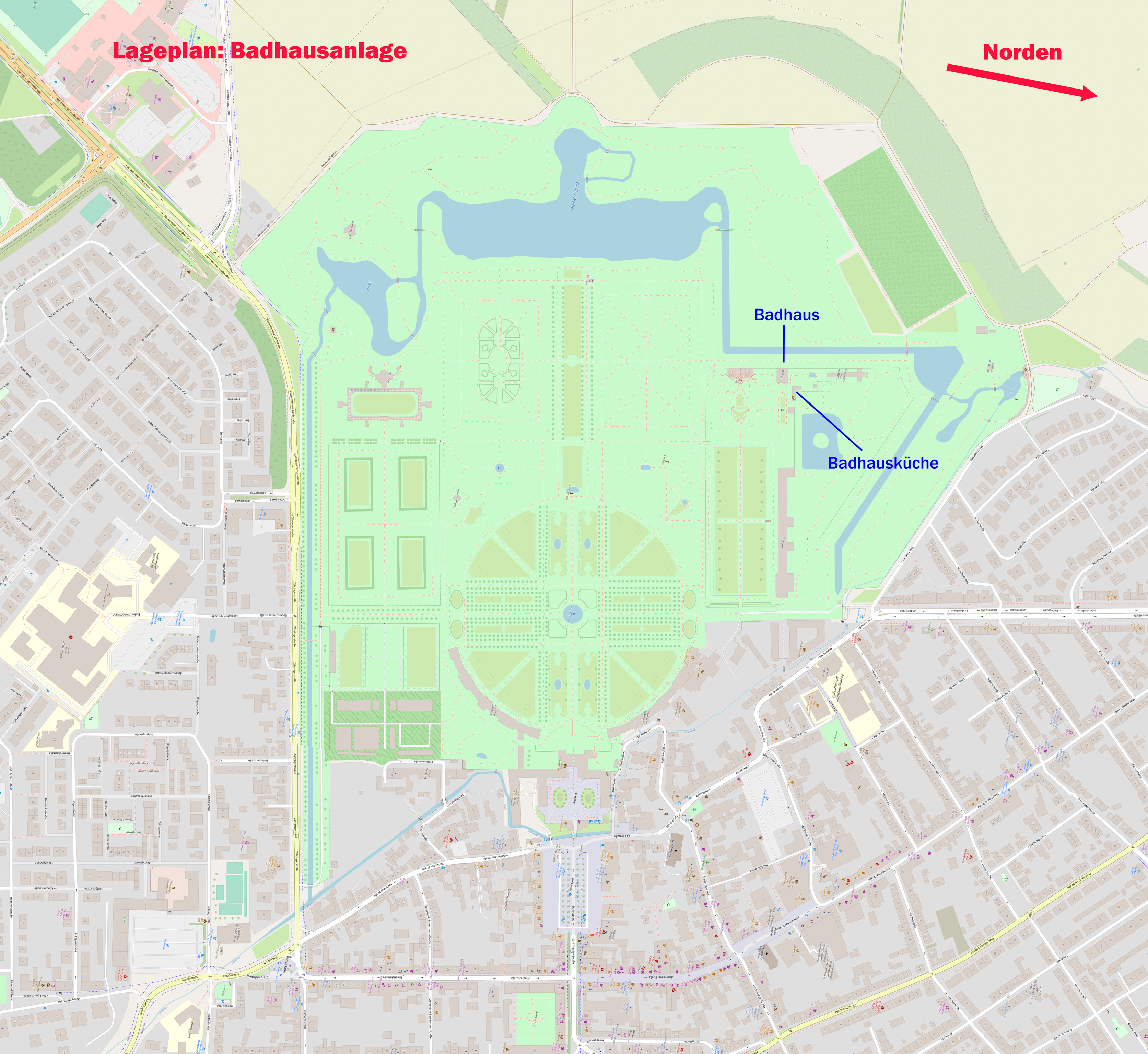 Schloss und Schlossgarten Schwetzingen - Umgebung des Badhauses in Schwetzingen (Bildnachweis: Tafel 49 aus "Max Schmechel: Nicolaus von Pigage’s Schwetzinger Entwürfe und Bauten - Dissertation – 1923"; Reproduktion durch Dr. Manfred Schneider, August 2023)