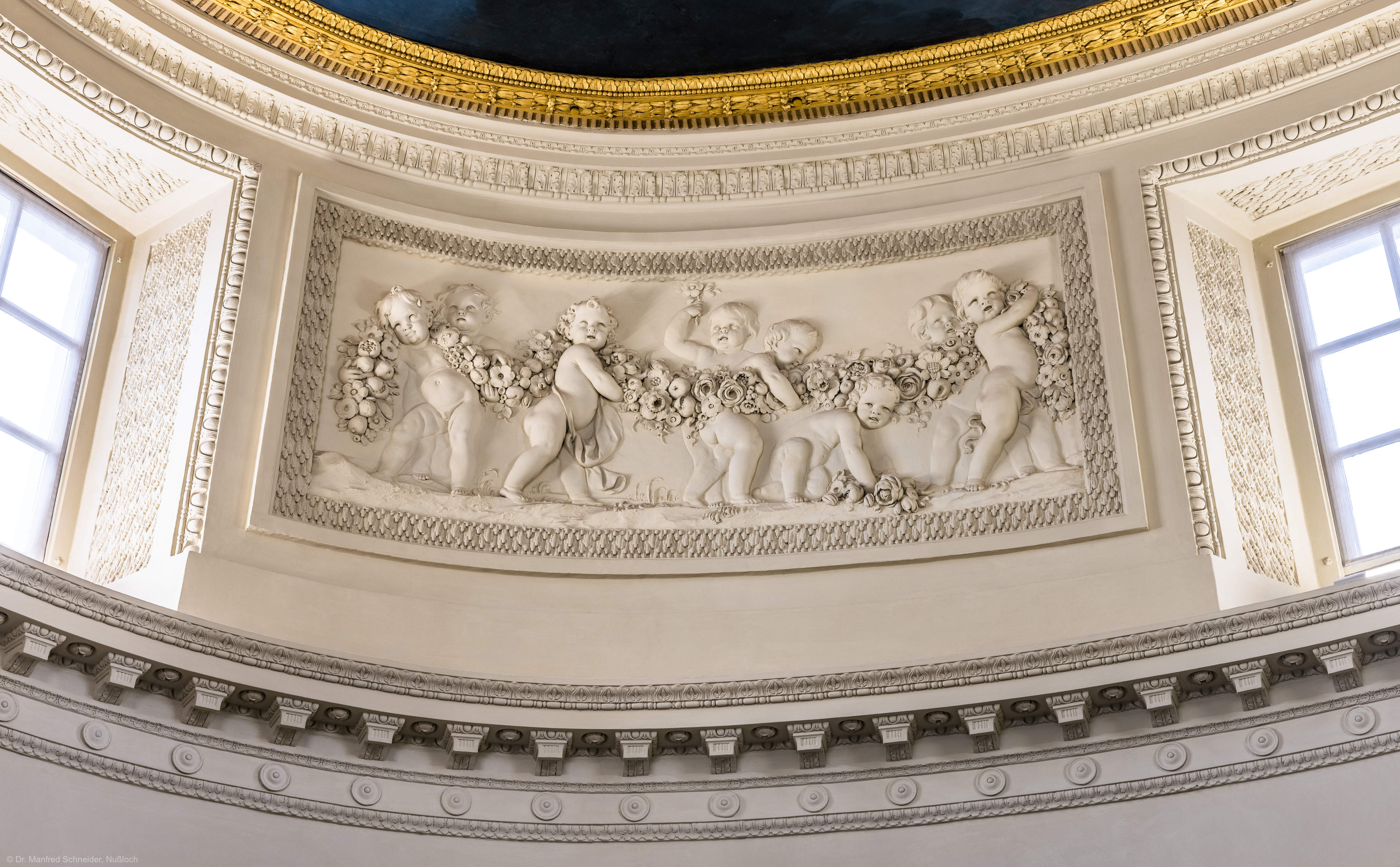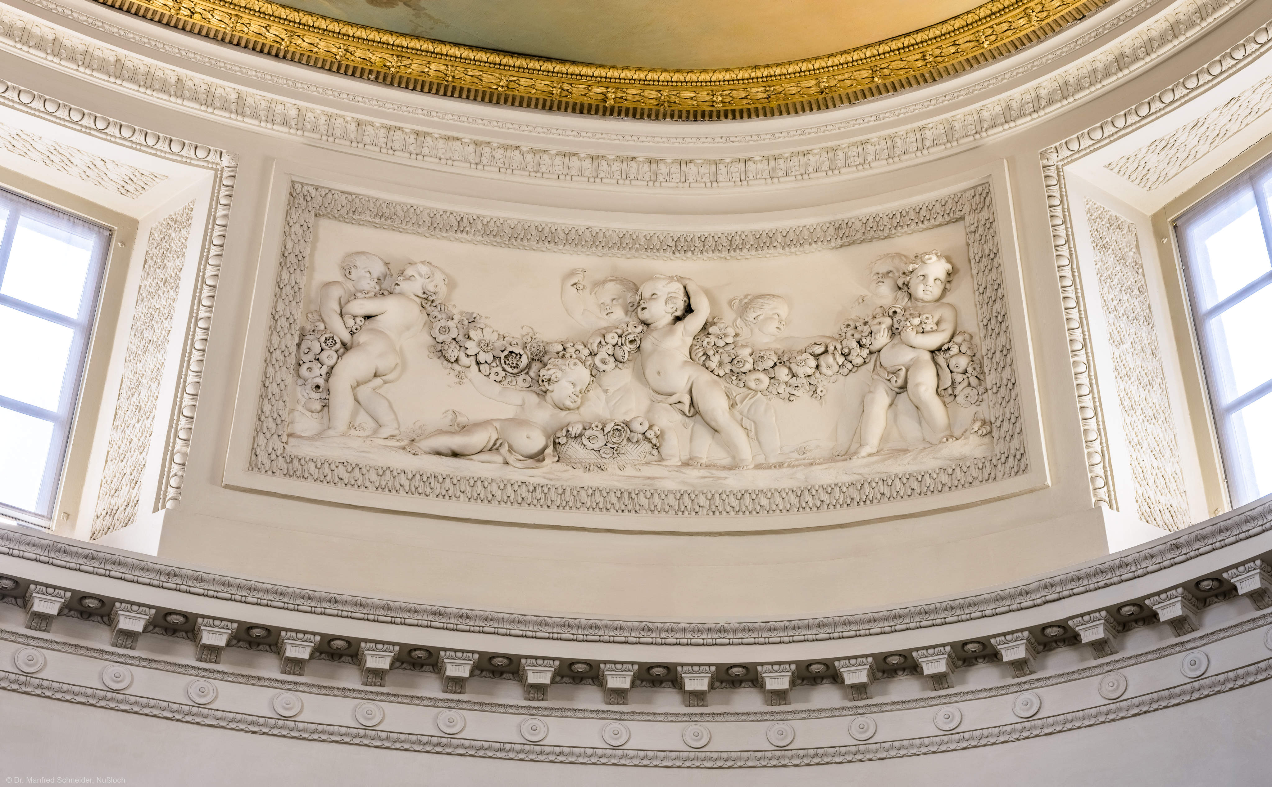 Schloss und Schlossgarten Schwetzingen - Garten - Badhaus - Von innen - Ovalsaal - Puttenfriese - Von Südost - Nordwestliches Feld im Tambour: acht spielende Putti, verbunden durch eine Blumen- und Fruchtgirlande, eingebettet in ein Feld mit Tropfenstuck, umgeben von einem glatten Rahmen (Stuckateur: Giuseppe Antonio Pozzi (1732–1811)) (Gesamter Bau: Länge x Breite ca. 18 x 14 Meter, Höhe ca. 10 Meter; Architekt: Nicolas de Pigage (1723-1796); Bauzeit: 1768-1772; Gesamtinstandsetzung innen und außen: 1999-2006) (aufgenommen im Oktober 2025, am frühen Nachmittag)
