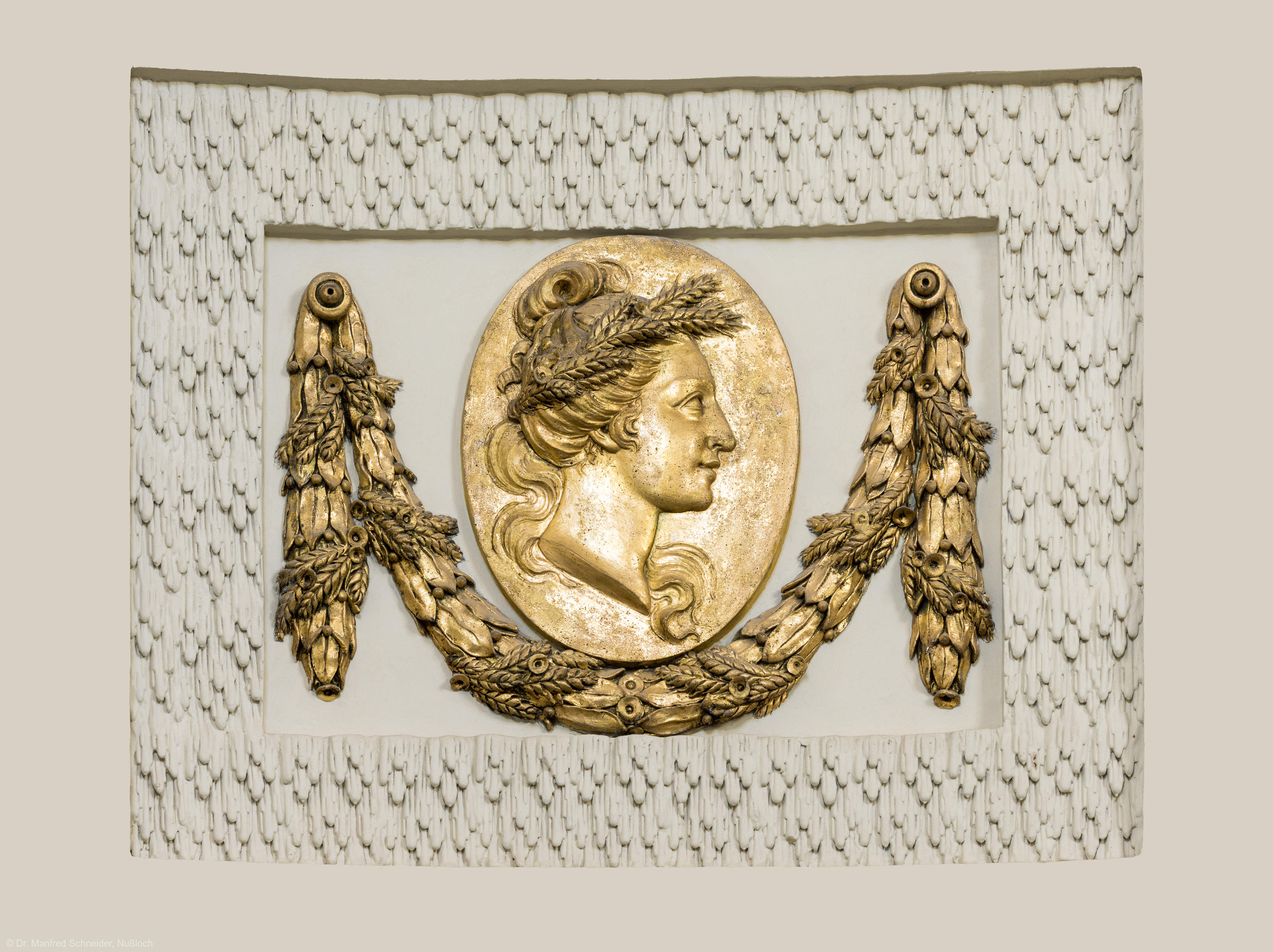 Schloss und Schlossgarten Schwetzingen - Garten - Badhaus - Von innen - Ovalsaal - Vier Jahreszeiten - Von Nordwest - Frauenkopf im Profil, durch Attribute als Personifikation der Jahreszeit "Sommer" erkennbar; Ausschnitt aus dem südöstliches Feld mit einem ovalen, bronzierten Medaillon, umfangen von einer Lorbeergirlande, beide umgeben von Tropfenstuck (Bildhauer: Giuseppe Antonio Pozzi (1732–1811) zugeschrieben) (Gesamter Bau: Länge x Breite ca. 18 x 14 Meter, Höhe ca. 10 Meter; Architekt: Nicolas de Pigage (1723-1796); Bauzeit: 1768-1772; Gesamtinstandsetzung innen und außen: 1999-2006) (aufgenommen im Oktober 2025, am Nachmittag)