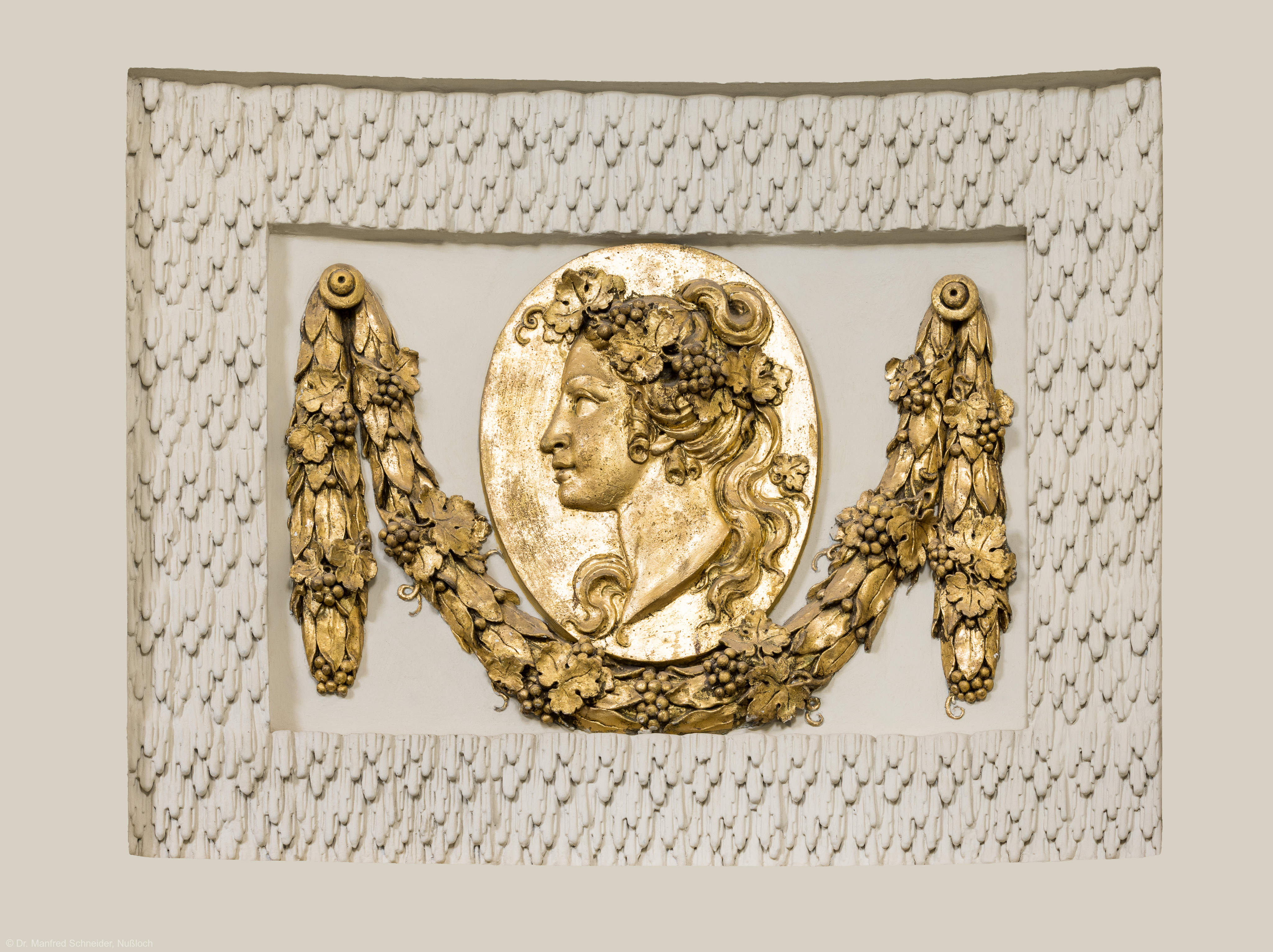 Schloss und Schlossgarten Schwetzingen - Garten - Badhaus - Von innen - Ovalsaal - Vier Jahreszeiten - Von Südwest - Nordöstliches Feld mit einem ovalen, bronzierten Medaillon, umfangen von einer Lorbeergirlande, beide umgeben von Tropfenstuck; dargestellt ist ein Frauenkopf im Profil, durch Attribute als Personifikation der Jahreszeit "Herbst" erkennbar (Bildhauer: Giuseppe Antonio Pozzi (1732–1811) zugeschrieben) (Gesamter Bau: Länge x Breite ca. 18 x 14 Meter, Höhe ca. 10 Meter; Architekt: Nicolas de Pigage (1723-1796); Bauzeit: 1768-1772; Gesamtinstandsetzung innen und außen: 1999-2006) (aufgenommen im Oktober 2025, am Nachmittag)