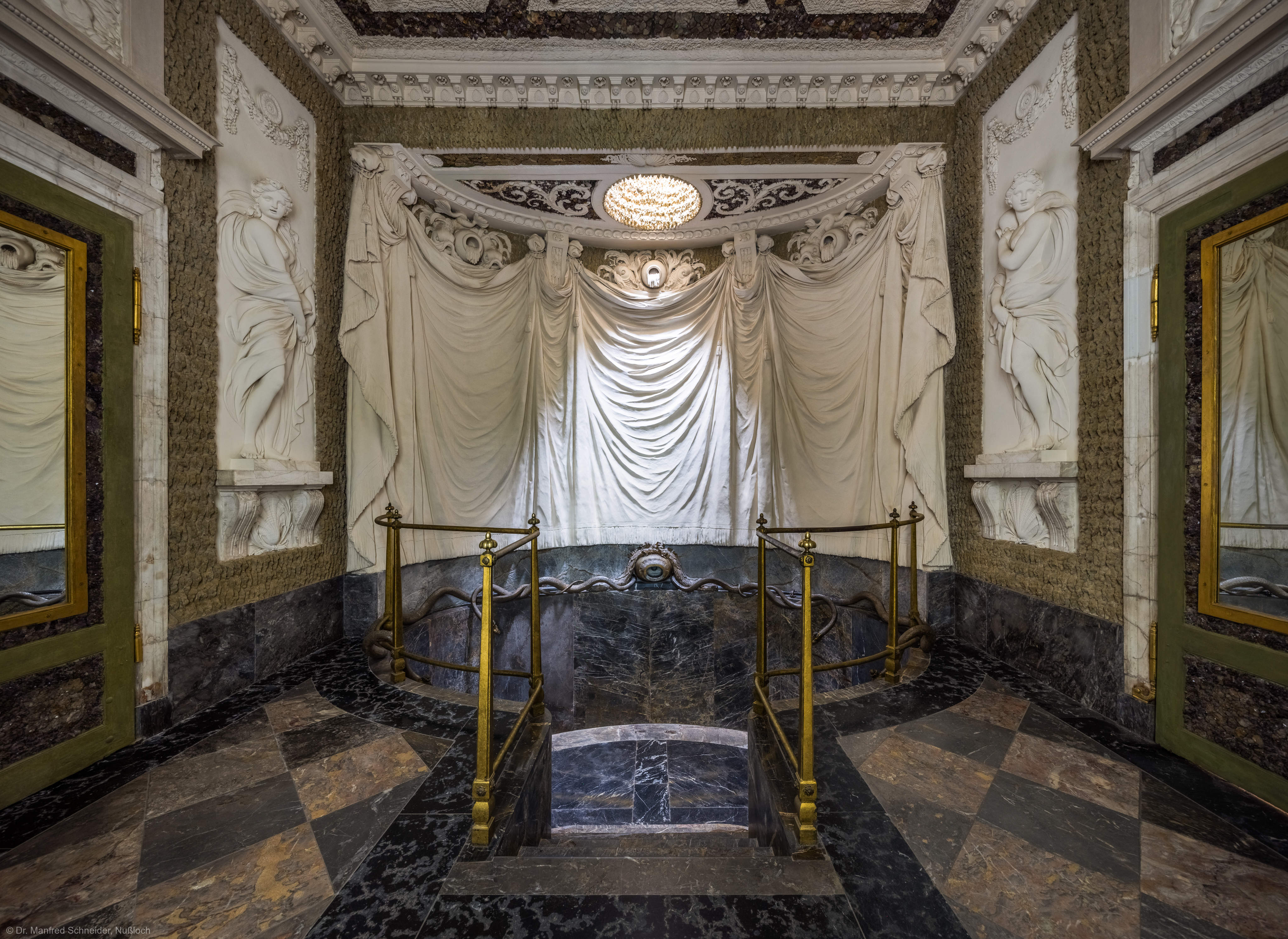 Schloss und Schlossgarten Schwetzingen - Garten - Badhaus - Von innen - Baderaum - Von Westen - Blick nach Osten in das Badezimmer, als Grotte gestaltet; unten in der Mitte sieben Stufen, das ovale Wasserbecken, eingefasst von einem Metallgitter, darüber Wasserspender (zentrale Messingurne und metallene Schlangen), darüber ein großer Stuckvorhang, darüber eine runde Öffnung zur Beleuchtung und Belüftung, ganz links eine Tür nach außen, ganz rechts eine Tür zum westlichen Vorzimmer, links und rechts zwei (von sechs) Wandfelder mit Reliefdarstellungen von Najaden (Nymphen der griechischen Mythologie) (Stuckateur: Giuseppe Antonio Pozzi (1732–1811)) (Gesamter Bau: Länge x Breite ca. 18 x 14 Meter, Höhe ca. 10 Meter; Architekt: Nicolas de Pigage (1723-1796); Bauzeit: 1768-1772; Gesamtinstandsetzung innen und außen: 1999-2006) (aufgenommen im Oktober 2025, am späten Nachmittag)