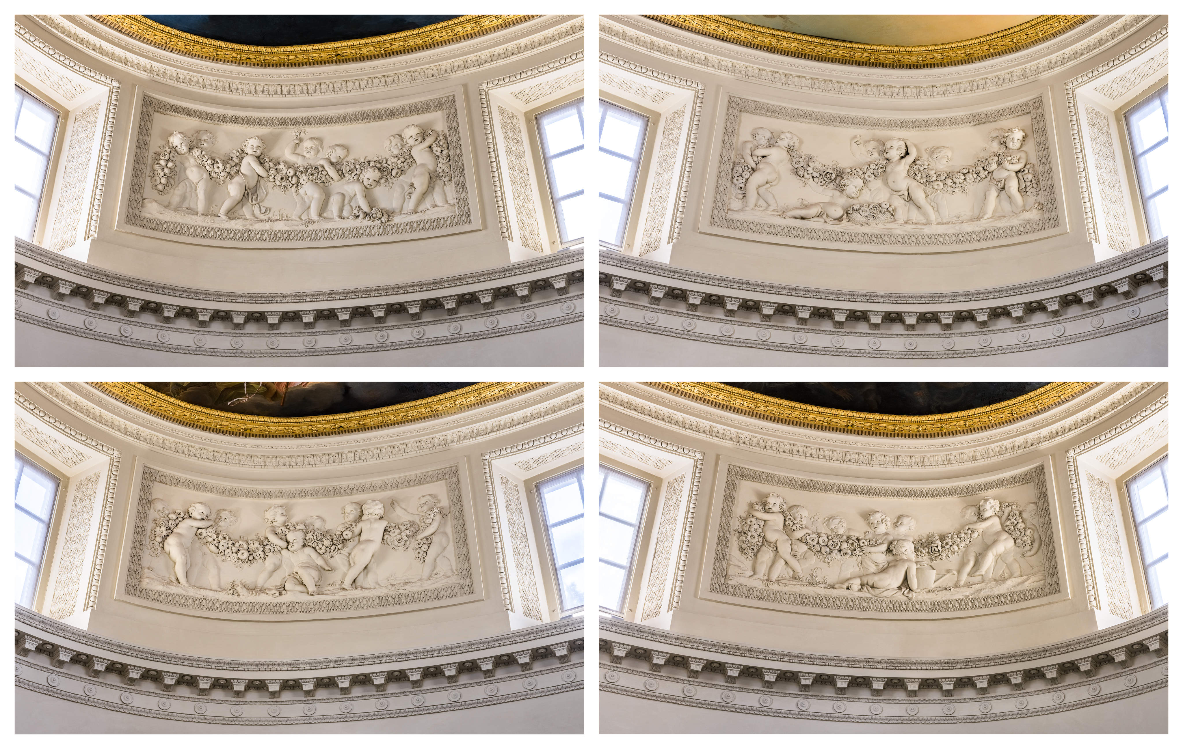 Schloss und Schlossgarten Schwetzingen - Garten - Badhaus - Von innen - Ovalsaal - Puttenfriese - Vier Felder im Tambour: spielende Putti, verbunden durch eine Blumen- und Fruchtgirlande, eingebettet in ein Feld mit Tropfenstuck, umgeben von einem glatten Rahmen; v.l.n.r., v.o.n.u.: nordwestliches, nordöstliches, südöstliches, südwestliches Feld (Stuckateur: Giuseppe Antonio Pozzi (1732–1811)) (Gesamter Bau: Länge x Breite ca. 18 x 14 Meter, Höhe ca. 10 Meter; Architekt: Nicolas de Pigage (1723-1796); Bauzeit: 1768-1772; Gesamtinstandsetzung innen und außen: 1999-2006) (aufgenommen im Oktober 2025, am Nachmittag)