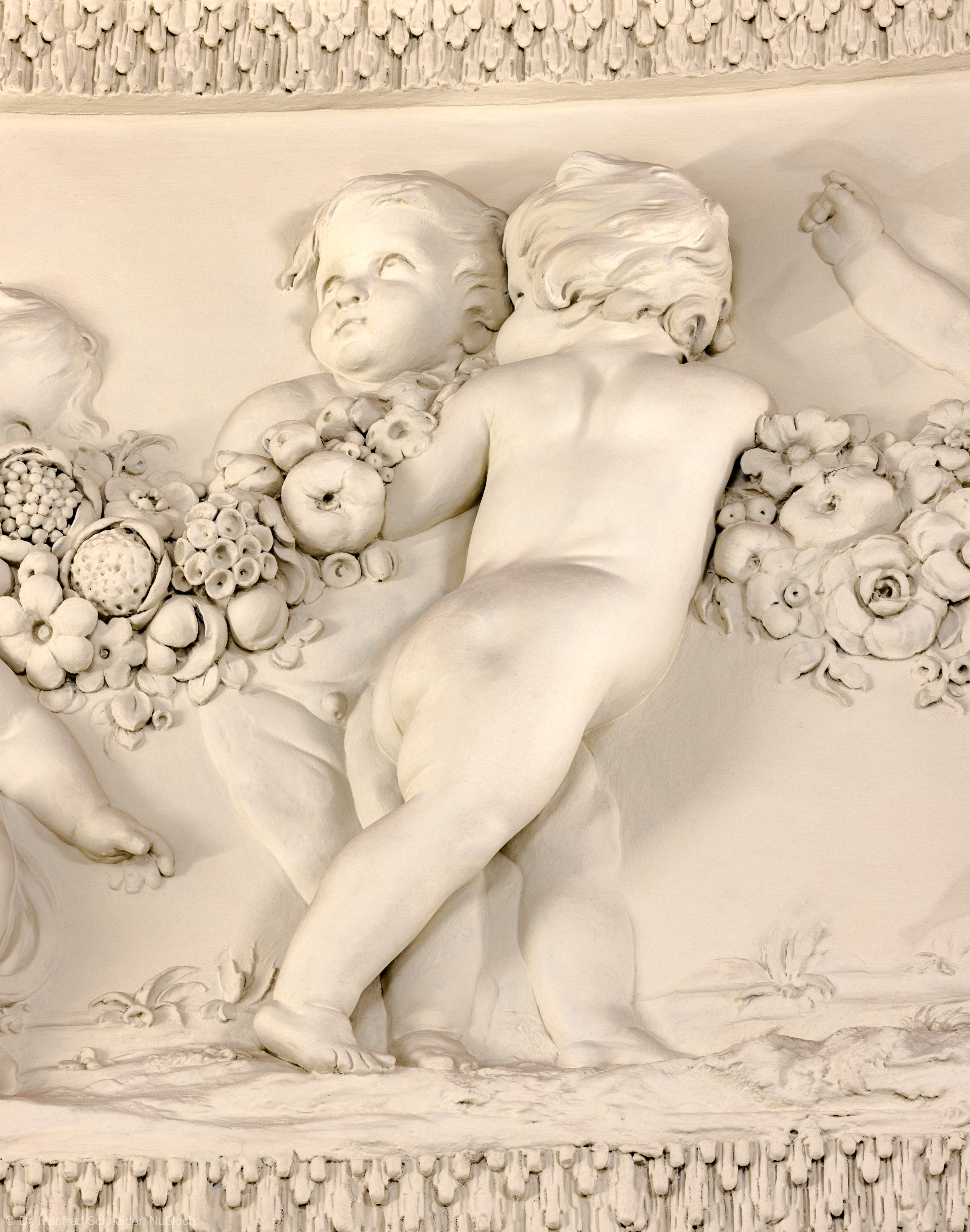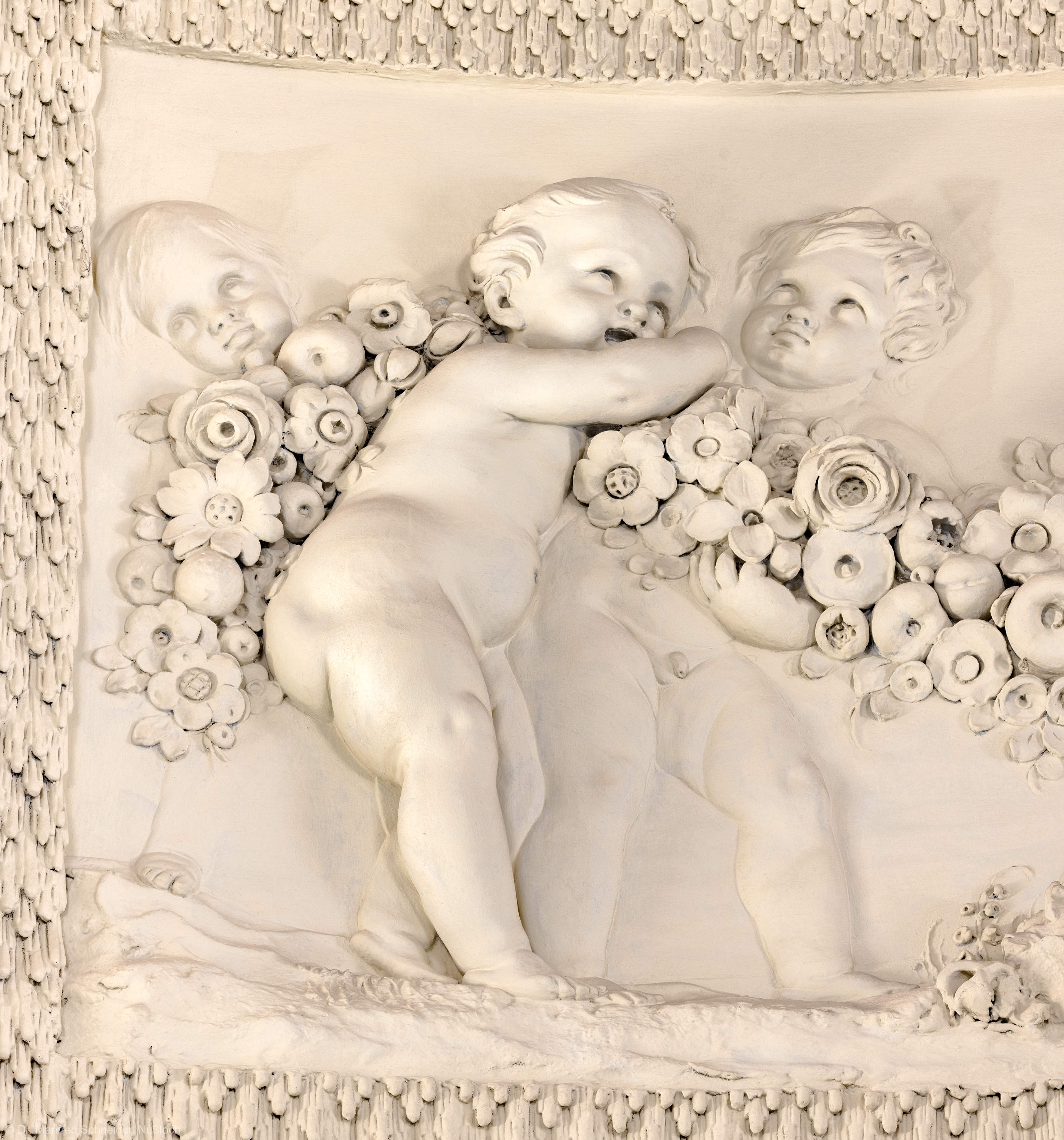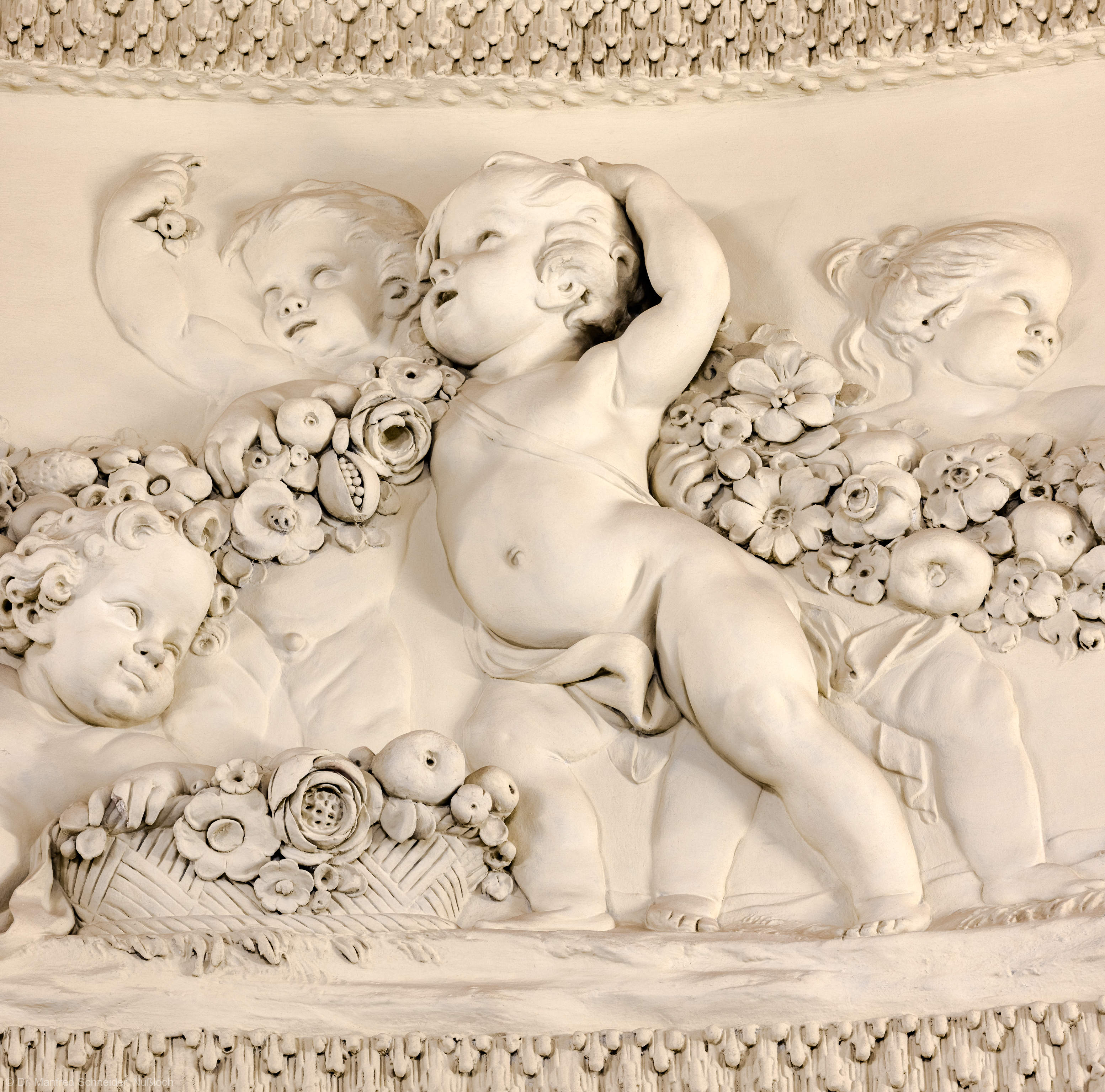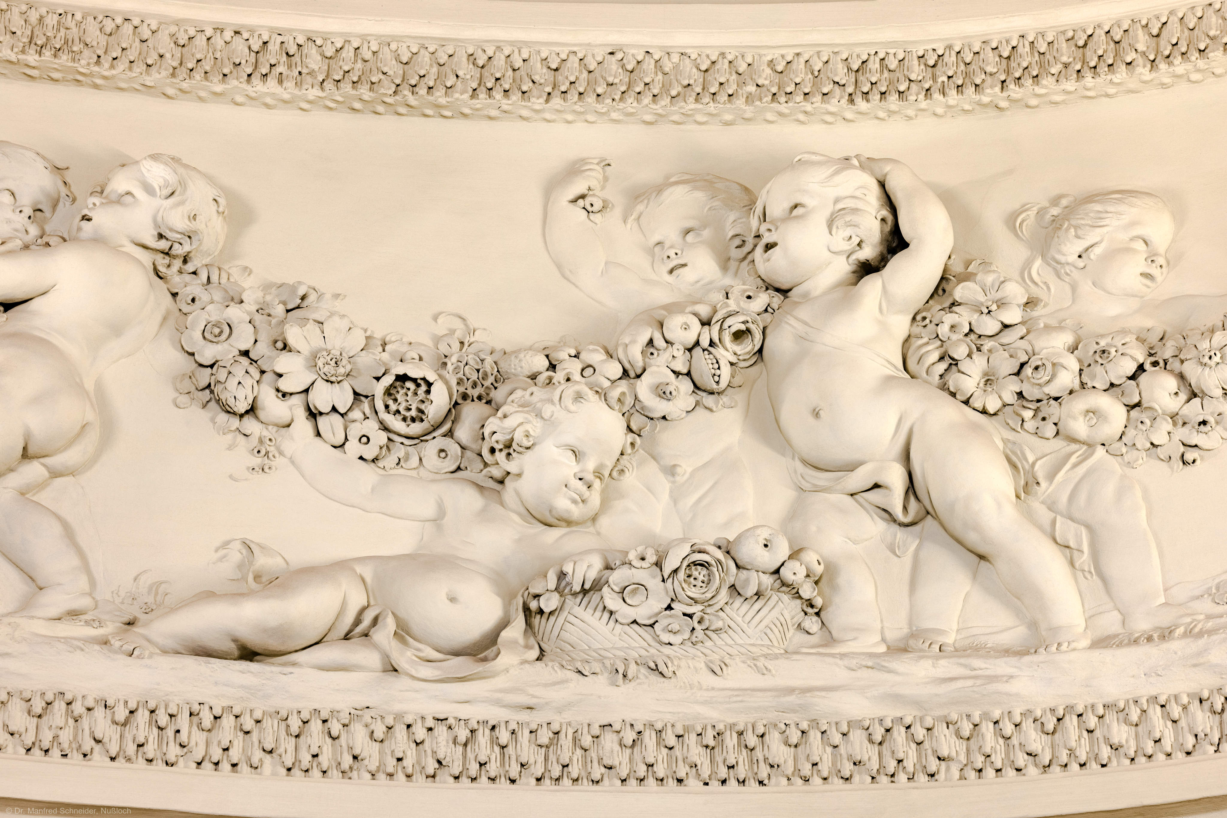 Schloss und Schlossgarten Schwetzingen - Garten - Badhaus - Von innen - Ovalsaal - Puttenfriese - Von Südwest - Ausschnitt aus dem nordöstliches Feld im Tambour: spielende Putti, verbunden durch eine Blumen- und Fruchtgirlande (Stuckateur: Giuseppe Antonio Pozzi (1732–1811)) (Gesamter Bau: Länge x Breite ca. 18 x 14 Meter, Höhe ca. 10 Meter; Architekt: Nicolas de Pigage (1723-1796); Bauzeit: 1768-1772; Gesamtinstandsetzung innen und außen: 1999-2006) (aufgenommen im Oktober 2025, am frühen Nachmittag)