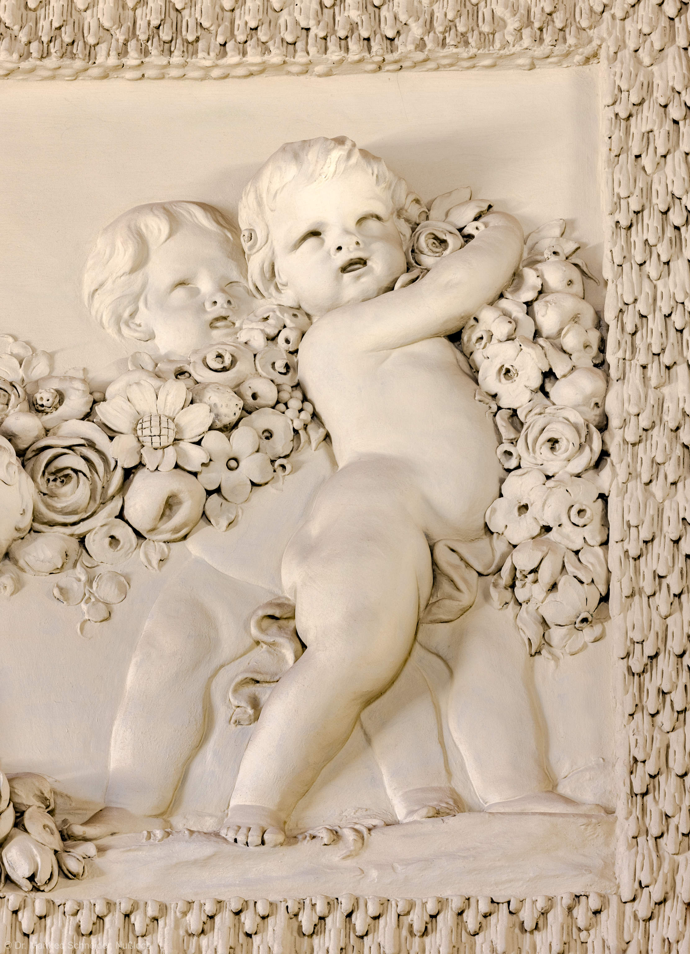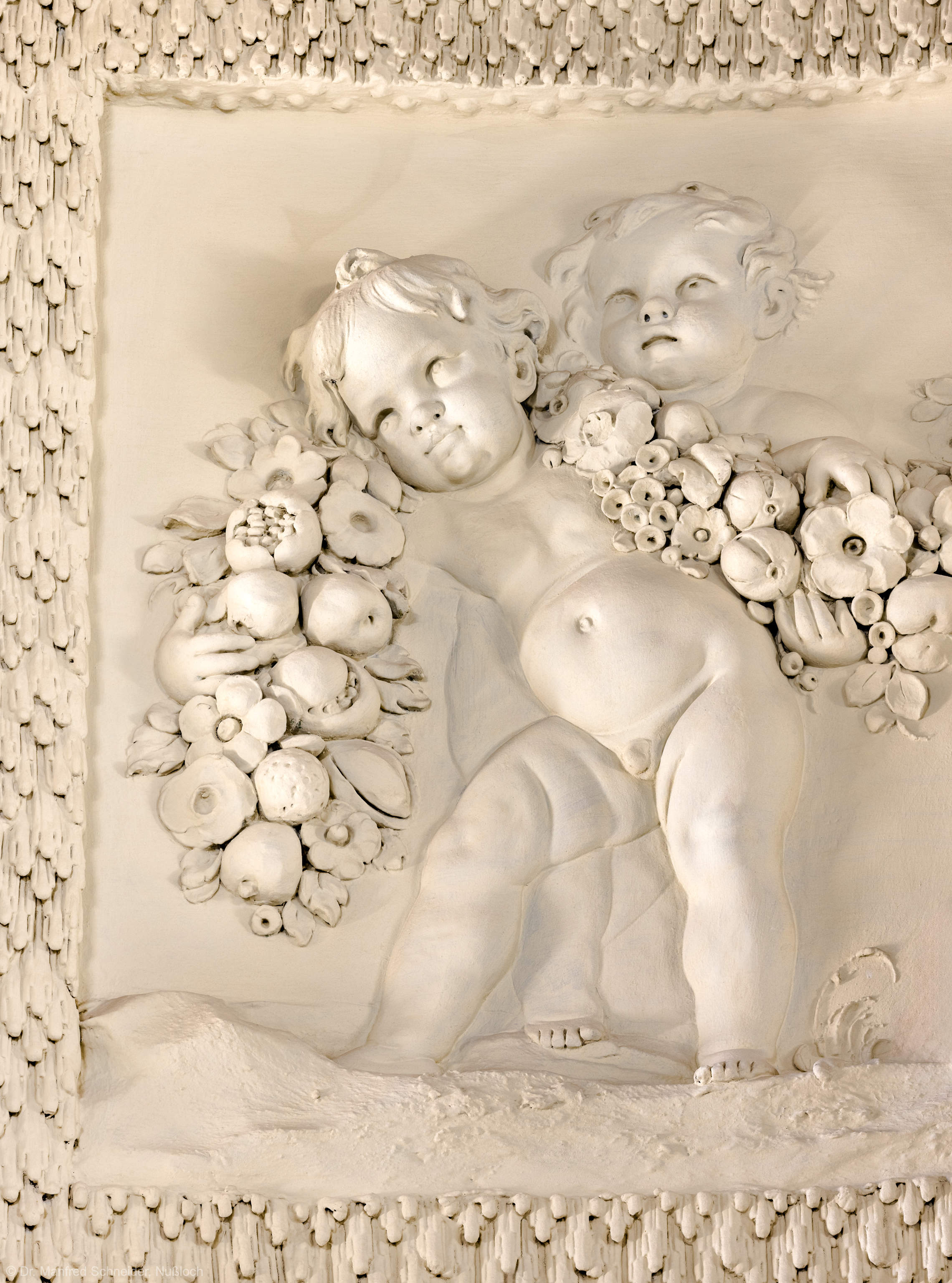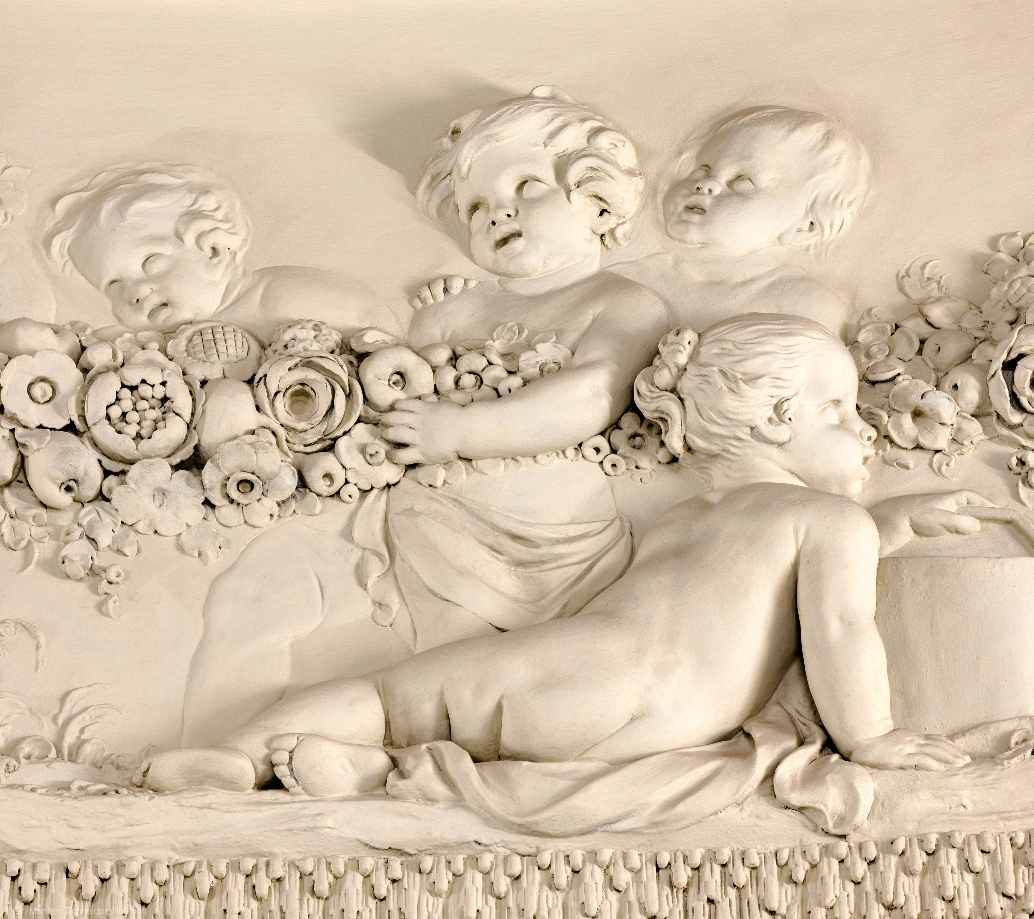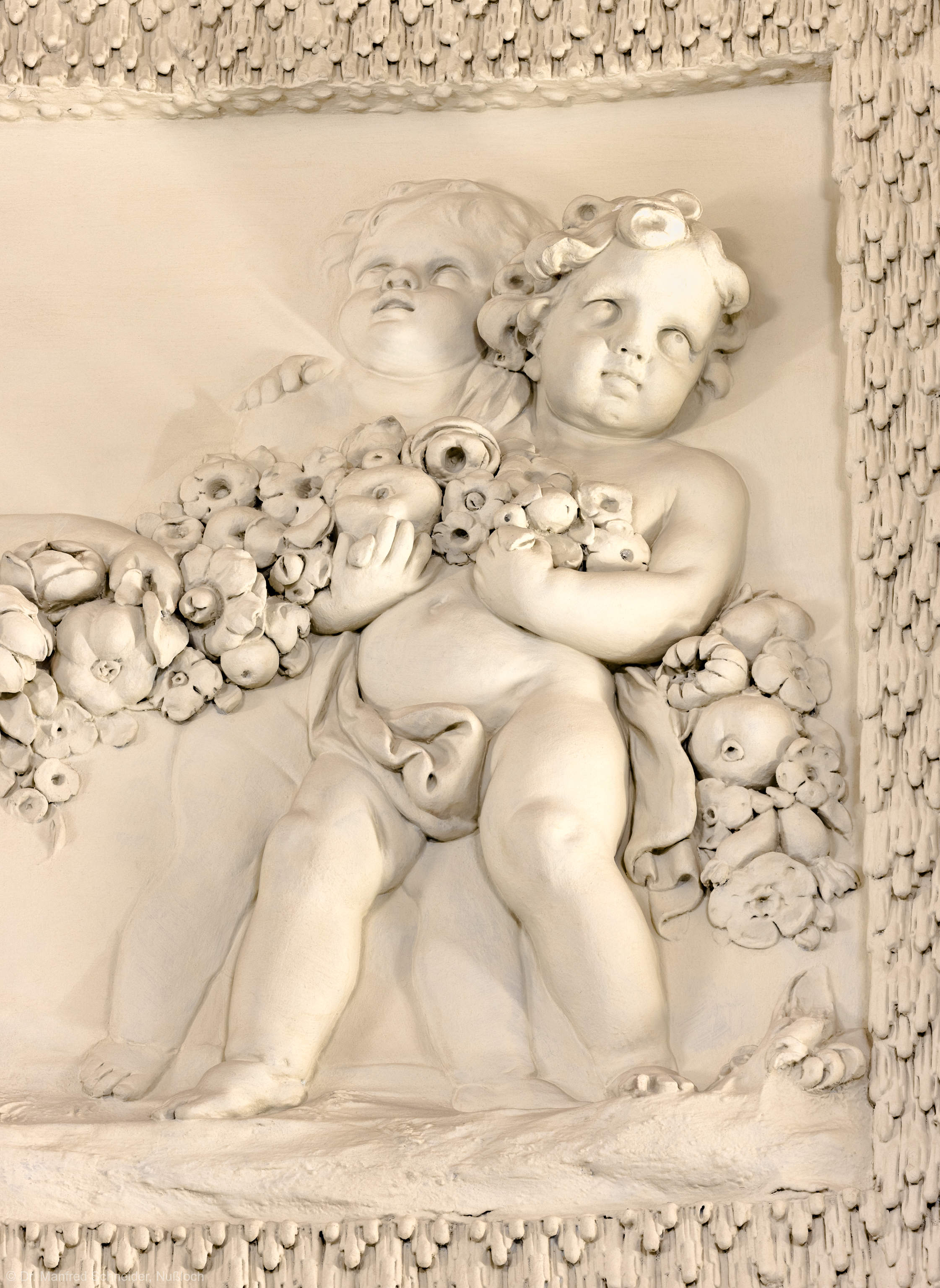 Schloss und Schlossgarten Schwetzingen - Garten - Badhaus - Von innen - Ovalsaal - Puttenfriese - Von Südwest - Ausschnitt aus dem nordöstliches Feld im Tambour: spielende Putti, verbunden durch eine Blumen- und Fruchtgirlande (Stuckateur: Giuseppe Antonio Pozzi (1732–1811)) (Gesamter Bau: Länge x Breite ca. 18 x 14 Meter, Höhe ca. 10 Meter; Architekt: Nicolas de Pigage (1723-1796); Bauzeit: 1768-1772; Gesamtinstandsetzung innen und außen: 1999-2006) (aufgenommen im Oktober 2025, am frühen Nachmittag)