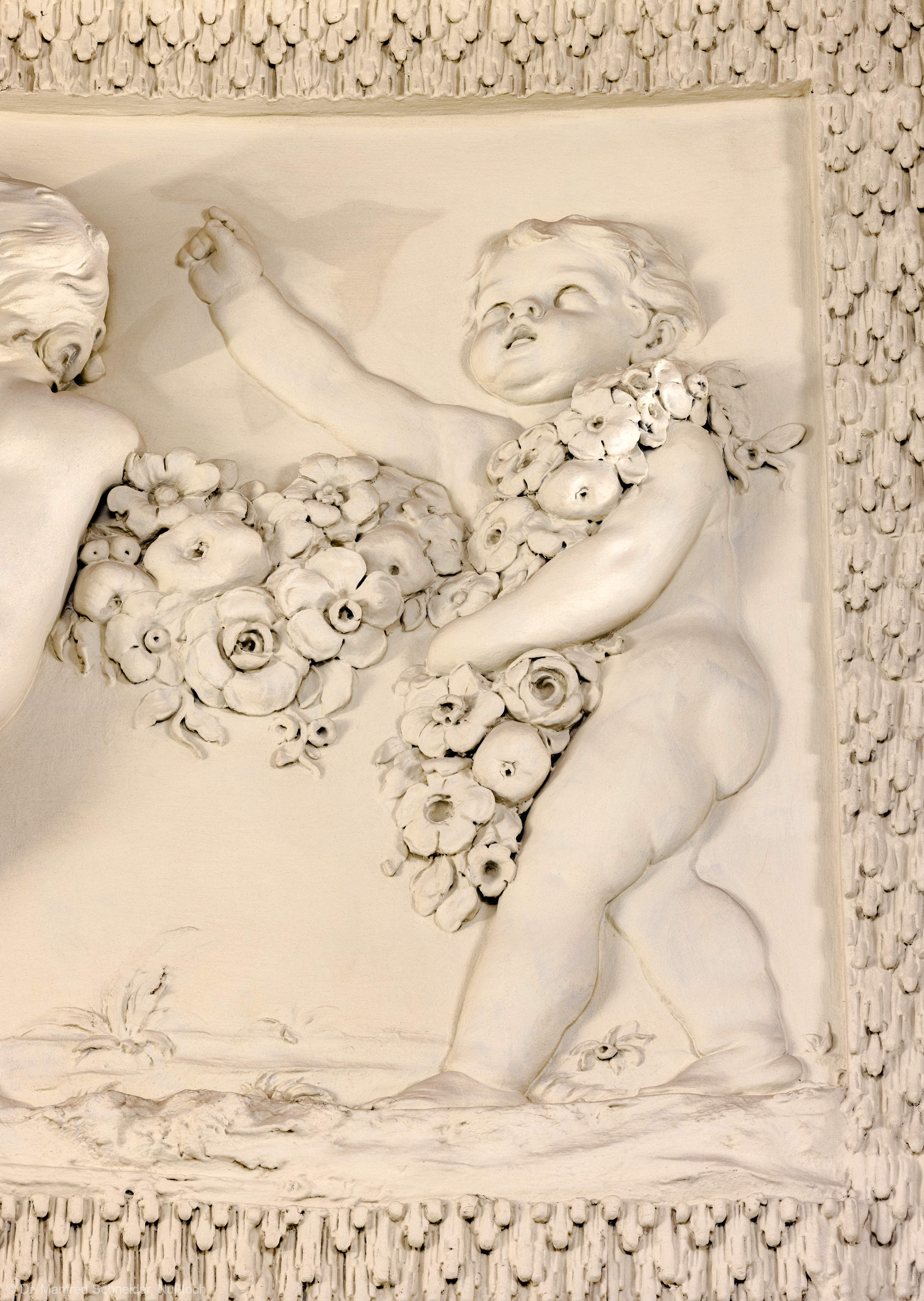 Schloss und Schlossgarten Schwetzingen - Garten - Badhaus - Von innen - Ovalsaal - Puttenfriese - Von Nordwest - Südöstliches Feld im Tambour: neun spielende Putti, verbunden durch eine Blumen- und Fruchtgirlande, eingebettet in ein Feld mit Tropfenstuck, umgeben von einem glatten Rahmen (Stuckateur: Giuseppe Antonio Pozzi (1732–1811)) (Gesamter Bau: Länge x Breite ca. 18 x 14 Meter, Höhe ca. 10 Meter; Architekt: Nicolas de Pigage (1723-1796); Bauzeit: 1768-1772; Gesamtinstandsetzung innen und außen: 1999-2006) (aufgenommen im Oktober 2025, am frühen Nachmittag)