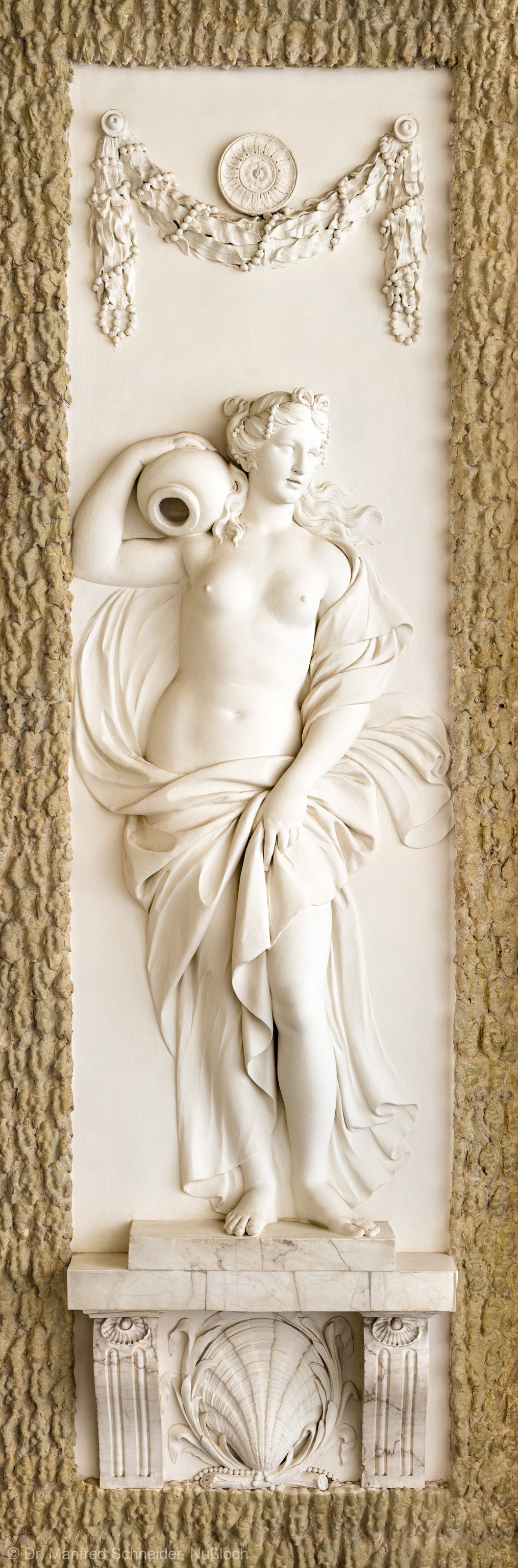 Schloss und Schlossgarten Schwetzingen - Garten - Badhaus - Von innen - Baderaum - Najaden - Westseite, links - Von Osten - Blick auf ein hochrechteckiges Feld mit Reliefdarstellung einer Najade (Nymphe in der griechischen Mythologie, wacht über Quellen, Bäche, Flüsse, Sümpfe, Teiche und Seen) (Stuckateur: Giuseppe Antonio Pozzi (1732–1811)) (Gesamter Bau: Länge x Breite ca. 18 x 14 Meter, Höhe ca. 10 Meter; Architekt: Nicolas de Pigage (1723-1796); Bauzeit: 1768-1772; Gesamtinstandsetzung innen und außen: 1999-2006) (aufgenommen im Oktober 2025, am späten Nachmittag)