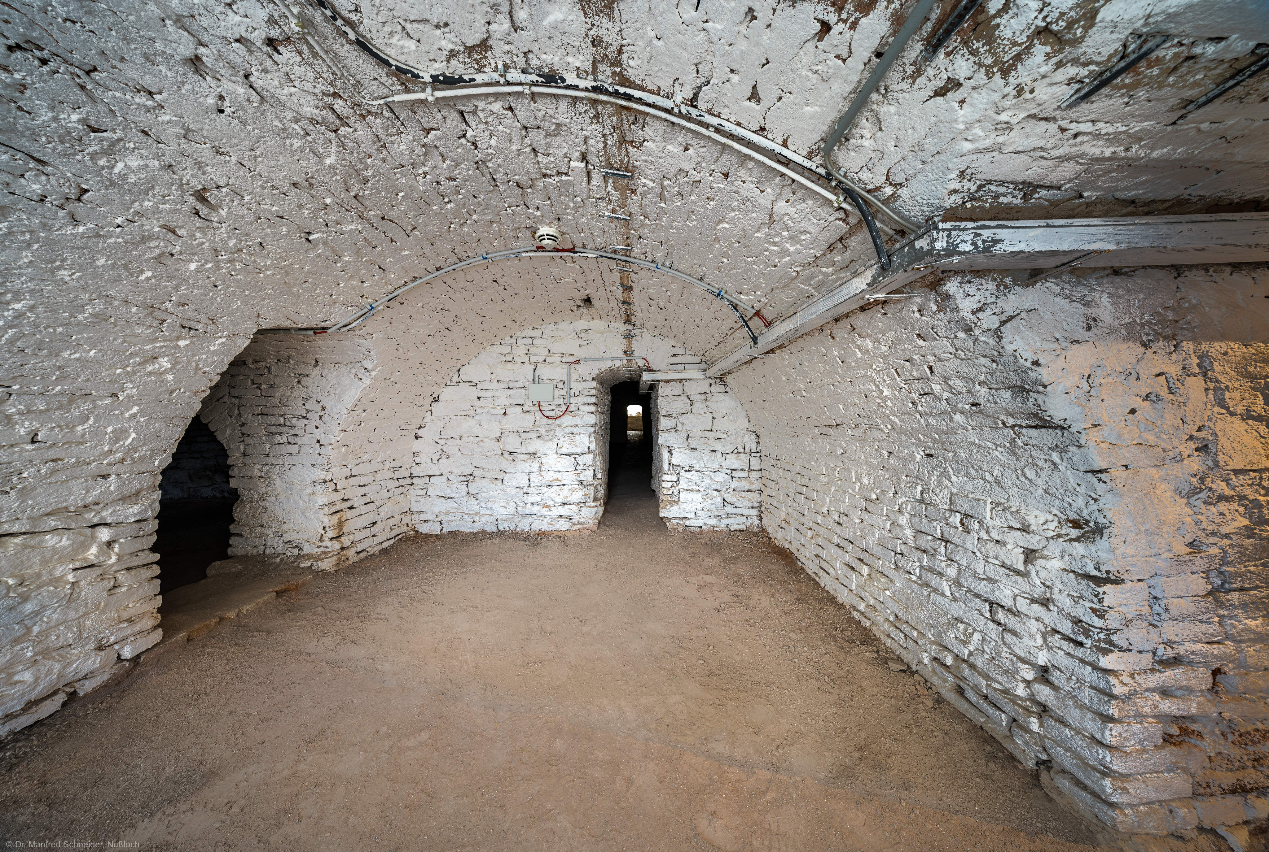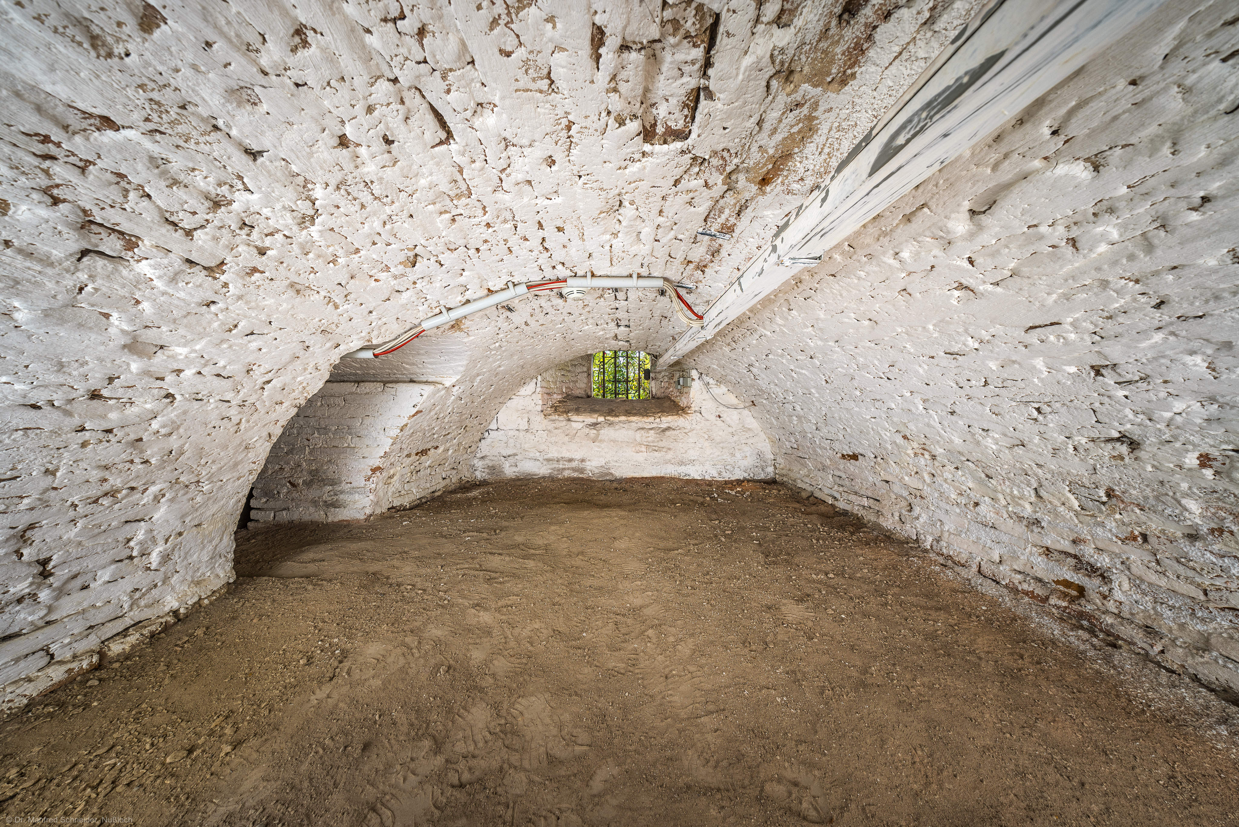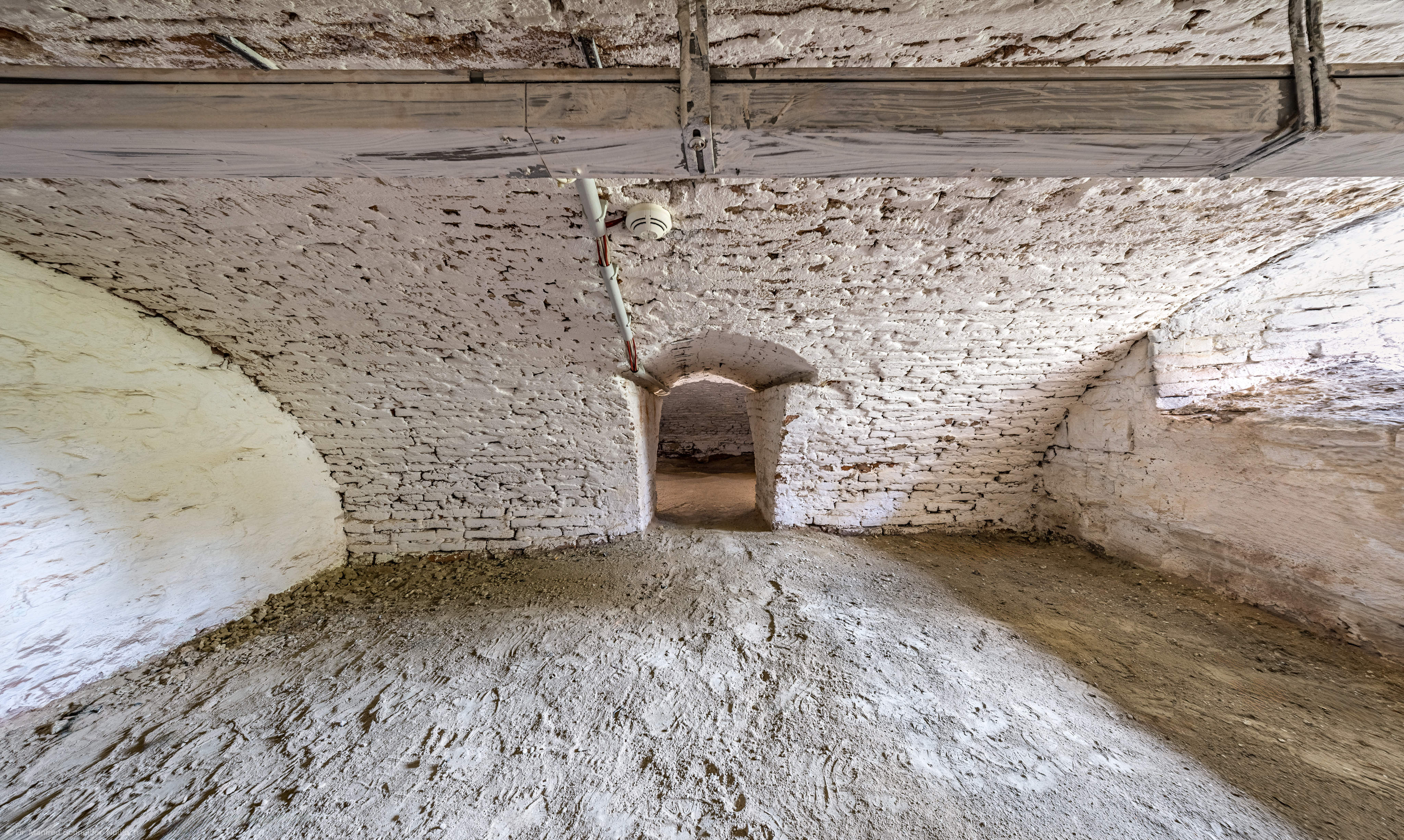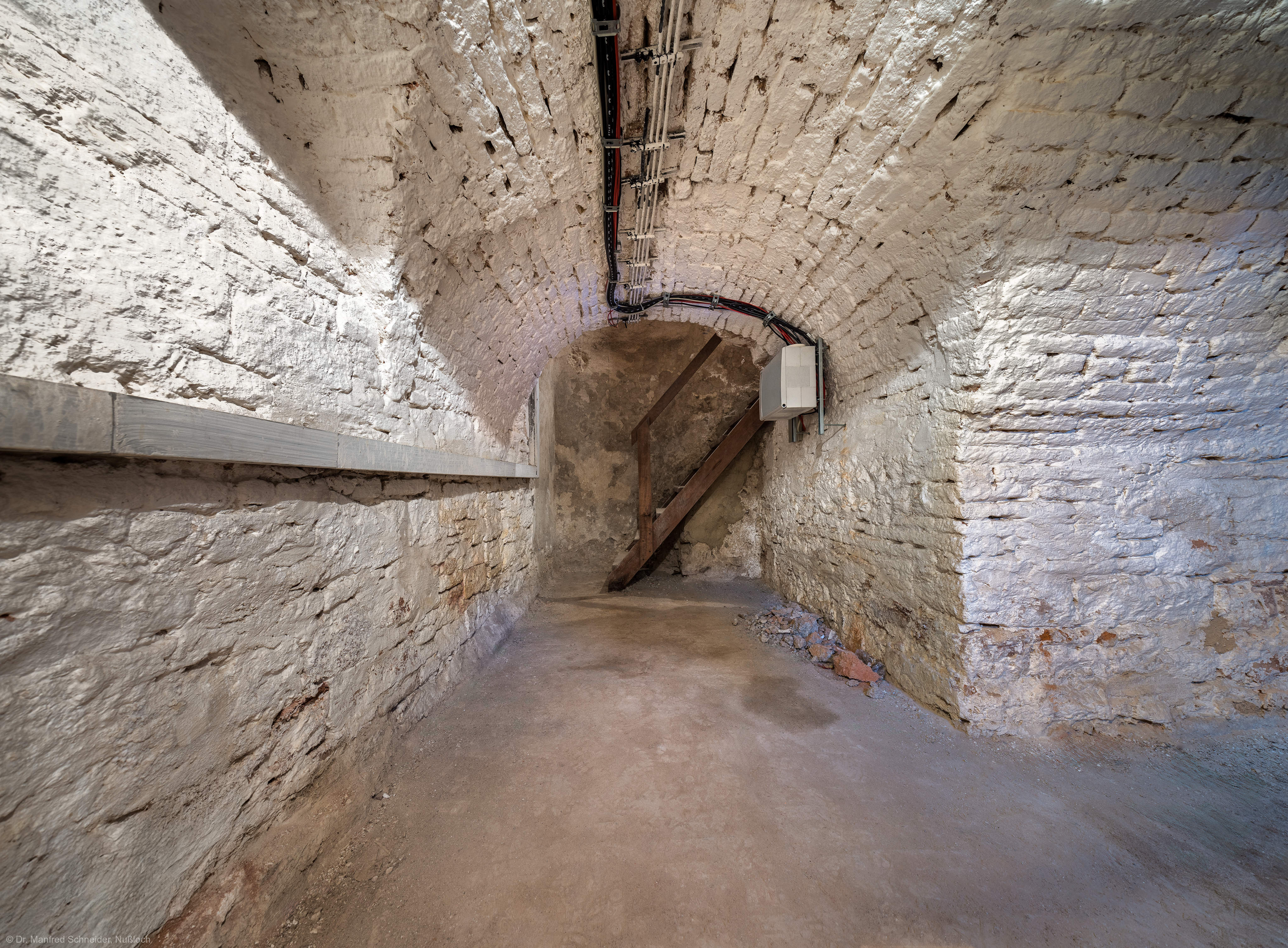 Schloss und Schlossgarten Schwetzingen - Garten - Badhaus - Von innen - Keller - Von Osten - Blick von der Ostwand des gewölbten Kellerraums unterhalb des Ovalsaals nach Westen in den Raum; Kellerraum Länge: ca. 6,5 Meter, Höhe: um 1,4 Meter; der Durchgang in der Mitte führt in den Raum unterhalb des westlichen Vorzimmers (Gesamter Bau: Länge x Breite ca. 18 x 14 Meter, Höhe ca. 10 Meter; Architekt: Nicolas de Pigage (1723-1796); Bauzeit: 1768-1772; Gesamtinstandsetzung innen und außen: 1999-2006) (aufgenommen im Oktober 2025, am frühen Nachmittag)