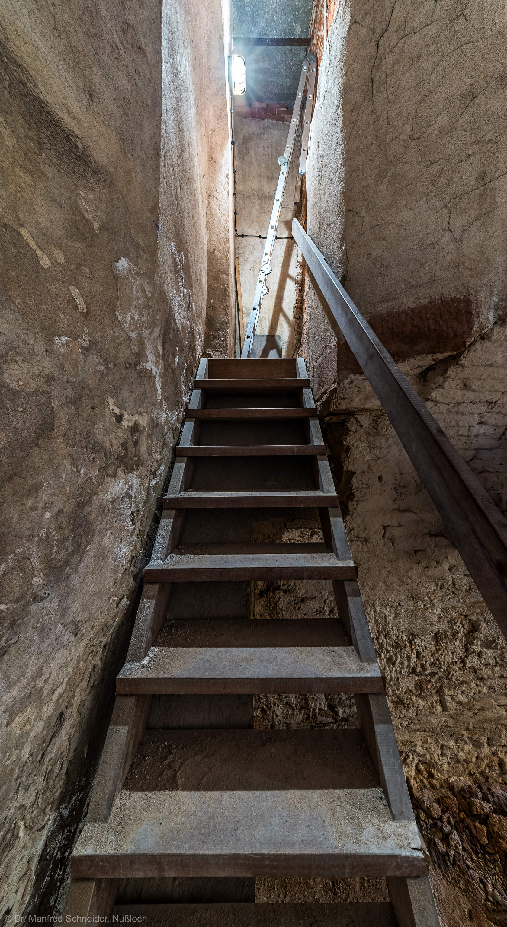 Schloss und Schlossgarten Schwetzingen - Garten - Badhaus - Von innen - Keller - Von unten / von Süden - Blick von der Südwestecke des gewölbten Kellerraums unterhalb des chinesischen Zimmers (des Teezimmers) nach Norden auf den hölzernen Treppenaufgang und den Zwischenraum zwischen chinesischem Zimmer und nördlicher Vorhalle; Gesamthöhe (vom Kellerboden bis zur Decke des Zimmers): ca. 7 Meter; ehemals war es möglich, von diesem Zwischenraum in den Dachstuhl des Badhauses zu steigen; in den Zwischenraum gelangt man durch eine kleine, nur ca. 70 cm hohe Tür in der Lambris-Zone rechts/nördlich des Kamins an der Westwannd des chinesischen Zimmers (Gesamter Bau: Länge x Breite ca. 18 x 14 Meter, Höhe ca. 10 Meter; Architekt: Nicolas de Pigage (1723-1796); Bauzeit: 1768-1772; Gesamtinstandsetzung innen und außen: 1999-2006) (aufgenommen im Oktober 2025, am frühen Nachmittag)