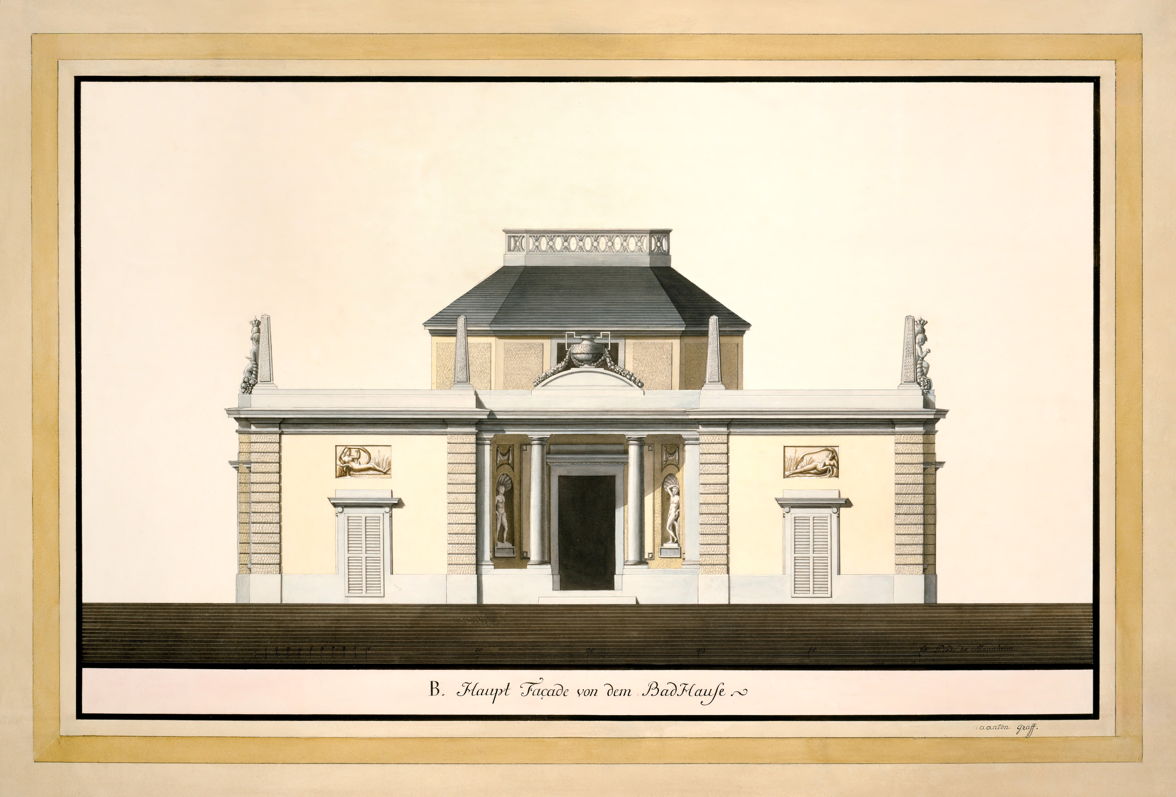 Schloss und Schlossgarten Schwetzingen - Badhaus - Aufriss, Südseite, Zeichnung von Anton Graff, 1799 - „B. Haupt Façade von dem Bad Hause", Feder in Schwarz, farbig laviert, 38,4 x 55,4 Zentimeter, bezeichnet unten rechts: Anton Graff, bezifferter Maßstab in „Pieds de Mannheim" (Bildnachweis: Graff, Anton: Schwetzingen, Badhaus, Ansicht, 1799, GK II (1) o. Nr. / Stiftung Preußische Schlösser und Gärten Berlin-Brandenburg / Fotograf: Daniel Lindner; mit freundlicher Genehmigung der Stiftung Preußische Schlösser und Gärten Berlin-Brandenburg / www.spsg.de)