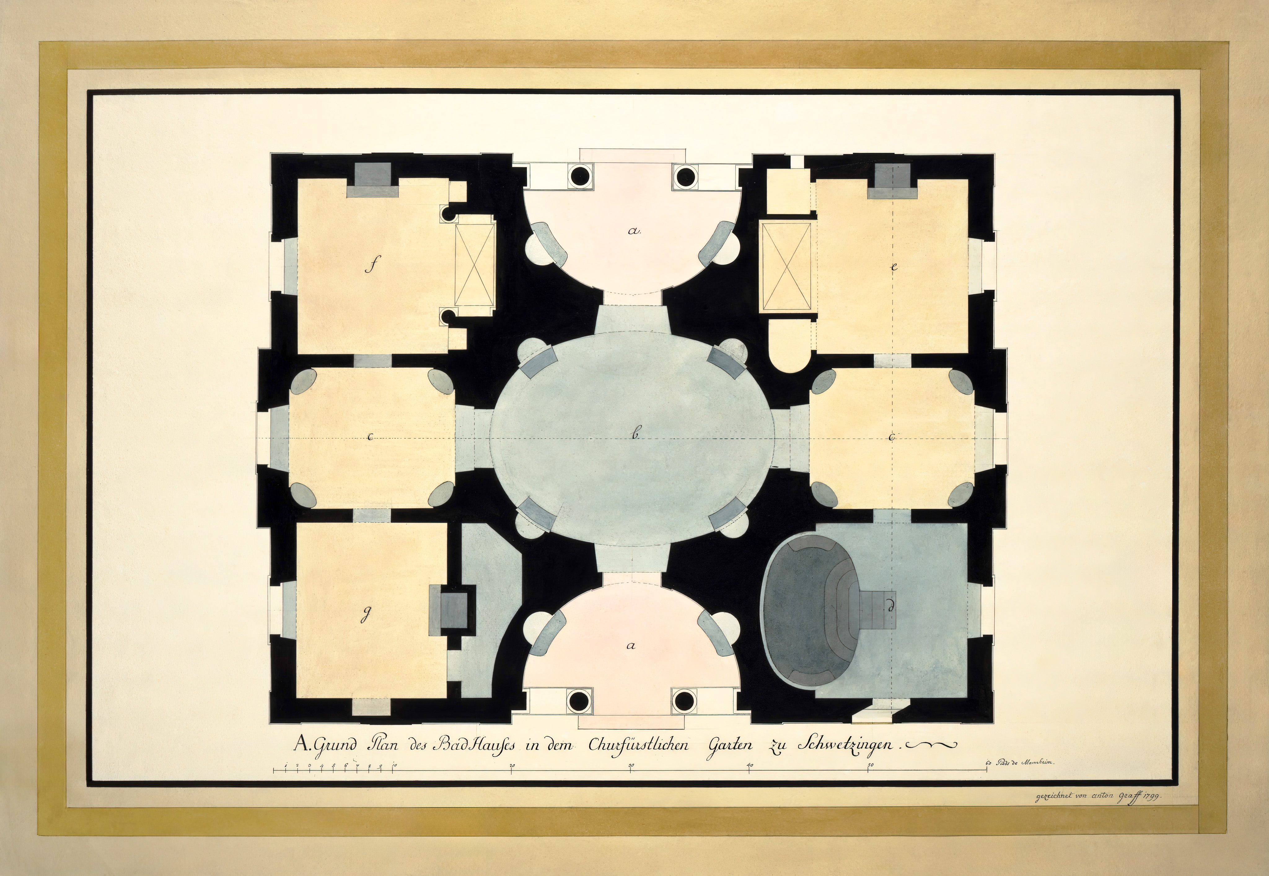 Schloss und Schlossgarten Schwetzingen - Badhaus - Grundriss, Zeichnung von Anton Graff, 1799 - „A. Grund Plan des Bad Hauses in dem Churfürstlichen Garten zu Schwetzingen", Feder in Schwarz, farbig laviert, 38,4 x 55,4 Zentimeter, bezeichnet rechts unten: gezeichnet von Anton Graff 1799, bezifferter Maßstab in „Pieds de Mannheim" (Bildnachweis: Graff, Anton: A. Grund Plan des Bad Hauses in dem Churfürstlichen Garten in Schwetzingen, 1799, GK II (1) o.Nr. / Stiftung Preußische Schlösser und Gärten Berlin-Brandenburg / Fotograf: Daniel Lindner; mit freundlicher Genehmigung der Stiftung Preußische Schlösser und Gärten Berlin-Brandenburg / www.spsg.de)