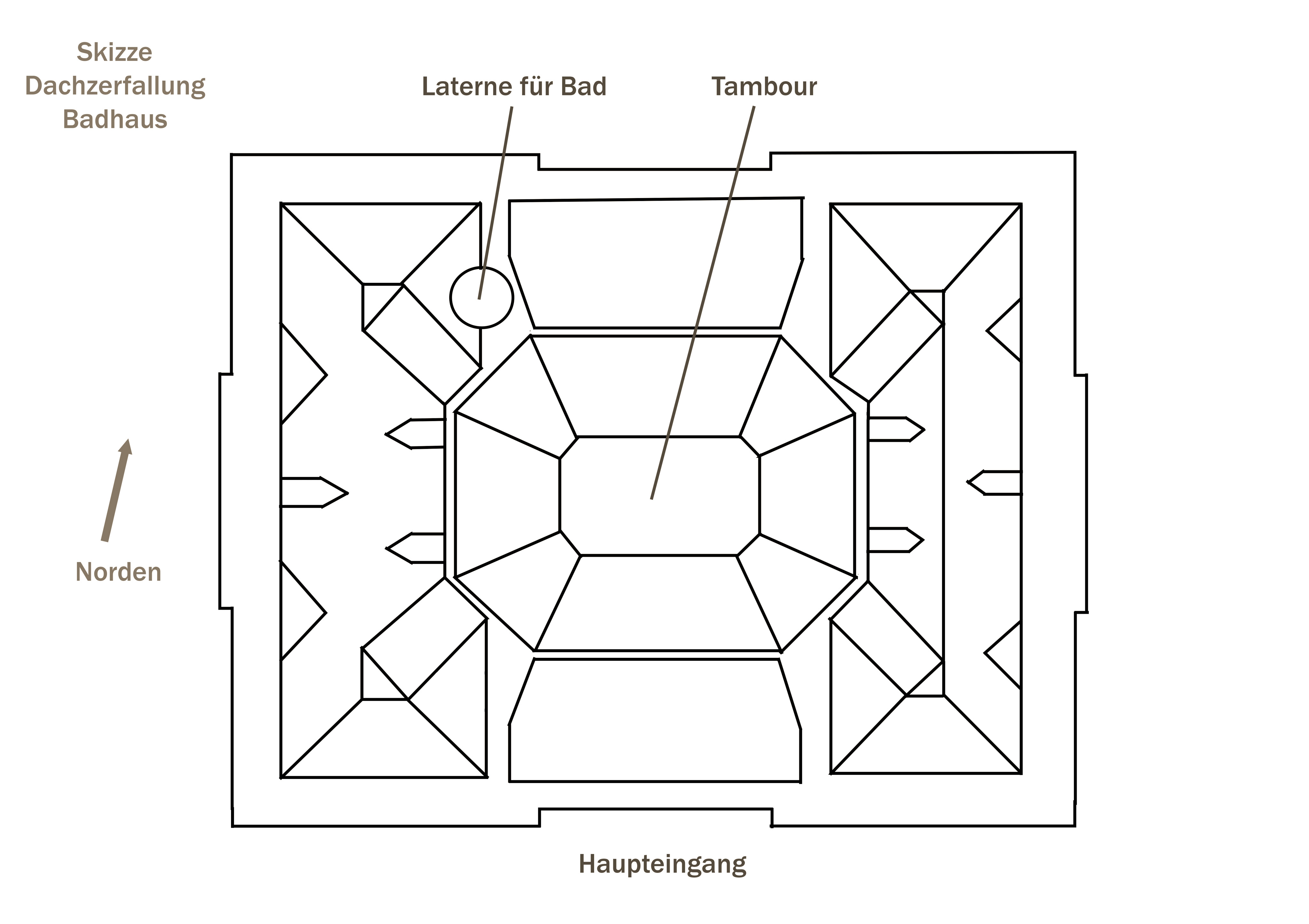 Schloss und Schlossgarten Schwetzingen - Badhaus, ungefähre Dachzerfallung, 2006, nach der Gesamtinstandsetzung - Skizze von Dr. Manfred Schneider