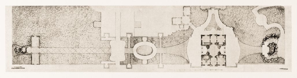 Schloss und Schlossgarten Schwetzingen - Längsschnitt durch die Gesamtkomposition der Badhausanlage - Zeichnung von Wilhelm Schweitzer, 1930 (Bildnachweis: Die Kunstdenkmäler des Amtsbezirks Mannheim – Stadt Schwetzingen – 1933)
