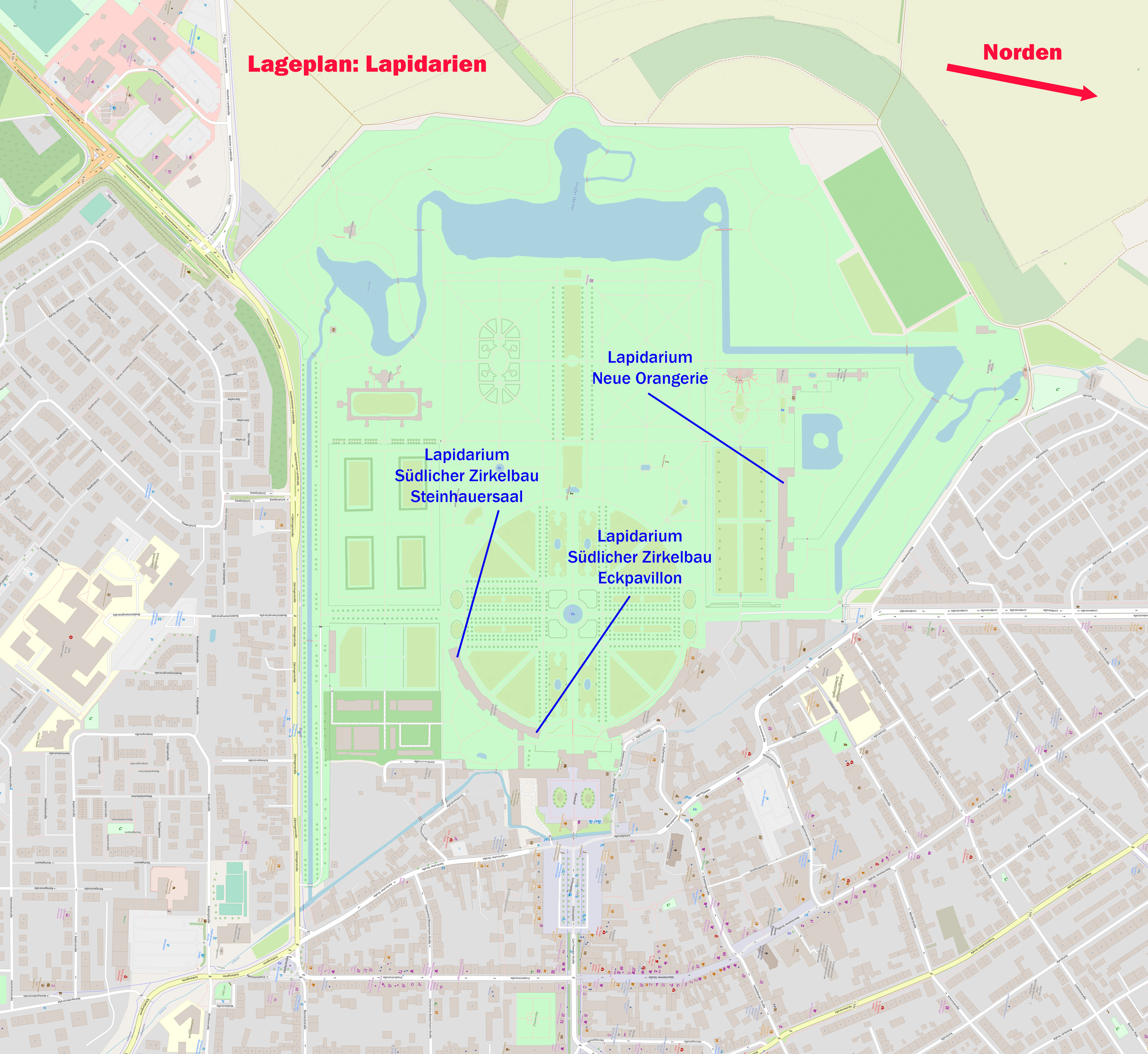 Schloss und Schlossgarten Schwetzingen - Lageplan: Lapidarien im Schlossgarten Schwetzingen (Karte: © OpenStreetMap-Mitwirkende; Lizenz: Namensnennung - Weitergabe unter gleichen Bedingungen 2.0 Generic (CC BY-SA 2.0); siehe: www.openstreetmap.org/copyright; Karte modifiziert durch Dr. Manfred Schneider)