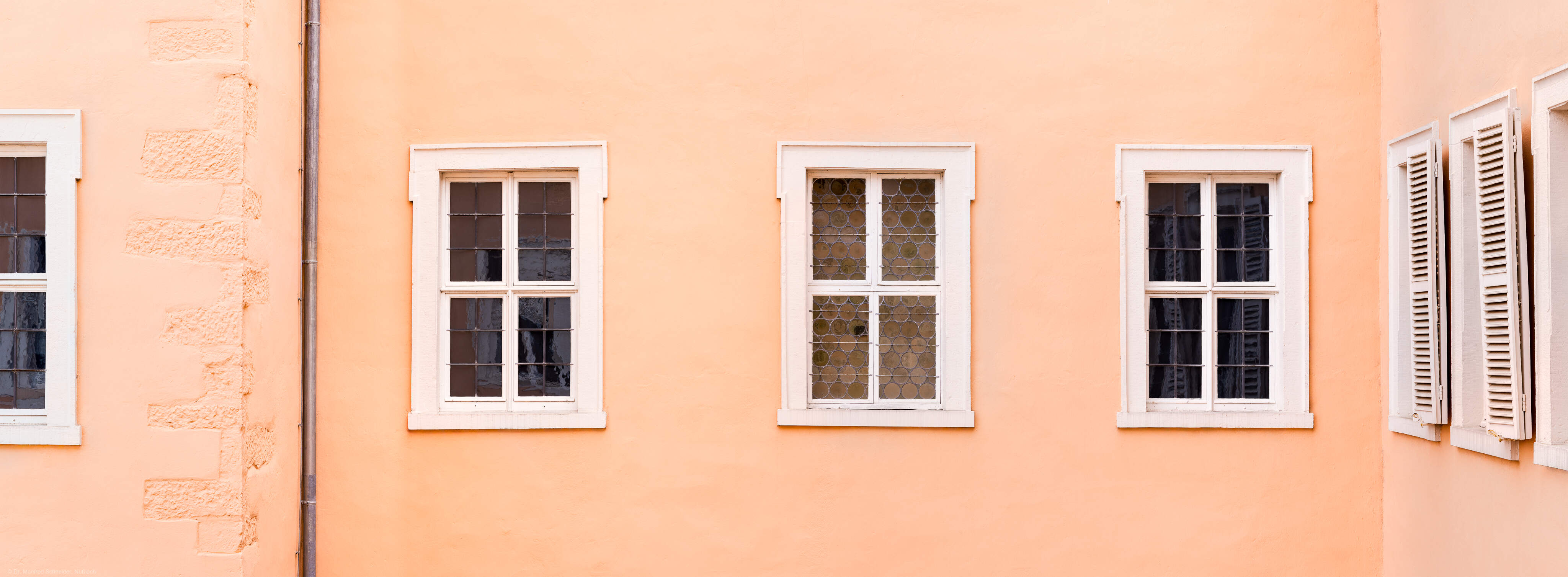 Schloss und Schlossgarten Schwetzingen - Schloss - Mittelbau - Hofseite - Südlicher Teil, Nordseite - Von Norden - Blick auf Fenster des Mittelbaus im 2. Obergeschoss; das Fenster in der Bildmitte (gehört zum westlichsten Raum der drei Räume der Hofdamen) ist mit (originalen) mundgeblasenen Butzenscheiben ausgestattet (aufgenommen im März 2026, am späten Vormittag)