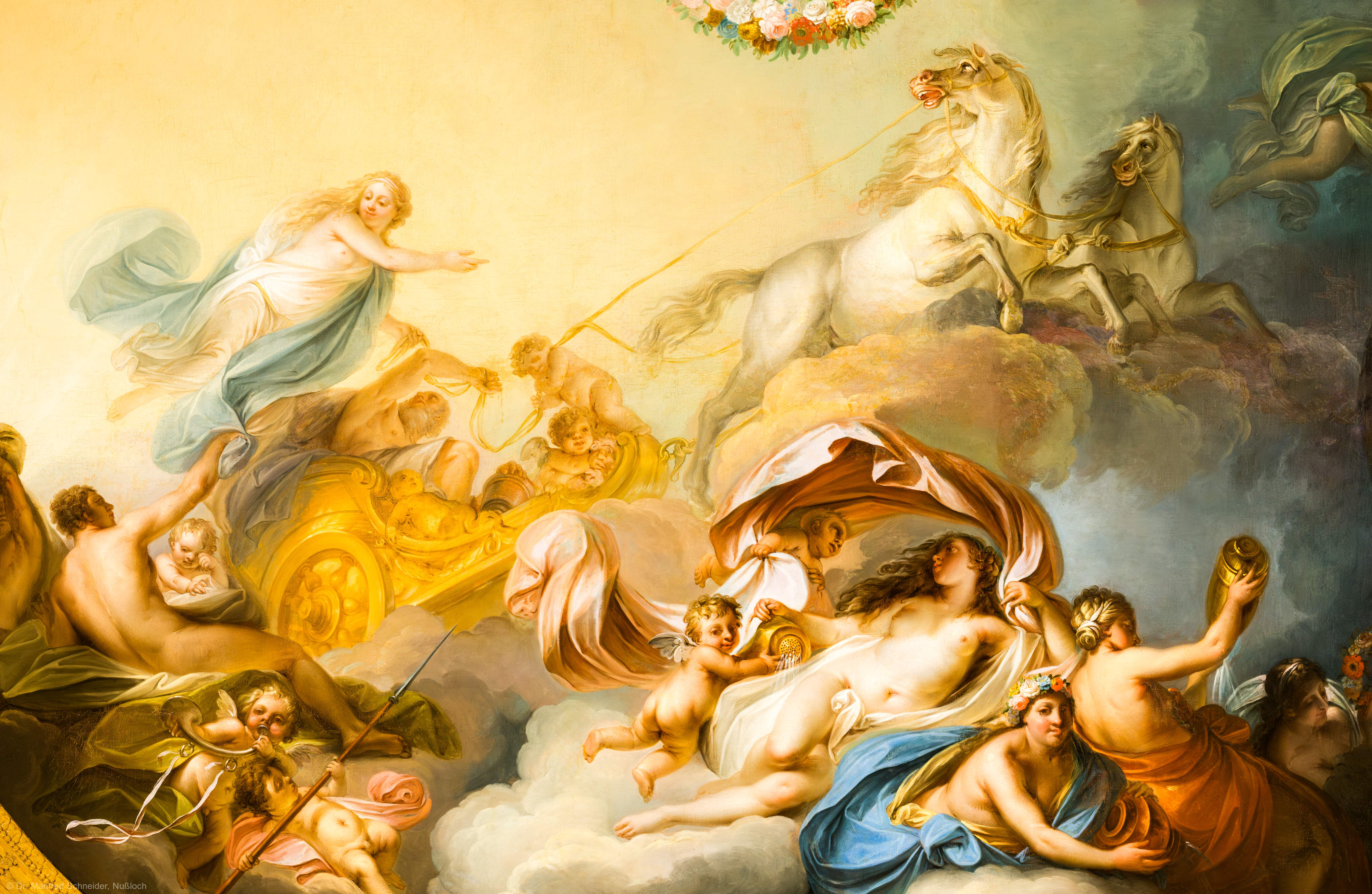 Schloss und Schlossgarten Schwetzingen - Garten - Badhaus - Von innen - Ovalsaal - Deckengemälde - Von unten - Ausschnitt aus dem Deckengemälde "Aurora vertreibt die Nacht"; links oben Aurora auf goldenem Wagen, von zwei weißen Sonnenpferden gezogen, links unten Uranus, darunter Putti mit Jagdhorn und Lanze, mitte unten Tauschwestern, aus goldenen Gefäßen den Tau spendend (Maler: Nicolas Guibal (1725-1784); Datierung: 1772; Signaturen: links unten "N. Guibal Lotharingus inv et fecit 1772" und rechts unten "N. Guibal Lotharingus invenit et pinxit 1772"; Öl auf Leinwand, mit vergoldeten Eichenlaubkranz eingefasst; Restaurierungen: 1890, 1949, 2006) (Gesamter Bau: Länge x Breite ca. 18 x 14 Meter, Höhe ca. 10 Meter; Architekt: Nicolas de Pigage (1723-1796); Bauzeit: 1768-1772; Gesamtinstandsetzung innen und außen: 1999-2006) (aufgenommen im Oktober 2025, am Nachmittag)