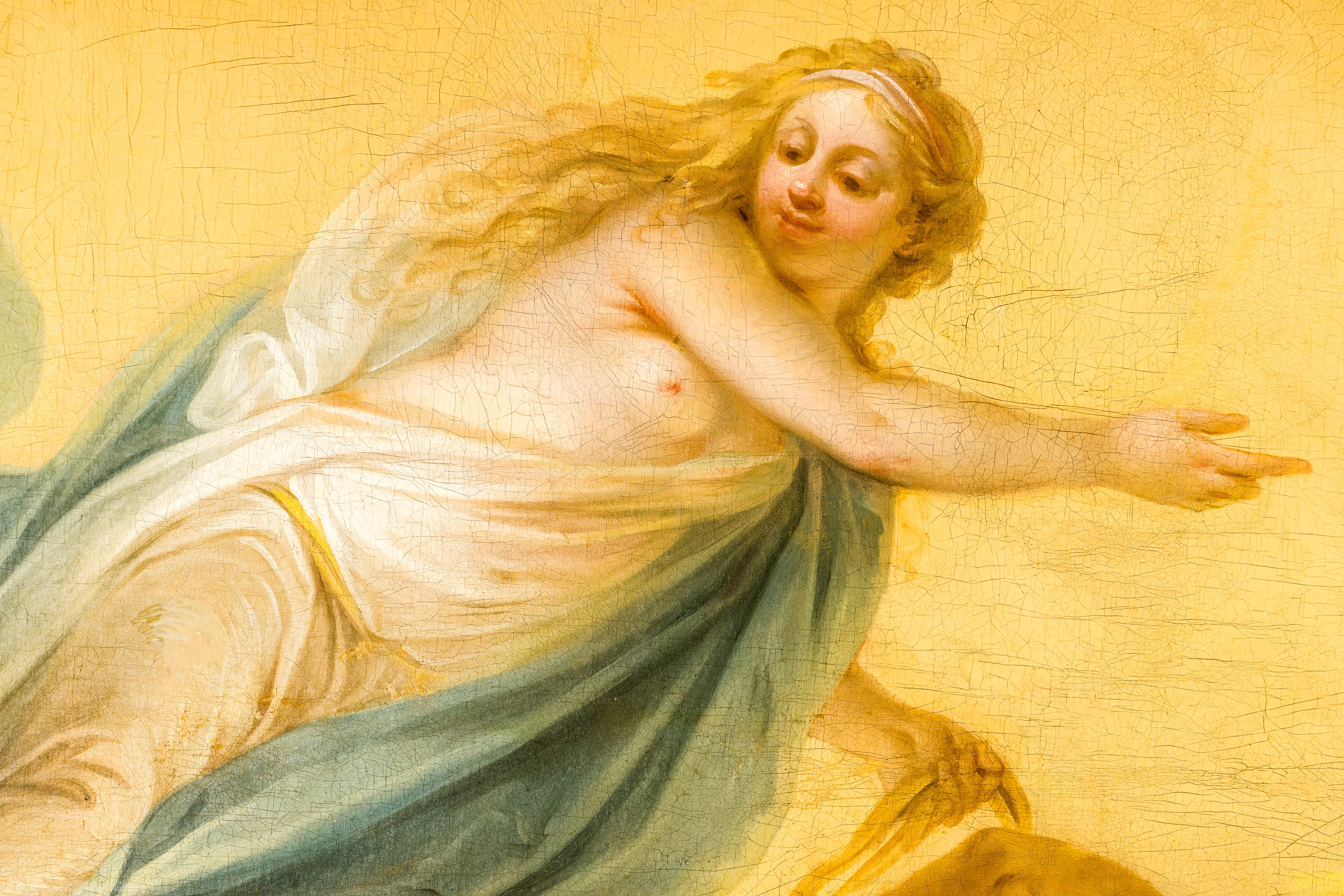 Schloss und Schlossgarten Schwetzingen - Garten - Nördlicher Zirkelbau - Westlicher Pavillon / Foyer des Schlosstheaters - Von innen - Nordwand, rechte Seite - Ausschnitt aus einem Gemälde; Darstellung unklar (Vesta?/Hestia?) (Maler und Datierung unbekannt; Hängung im Nordzirkel seit mindestens der 1950er Jahre) (Gesamter Bau: Länge Bogen ca. 175 Meter, Breite zwischen ca. 11 und 18 Meter, 51 Achsen, 5 Pavillons, 4 Zwischenbauten; Architekt: Alessandro Alessandro Galli da Bibiena (1686-1748), Bauleitung: zuerst Guillaume d’Hauberat (1680–1749), dann Nicolas de Pigage (1723-1796); Bauzeit: 1748-1750) (aufgenommen im Oktober 2024, am späten Vormittag)