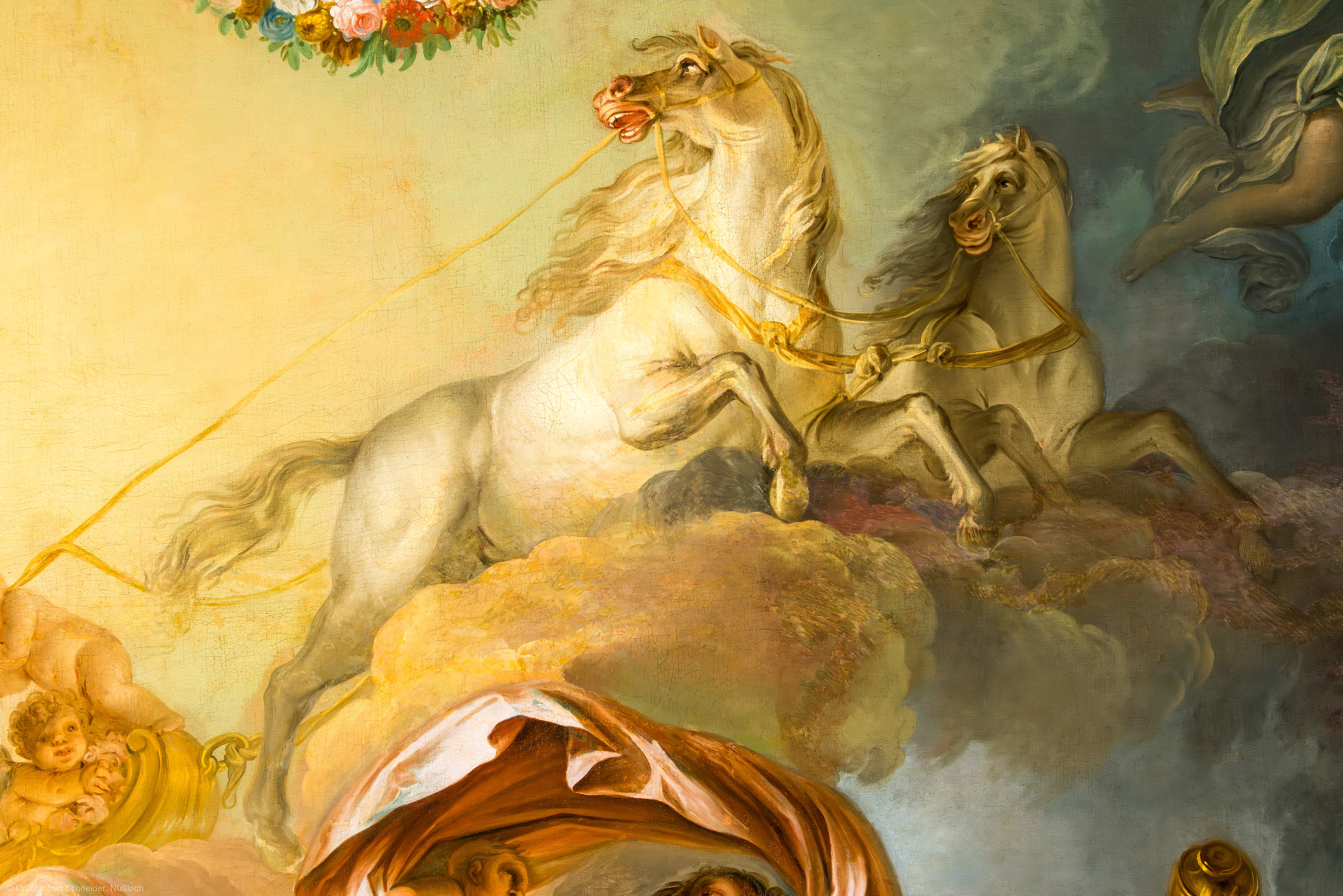 Schloss und Schlossgarten Schwetzingen - Garten - Badhaus - Von innen - Ovalsaal - Deckengemälde - Von unten - Ausschnitt aus dem Deckengemälde "Aurora vertreibt die Nacht"; in der Bildmitte: zwei weiße Sonnenpferde, den goldenen Wagen der Aurora ziehend (Maler: Nicolas Guibal (1725-1784); Datierung: 1772; Signaturen: links unten "N. Guibal Lotharingus inv et fecit 1772" und rechts unten "N. Guibal Lotharingus invenit et pinxit 1772"; Öl auf Leinwand, mit vergoldeten Eichenlaubkranz eingefasst; Restaurierungen: 1890, 1949, 2006) (Gesamter Bau: Länge x Breite ca. 18 x 14 Meter, Höhe ca. 10 Meter; Architekt: Nicolas de Pigage (1723-1796); Bauzeit: 1768-1772; Gesamtinstandsetzung innen und außen: 1999-2006) (aufgenommen im Oktober 2025, am späten Nachmittag)