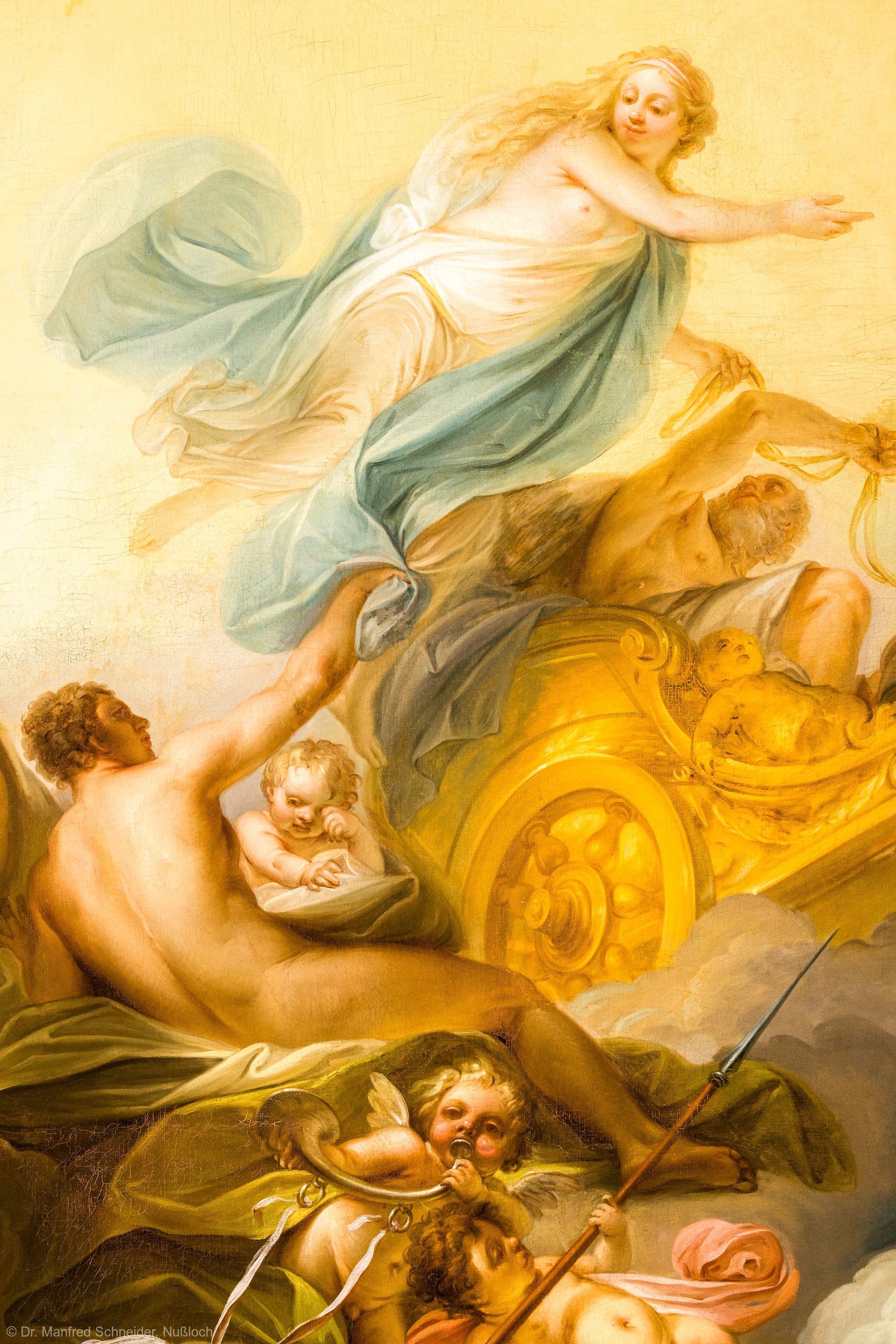 Schloss und Schlossgarten Schwetzingen - Garten - Badhaus - Von innen - Ovalsaal - Deckengemälde - Von unten - Ausschnitt aus dem Deckengemälde "Aurora vertreibt die Nacht"; oben Aurora, links Uranus, unten Putti mit Jagdhorn und Lanze (Maler: Nicolas Guibal (1725-1784); Datierung: 1772; Signaturen: links unten "N. Guibal Lotharingus inv et fecit 1772" und rechts unten "N. Guibal Lotharingus invenit et pinxit 1772"; Öl auf Leinwand, mit vergoldeten Eichenlaubkranz eingefasst; Restaurierungen: 1890, 1949, 2006) (Gesamter Bau: Länge x Breite ca. 18 x 14 Meter, Höhe ca. 10 Meter; Architekt: Nicolas de Pigage (1723-1796); Bauzeit: 1768-1772; Gesamtinstandsetzung innen und außen: 1999-2006) (aufgenommen im Oktober 2025, am späten Nachmittag)
