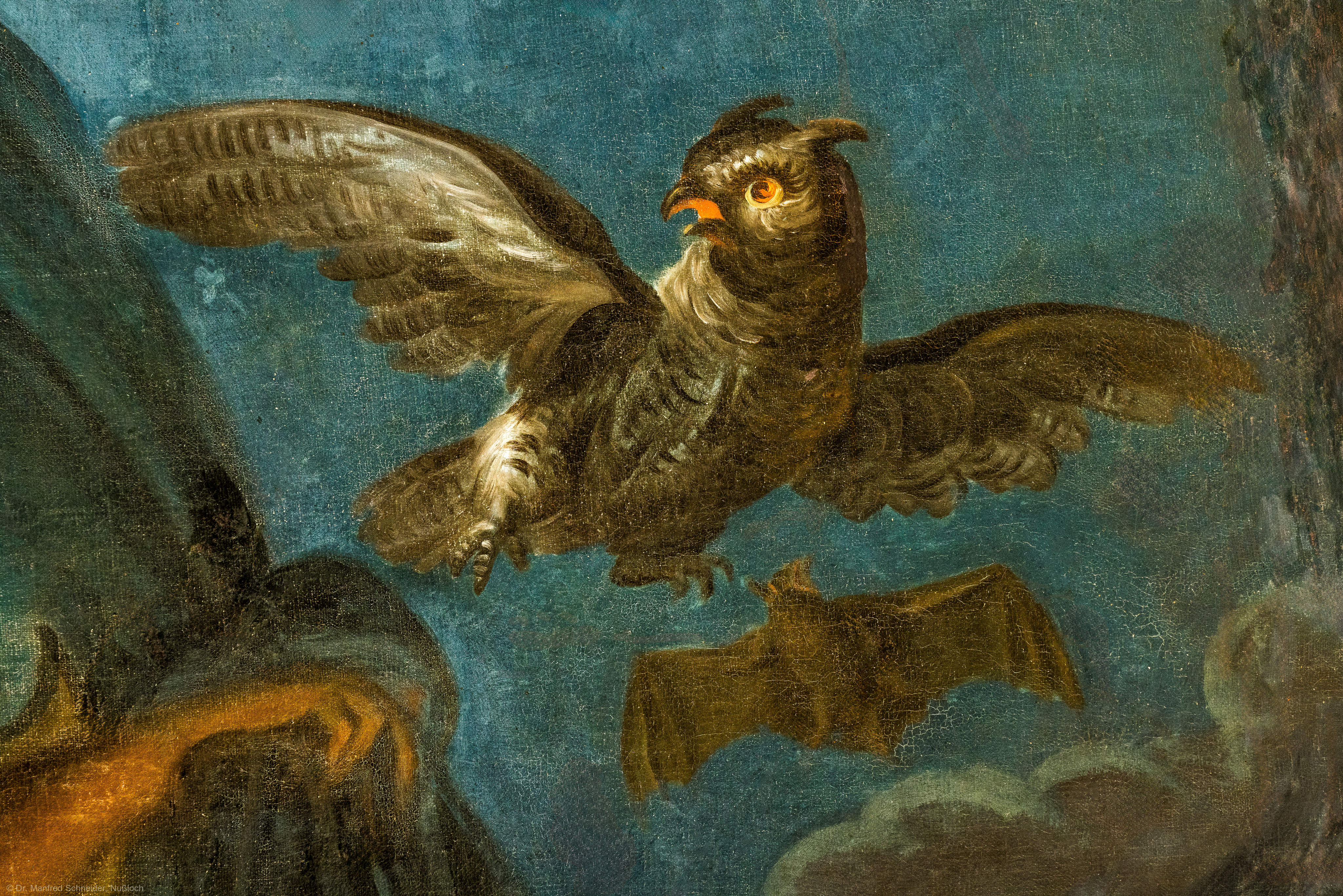 Schloss und Schlossgarten Schwetzingen - Garten - Badhaus - Von innen - Ovalsaal - Deckengemälde - Von unten - Ausschnitt aus dem Deckengemälde "Aurora vertreibt die Nacht"; am rechten Bildrand: Eule und Fledermaus (Maler: Nicolas Guibal (1725-1784); Datierung: 1772; Signaturen: links unten "N. Guibal Lotharingus inv et fecit 1772" und rechts unten "N. Guibal Lotharingus invenit et pinxit 1772"; Öl auf Leinwand, mit vergoldeten Eichenlaubkranz eingefasst; Restaurierungen: 1890, 1949, 2006) (Gesamter Bau: Länge x Breite ca. 18 x 14 Meter, Höhe ca. 10 Meter; Architekt: Nicolas de Pigage (1723-1796); Bauzeit: 1768-1772; Gesamtinstandsetzung innen und außen: 1999-2006) (aufgenommen im Oktober 2025, am späten Nachmittag)