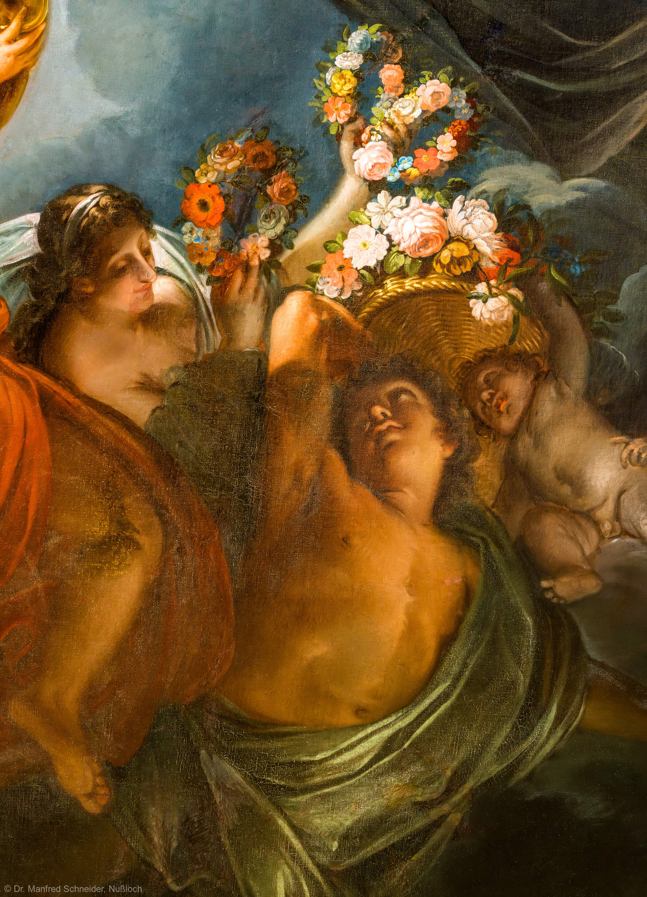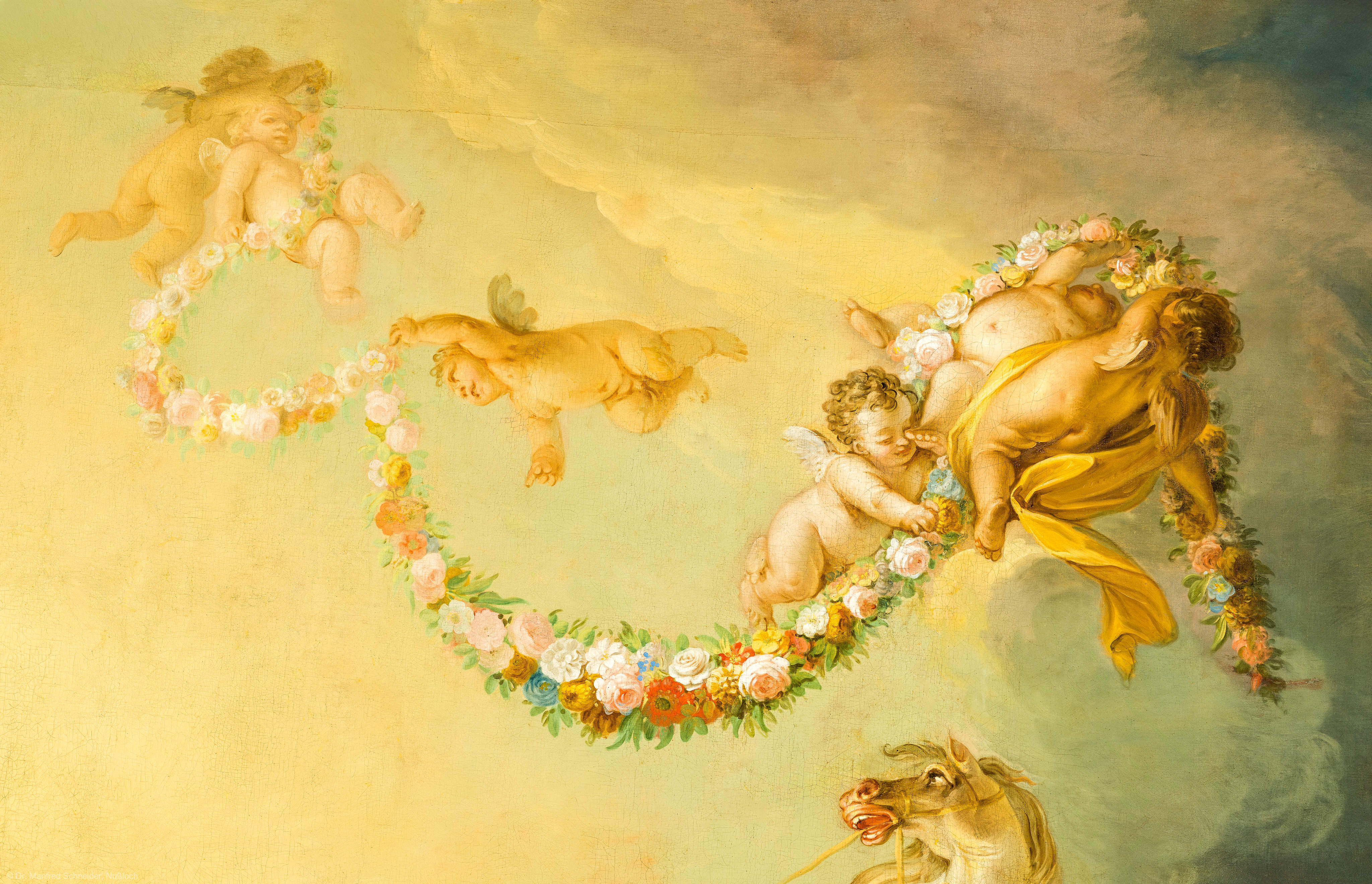 Schloss und Schlossgarten Schwetzingen - Garten - Badhaus - Von innen - Ovalsaal - Deckengemälde - Von unten - Ausschnitt aus dem Deckengemälde "Aurora vertreibt die Nacht"; im Bild oben: schwebende Putti mit Rosenkränzen (Maler: Nicolas Guibal (1725-1784); Datierung: 1772; Signaturen: links unten "N. Guibal Lotharingus inv et fecit 1772" und rechts unten "N. Guibal Lotharingus invenit et pinxit 1772"; Öl auf Leinwand, mit vergoldeten Eichenlaubkranz eingefasst; Restaurierungen: 1890, 1949, 2006) (Gesamter Bau: Länge x Breite ca. 18 x 14 Meter, Höhe ca. 10 Meter; Architekt: Nicolas de Pigage (1723-1796); Bauzeit: 1768-1772; Gesamtinstandsetzung innen und außen: 1999-2006) (aufgenommen im Oktober 2025, am Nachmittag)