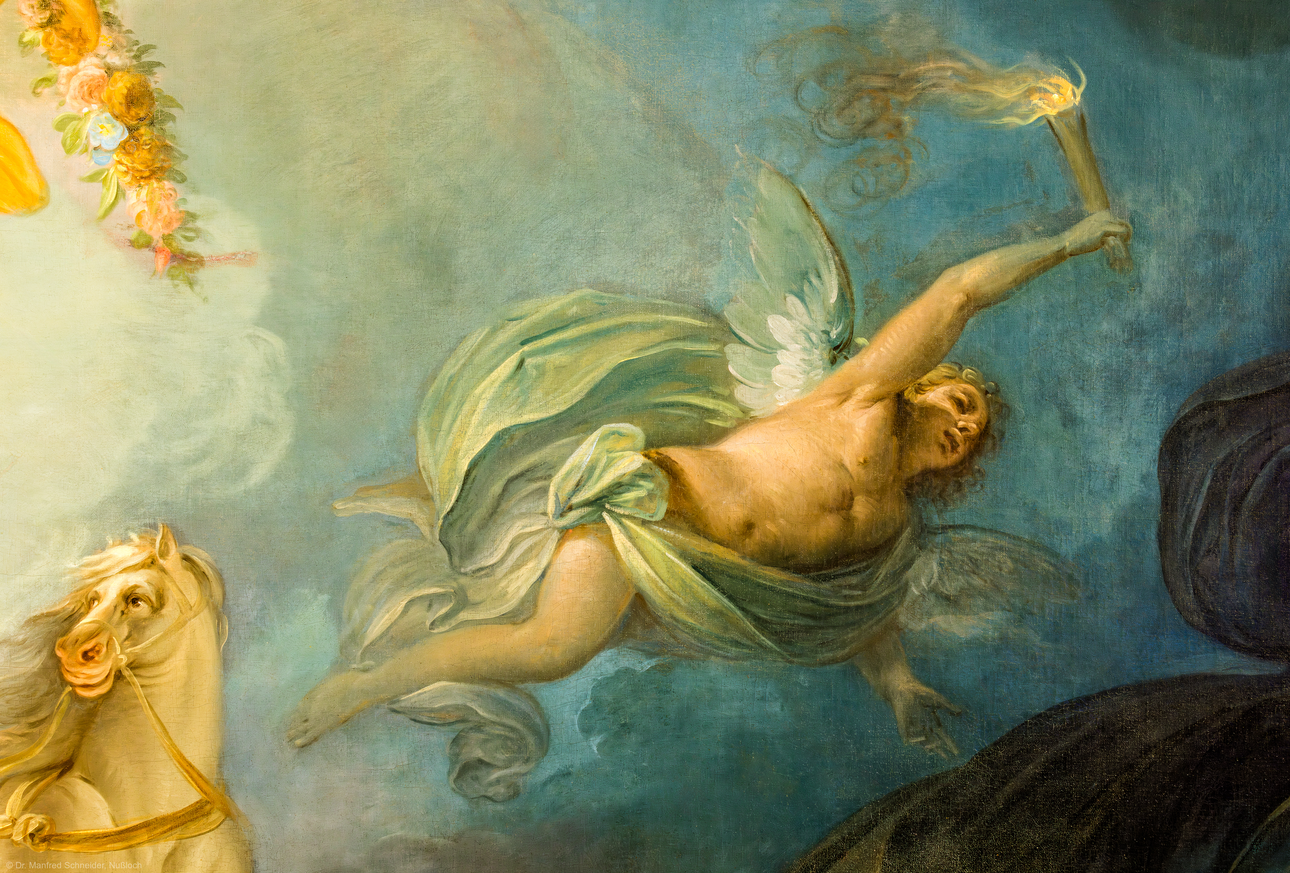Schloss und Schlossgarten Schwetzingen - Garten - Badhaus - Von innen - Ovalsaal - Deckengemälde - Von unten - Ausschnitt aus dem Deckengemälde "Aurora vertreibt die Nacht"; rechts oberhalb der Bildmitte: der Morgenstern (mit Fackel, Aurora den Weg zeigend) (Maler: Nicolas Guibal (1725-1784); Datierung: 1772; Signaturen: links unten "N. Guibal Lotharingus inv et fecit 1772" und rechts unten "N. Guibal Lotharingus invenit et pinxit 1772"; Öl auf Leinwand, mit vergoldeten Eichenlaubkranz eingefasst; Restaurierungen: 1890, 1949, 2006) (Gesamter Bau: Länge x Breite ca. 18 x 14 Meter, Höhe ca. 10 Meter; Architekt: Nicolas de Pigage (1723-1796); Bauzeit: 1768-1772; Gesamtinstandsetzung innen und außen: 1999-2006) (aufgenommen im Oktober 2025, am Nachmittag)