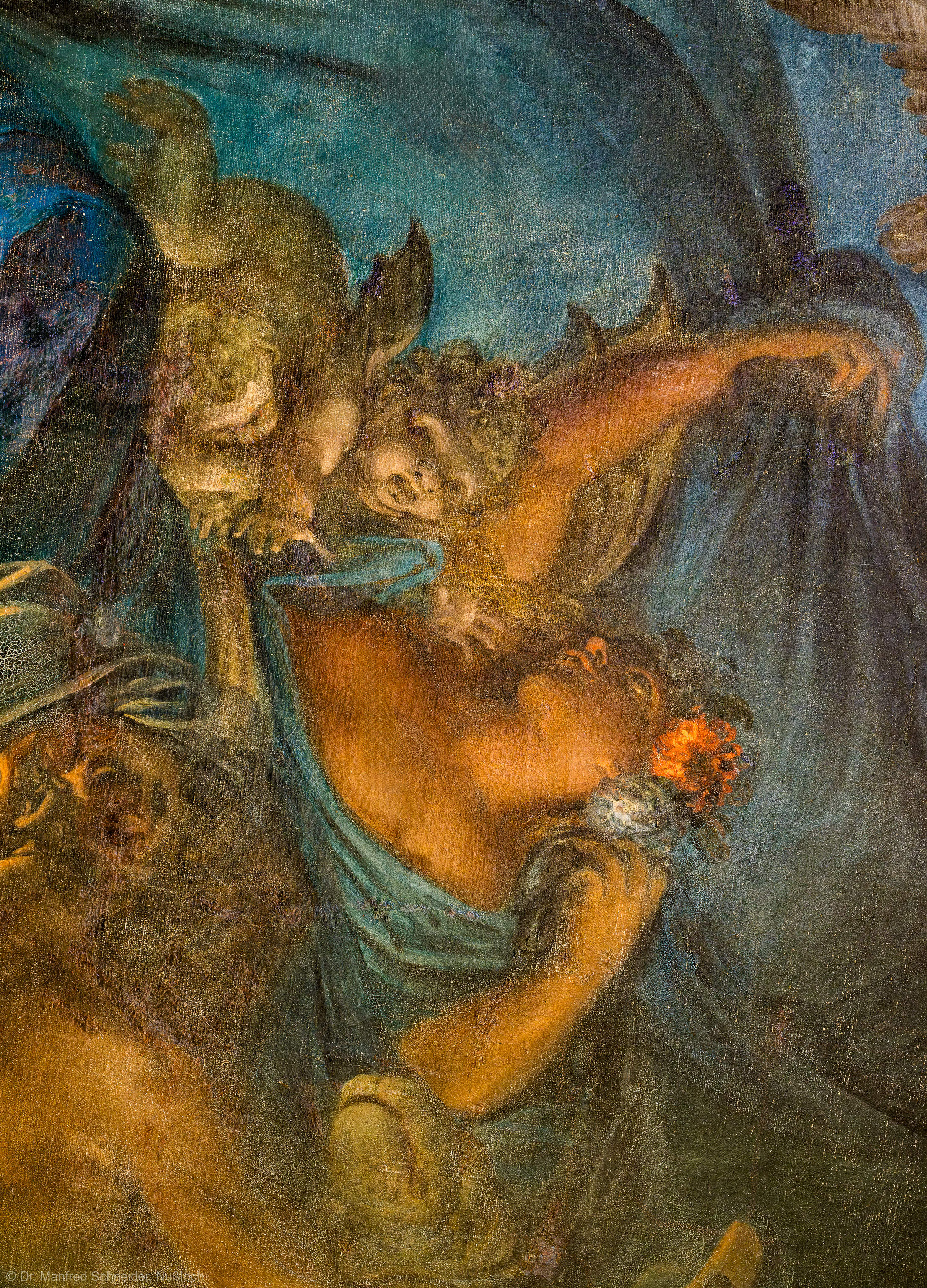 Schloss und Schlossgarten Schwetzingen - Garten - Badhaus - Von innen - Ovalsaal - Deckengemälde - Von unten - Ausschnitt aus dem Deckengemälde "Aurora vertreibt die Nacht"; nahe dem rechten Bildrand: Nox (die mohnbekrönte Göttin der Nacht), Putto und weitere Wesen (Maler: Nicolas Guibal (1725-1784); Datierung: 1772; Signaturen: links unten "N. Guibal Lotharingus inv et fecit 1772" und rechts unten "N. Guibal Lotharingus invenit et pinxit 1772"; Öl auf Leinwand, mit vergoldeten Eichenlaubkranz eingefasst; Restaurierungen: 1890, 1949, 2006) (Gesamter Bau: Länge x Breite ca. 18 x 14 Meter, Höhe ca. 10 Meter; Architekt: Nicolas de Pigage (1723-1796); Bauzeit: 1768-1772; Gesamtinstandsetzung innen und außen: 1999-2006) (aufgenommen im Oktober 2025, am späten Nachmittag)