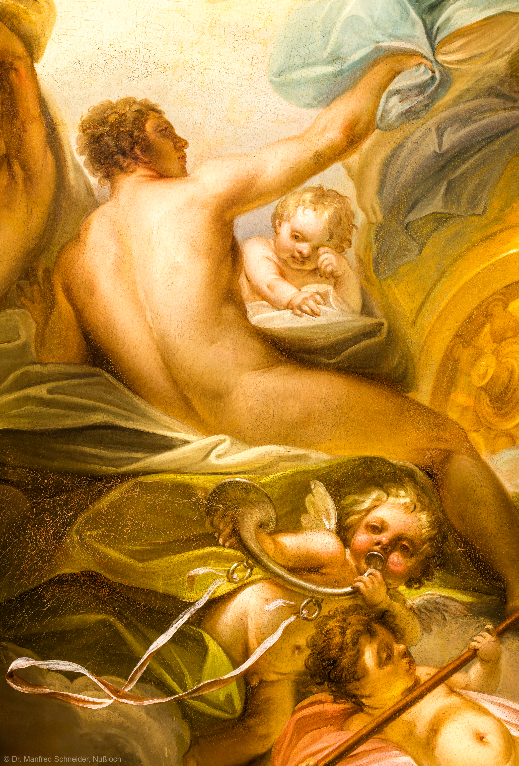 Schloss und Schlossgarten Schwetzingen - Garten - Badhaus - Von innen - Ovalsaal - Deckengemälde - Von unten - Ausschnitt aus dem Deckengemälde "Aurora vertreibt die Nacht"; oben: Uranus, unten: Putti mit Jagdhorn und Lanze (Maler: Nicolas Guibal (1725-1784); Datierung: 1772; Signaturen: links unten "N. Guibal Lotharingus inv et fecit 1772" und rechts unten "N. Guibal Lotharingus invenit et pinxit 1772"; Öl auf Leinwand, mit vergoldeten Eichenlaubkranz eingefasst; Restaurierungen: 1890, 1949, 2006) (Gesamter Bau: Länge x Breite ca. 18 x 14 Meter, Höhe ca. 10 Meter; Architekt: Nicolas de Pigage (1723-1796); Bauzeit: 1768-1772; Gesamtinstandsetzung innen und außen: 1999-2006) (aufgenommen im Oktober 2025, am späten Nachmittag)