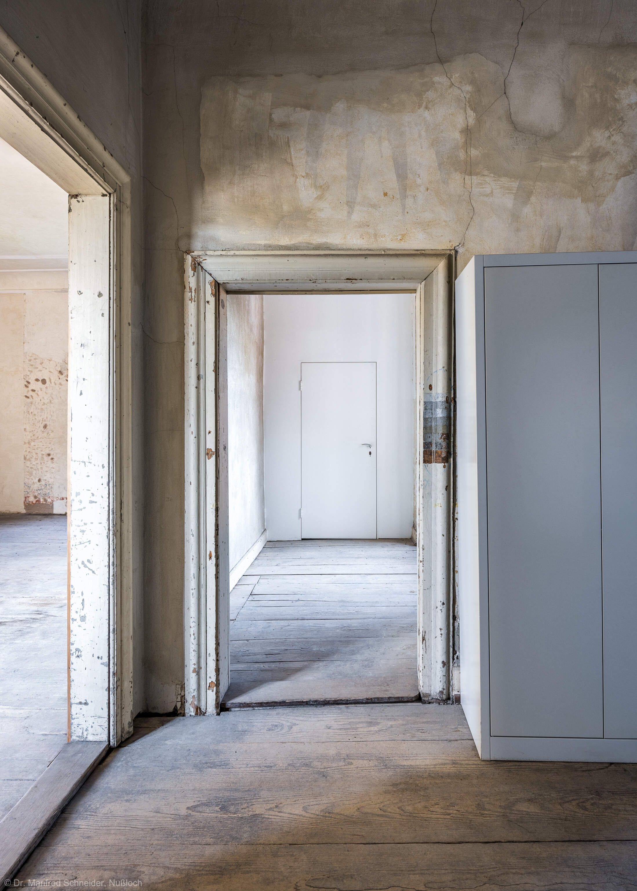 Schloss und Schlossgarten Schwetzingen - Schloss - Mittelbau - Von innen - 3. Obergeschoss - Nördlicher Gang - Von Osten - Blick von der Tür nach Westen in den Gang; links die Tür zum Raum 235, rechts ein Wandschrank; ganz hinten im westlichen Gang demontierte Bauteile (aufgenommen im März 2026, am späten Vormittag)