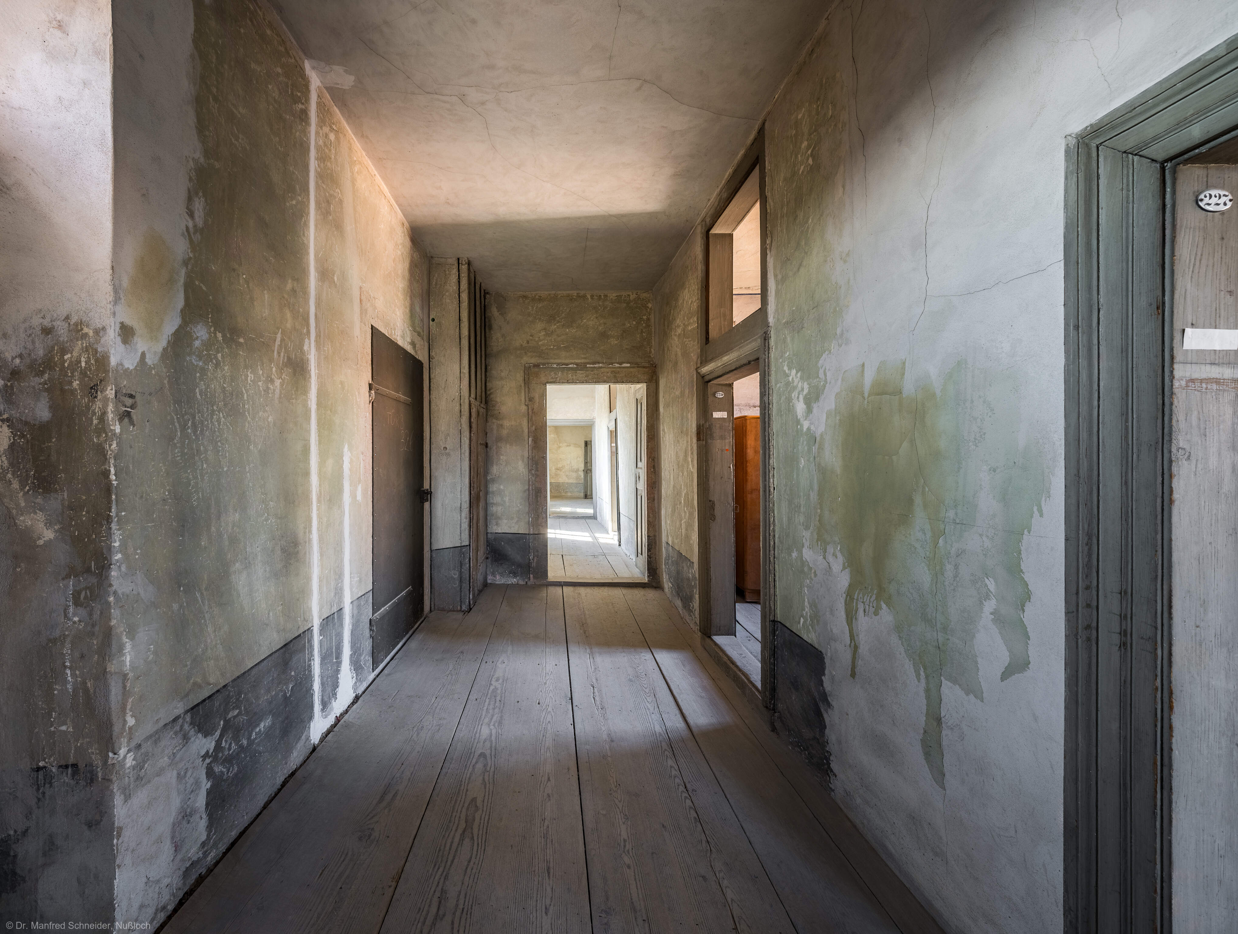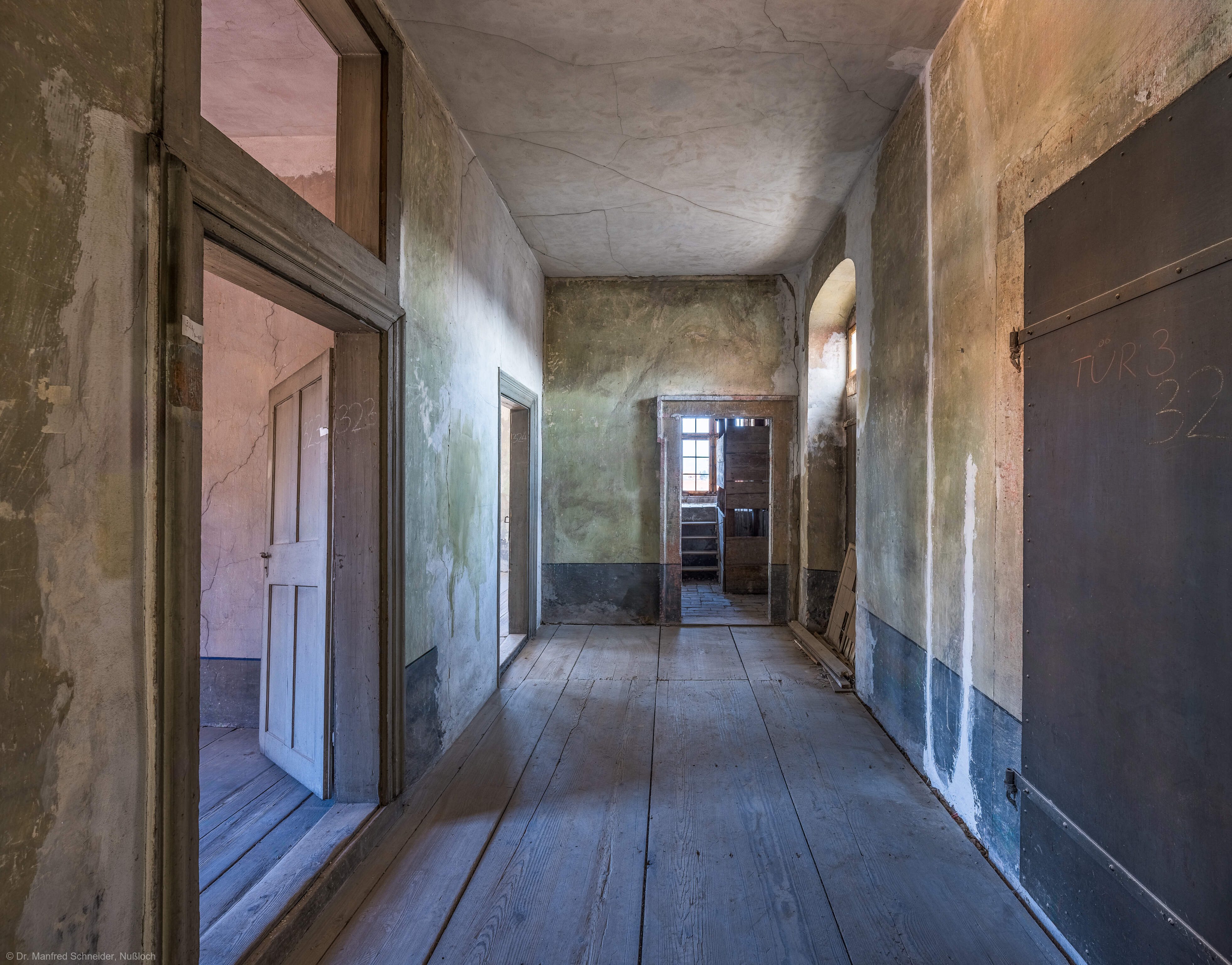 Schloss und Schlossgarten Schwetzingen - Schloss - Mittelbau - Von innen - 3. Obergeschoss - Südlicher Gang - Von Westen - Blick von der Tür zum Raum 230 nach Osten in den südlichen Gang; links vorne die Tür zum Raum 228, links hinten die Tür zum Raum 227; die Tür in der Mitte führt in den Schacht des südlichen Turms; die Tür hinten rechts (bei den Hölzern, nur teilweise sichtbar) führte ehemals (heute zugemauert) in den Dachstuhl des Querbaus des Südflügels / Hofdamenflügels; die Tür vorne rechts führt in den alten Treppenturm (aufgenommen im März 2026, am frühen Nachmittag)