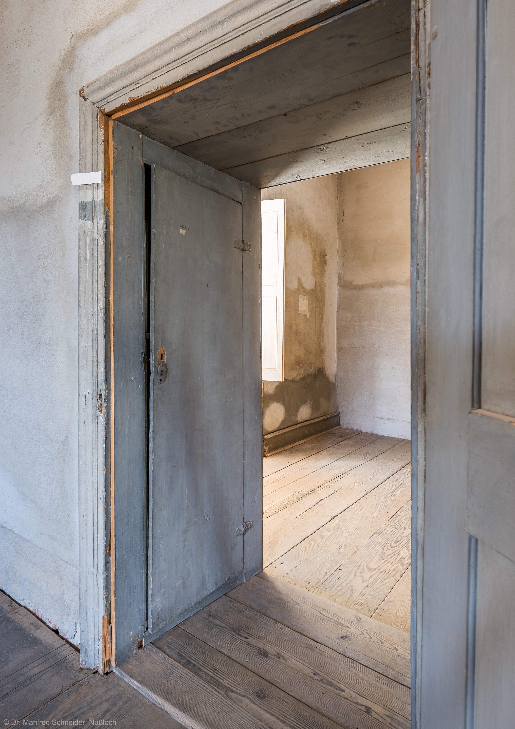 Schloss und Schlossgarten Schwetzingen - Schloss - Mittelbau - Von innen - 3. Obergeschoss - Westlicher Gang - Von Süden - Blick vom südlichen Fenster nach Norden in den westlichen Gang; die Tür links führt in den Raum 238, die Tür rechts in den Raum 231 (die Küche) (aufgenommen im März 2026, am Nachmittag)