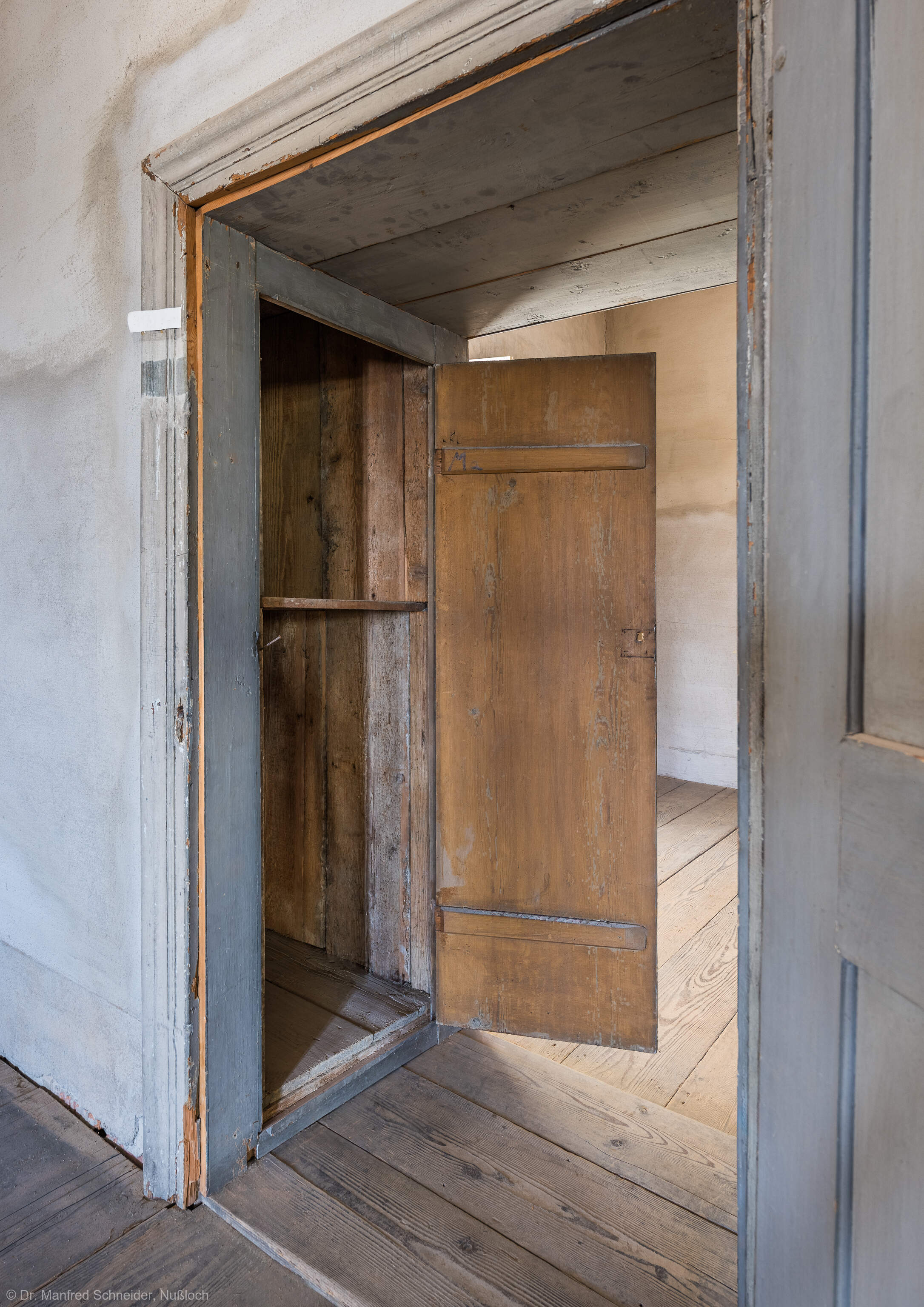 Schloss und Schlossgarten Schwetzingen - Schloss - Mittelbau - Von innen - 3. Obergeschoss - Westlicher Gang - Von Westen - Blick von der Tür zum Raum 241 nach Osten auf den geöffneten Wandschrank (aufgenommen im März 2026, um die Mittagszeit)
