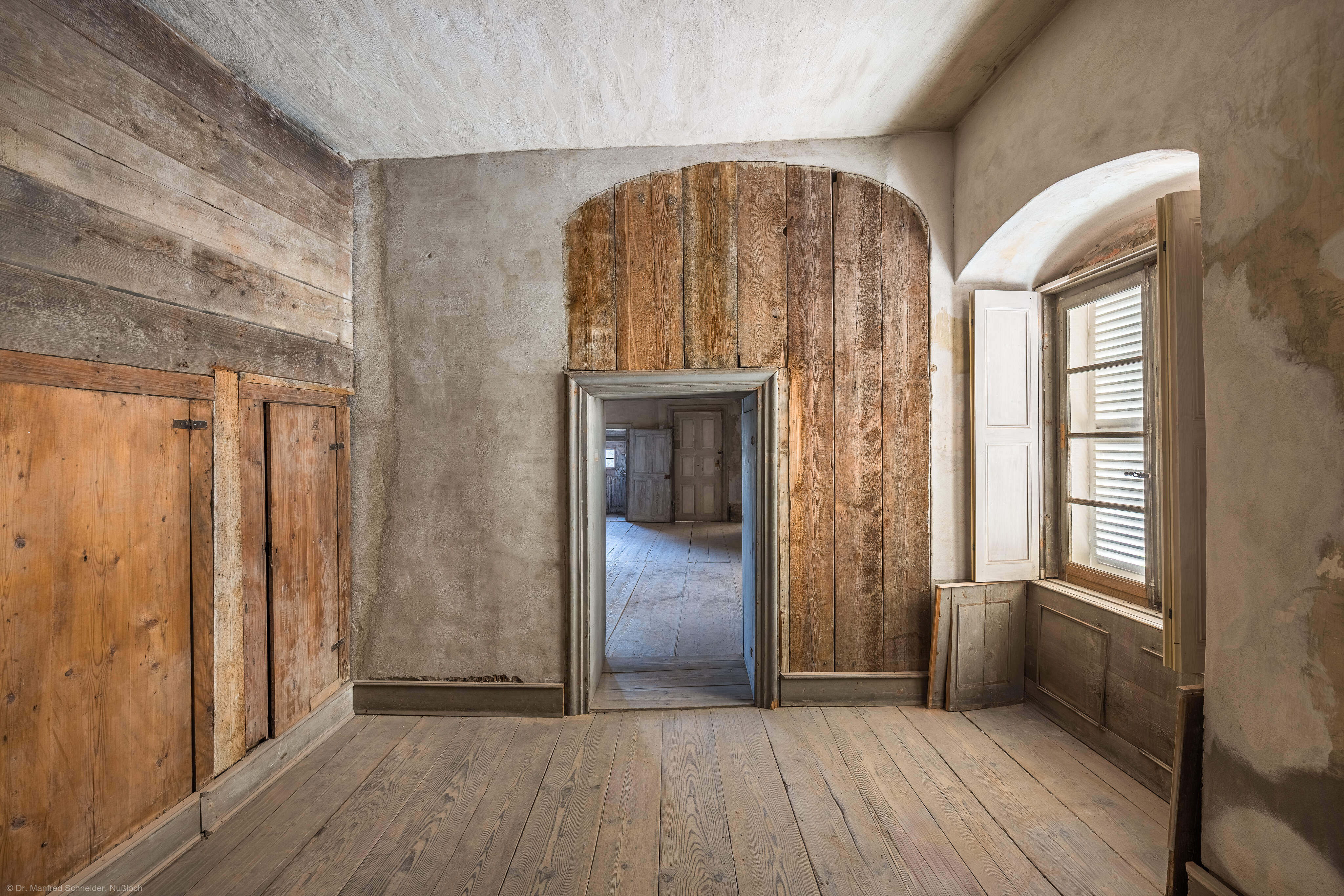 Schloss und Schlossgarten Schwetzingen - Schloss - Mittelbau - Von innen - 3. Obergeschoss - Westliche Räume - Raum 242 - Von Norden - Blick von der Nordwand nach Süden in den Raum, auf ein Stück freigelegtes Mauerwerk und auf die Tür zum Raum 241 (aufgenommen im März 2026, am Nachmittag)