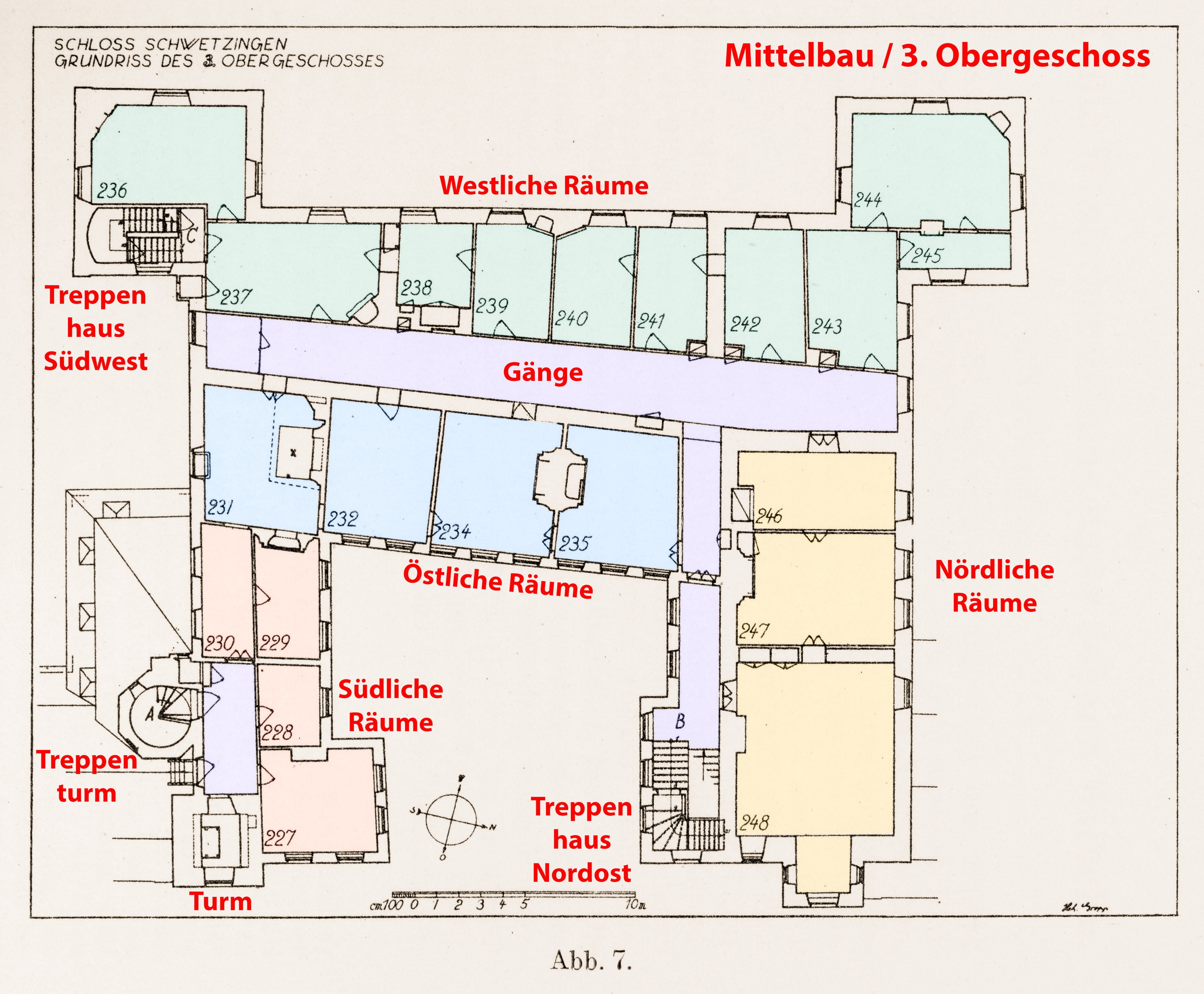 Schloss und Schlossgarten Schwetzingen - Erweiterte Abb. 7: "Grundriß des 3. Obergeschosses" (Raum 235) des Buches "Heinrich Gropp: Das Schwetzinger Schloß zu Anfang des 18. Jahrhunderts – Dissertation – 1930" (Reproduktion durch Dr. Manfred Schneider, August 2023)
