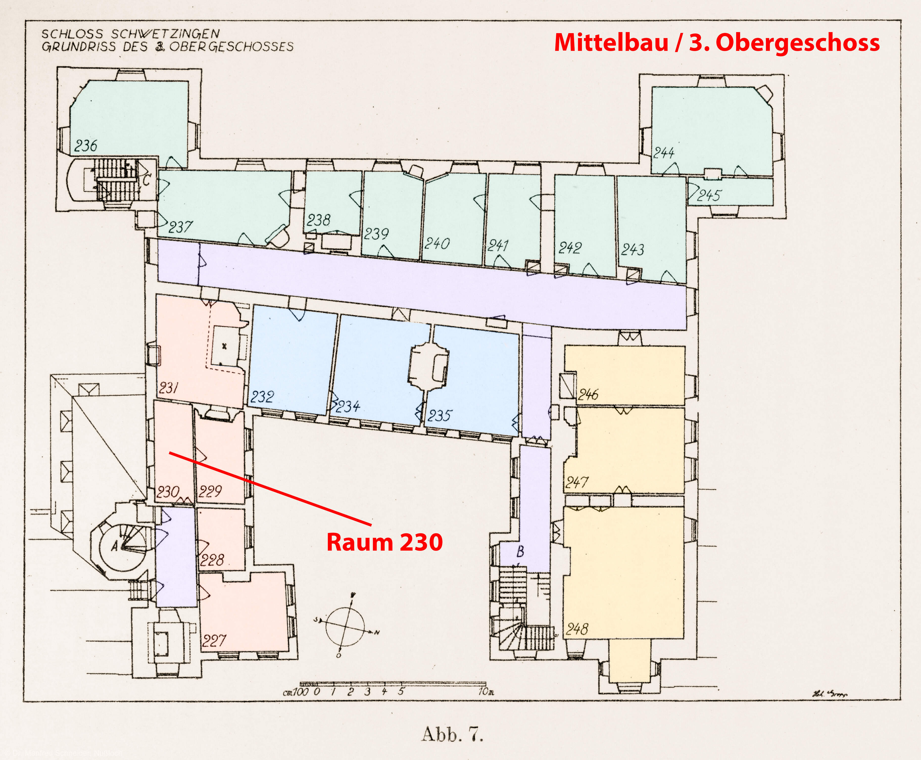 Schloss und Schlossgarten Schwetzingen - Erweiterte Abb. 7: "Grundriß des 3. Obergeschosses" (Raum 230) des Buches "Heinrich Gropp: Das Schwetzinger Schloß zu Anfang des 18. Jahrhunderts – Dissertation – 1930" (Reproduktion durch Dr. Manfred Schneider, August 2023)