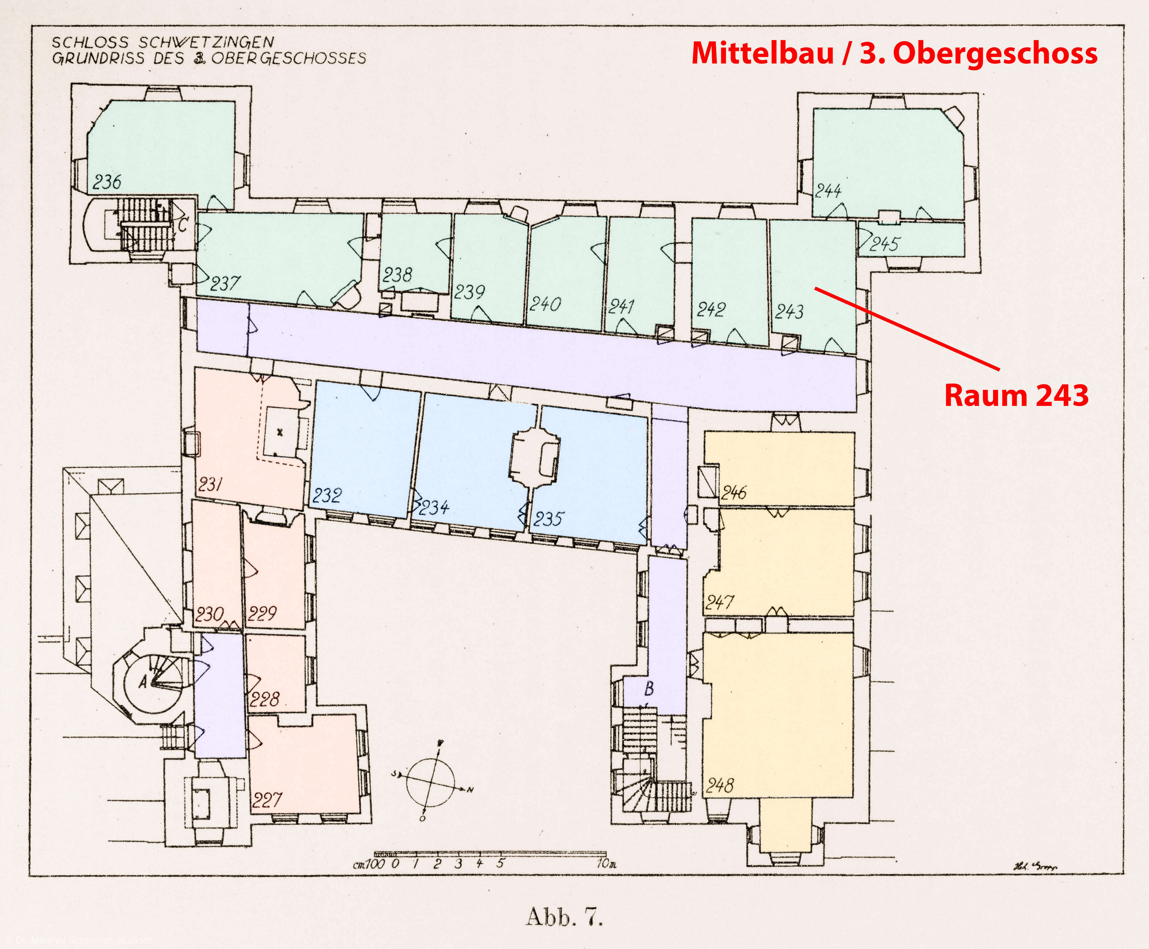 Schloss und Schlossgarten Schwetzingen - Erweiterte Abb. 7: "Grundriß des 3. Obergeschosses" (Raum 243) des Buches "Heinrich Gropp: Das Schwetzinger Schloß zu Anfang des 18. Jahrhunderts – Dissertation – 1930" (Reproduktion durch Dr. Manfred Schneider, August 2023)