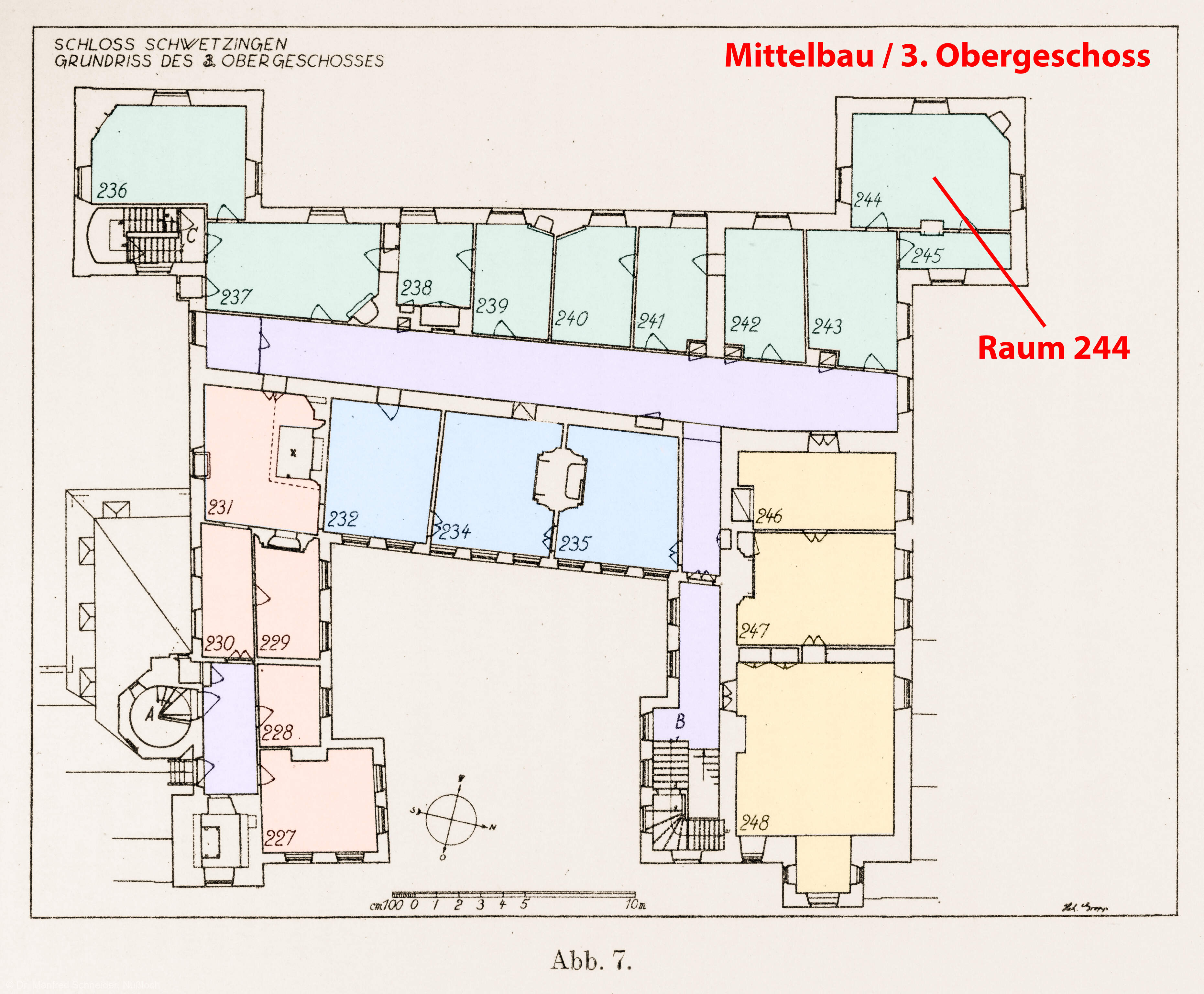 Schloss und Schlossgarten Schwetzingen - Erweiterte Abb. 7: "Grundriß des 3. Obergeschosses" (Raum 244) des Buches "Heinrich Gropp: Das Schwetzinger Schloß zu Anfang des 18. Jahrhunderts – Dissertation – 1930" (Reproduktion durch Dr. Manfred Schneider, August 2023)