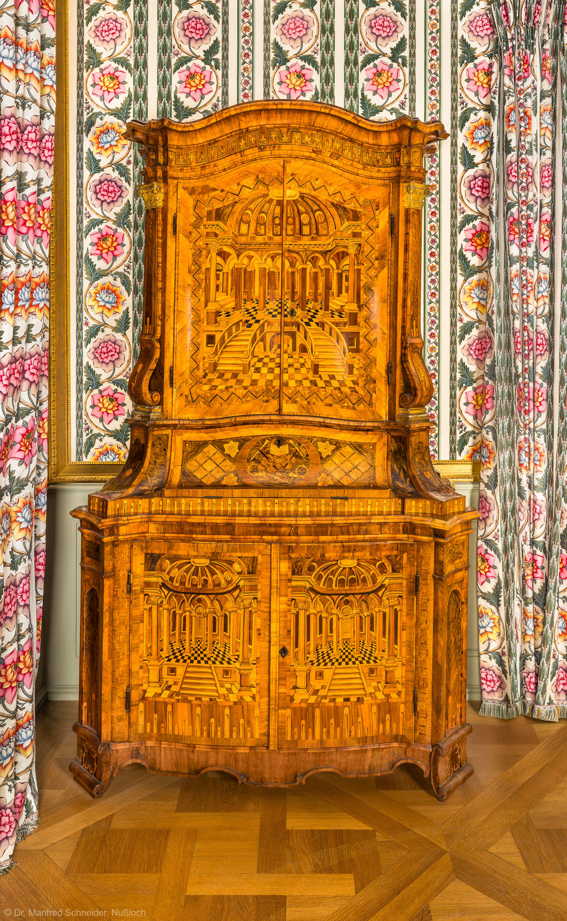 Schloss und Schlossgarten Schwetzingen - Schloss - Mittelbau - Von innen - 1. Obergeschoss - Appartment des Kurfürsten - Schlafzimmer - Ostwand - Blick auf einen Schreibschrank mit aufwendigen Intarsienarbeiten (Kunstschreiner: Johann Georg Wahl (1702-1773)) (aufgenommen im Januar 2026, am späten Vormittag)