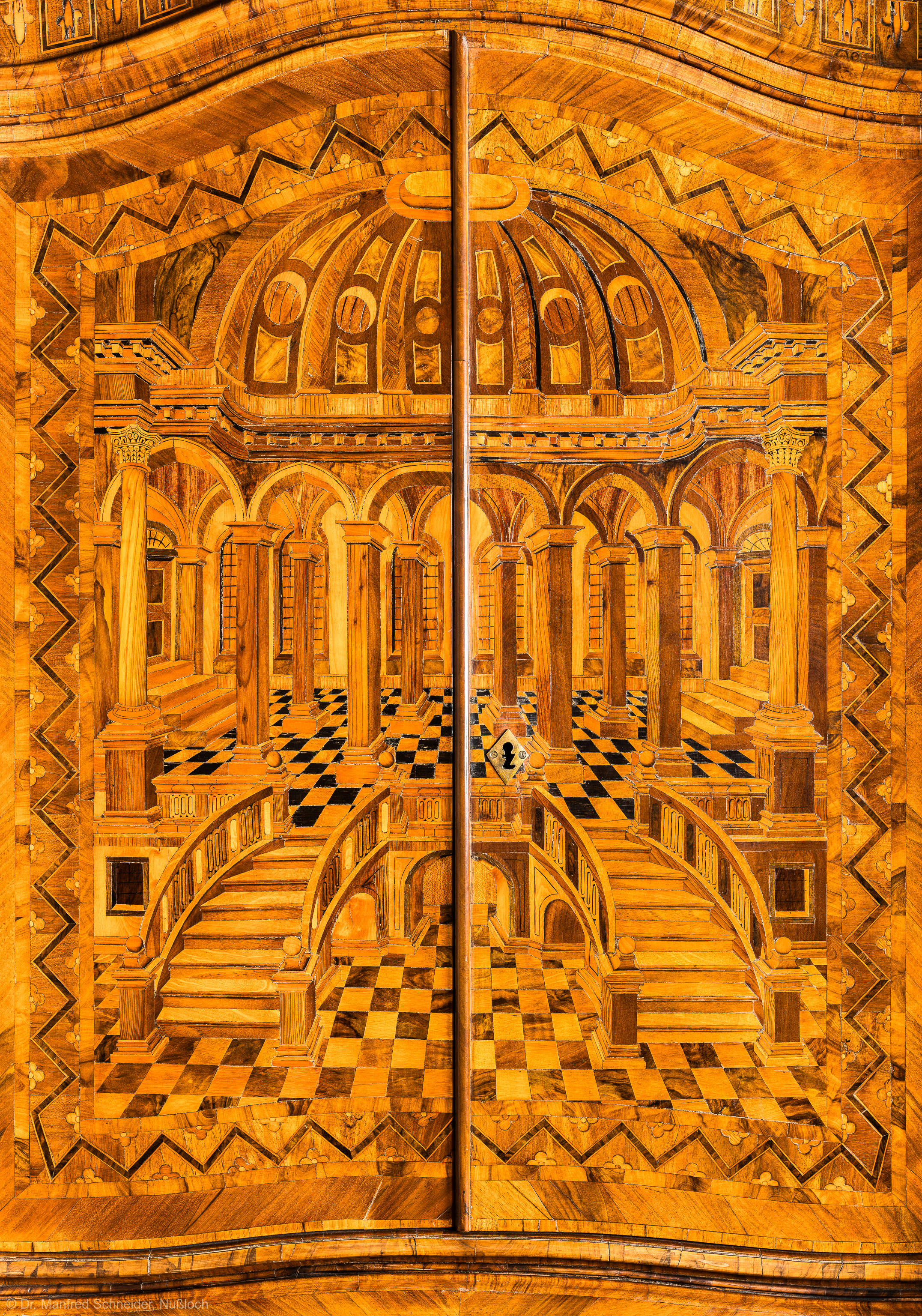 Schloss und Schlossgarten Schwetzingen - Schloss - Mittelbau - Von innen - 1. Obergeschoss - Appartment des Kurfürsten - Schlafzimmer - Ostwand - Rechte Schranktür mit aufwendigen Intarsienarbeiten des Unterteils eines Schreibschranks (Kunstschreiner: Johann Georg Wahl (1702-1773)) (aufgenommen im Januar 2026, am frühen Nachmittag)
