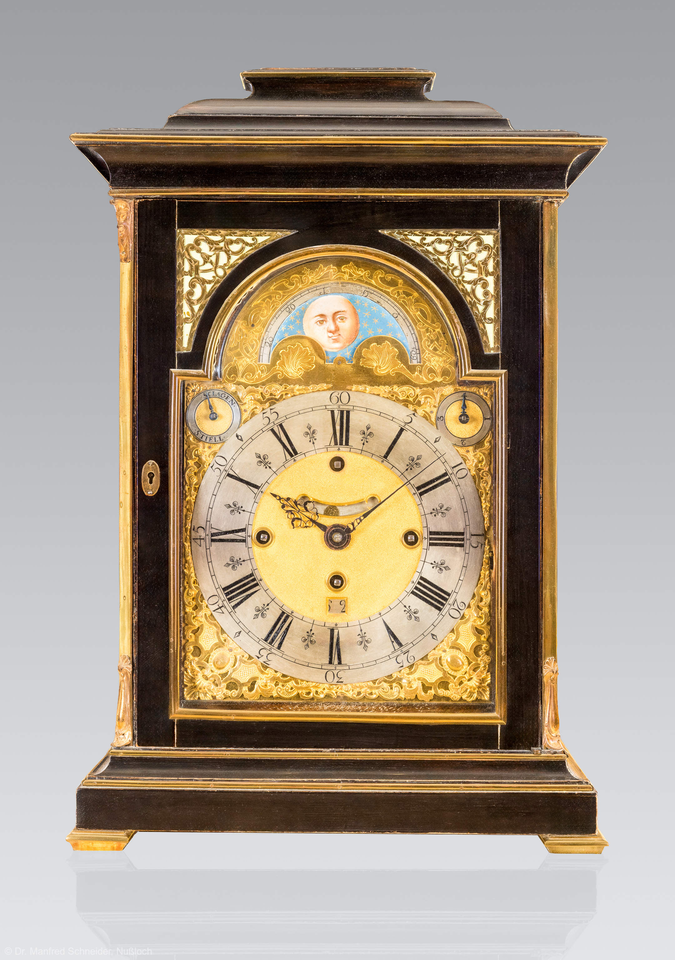 Schloss und Schlossgarten Schwetzingen - Schloss - Mittelbau - Von innen - 1. Obergeschoss - Appartment des Kurfürsten - Schlafzimmer - Nordwand, Kommode - Kastenuhr / Kommodenuhr (Herkunft: Mannheim, Datierung: um 1720-30; Material: Ebenholz und vergoldetes Messing; Ausstattung: Anzeige für Datum und Mondphase, Doppelschlag und eine Walze für vier Stücke; Höhe x Breite x Tiefe: ca. 56 x 37 x 26 cm) (aufgenommen im Januar 2026, am Nachmittag)