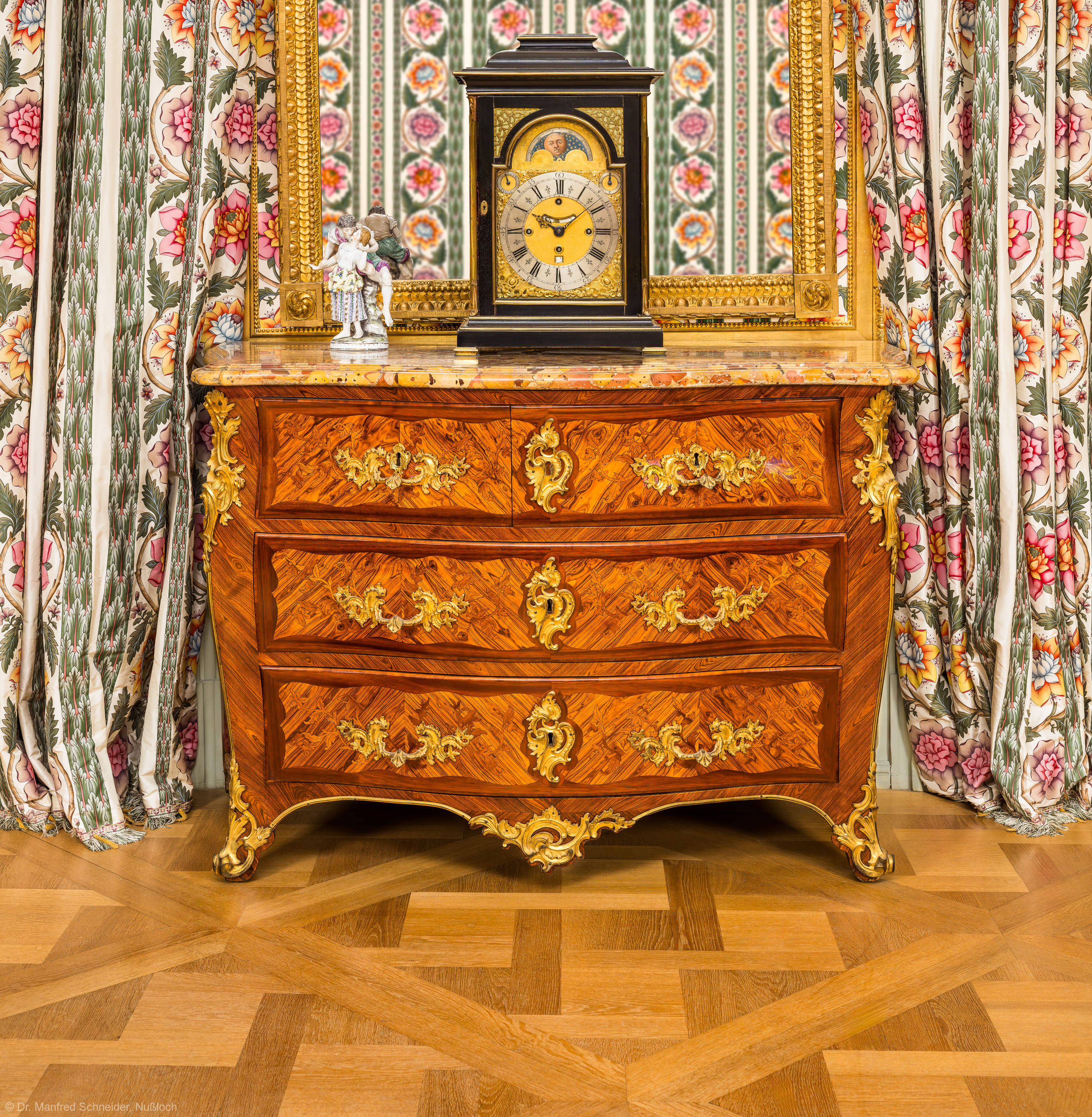 Schloss und Schlossgarten Schwetzingen - Schloss - Mittelbau - Von innen - 1. Obergeschoss - Appartment des Kurfürsten - Schlafzimmer - Nordwand - Blick auf eine Kommode (Kunstschreiner: Johann Georg Wahl (1702-1773)), darauf eine Kommodenuhr und eine Porzellanplastik (aufgenommen im Januar 2026, am Nachmittag)