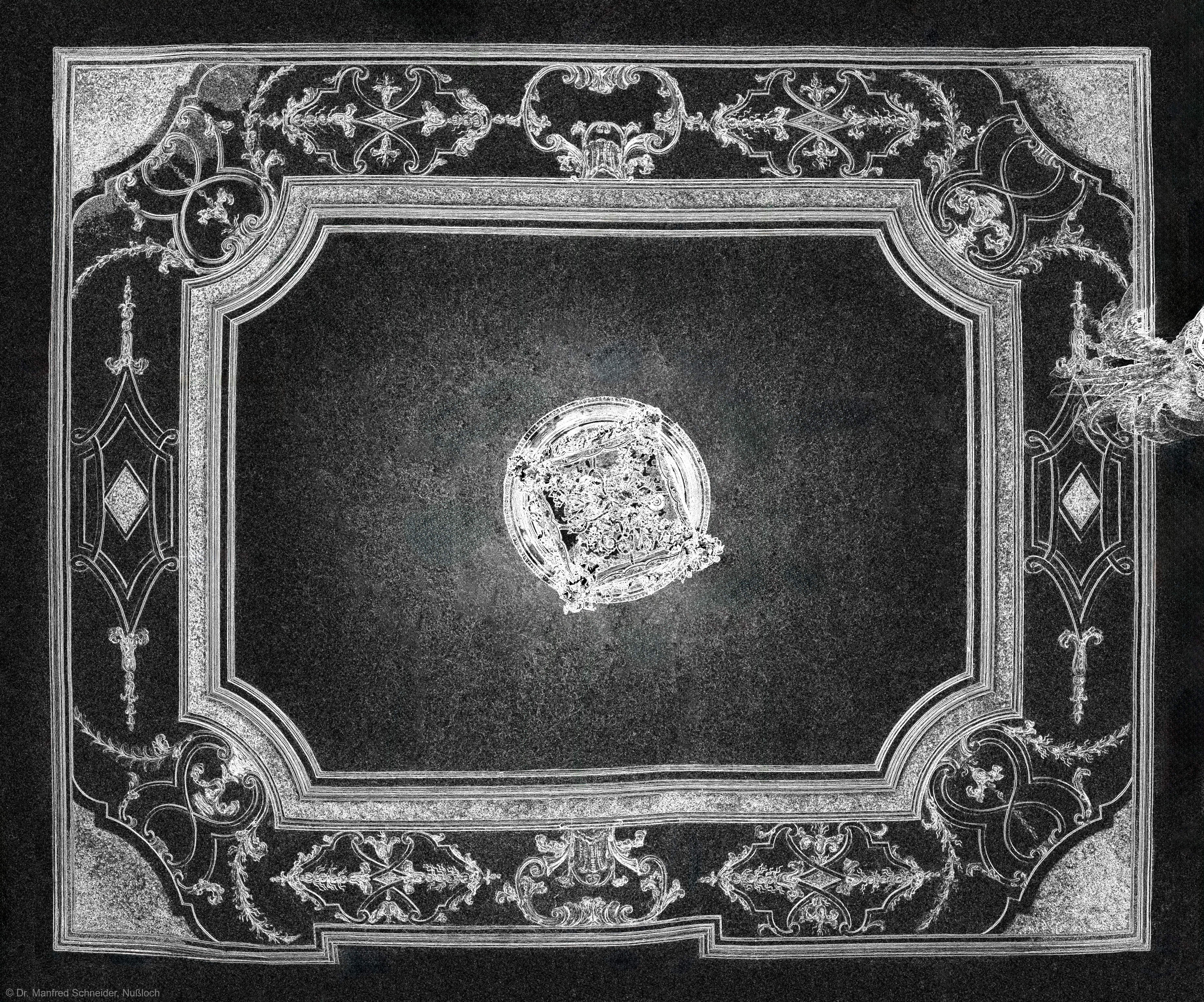 Schloss und Schlossgarten Schwetzingen - Schloss - Mittelbau- Von innen - 1. Obergeschoss - Appartment des Kurfürsten - Schlafzimmer - Decke - Grafische Darstellung der Decke mit den umlaufenden Stuckstreifen, der Laterne in der Mitte und der Feder des Betts rechts; eine Aufnahme der Decke wurde mittels Bildbearbeitung so verändert, dass der Reliefcharakter des Stucks deutlicher hervortritt; unten im Bild ist Süden (aufgenommen im Januar 2026, um die Mittagszeit)
