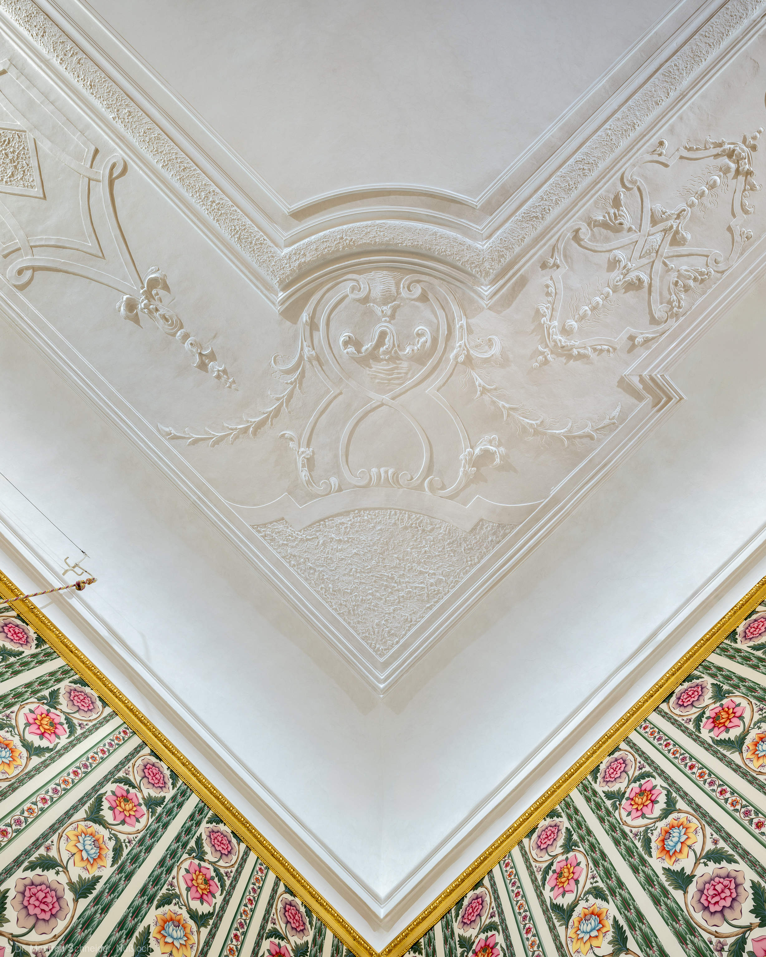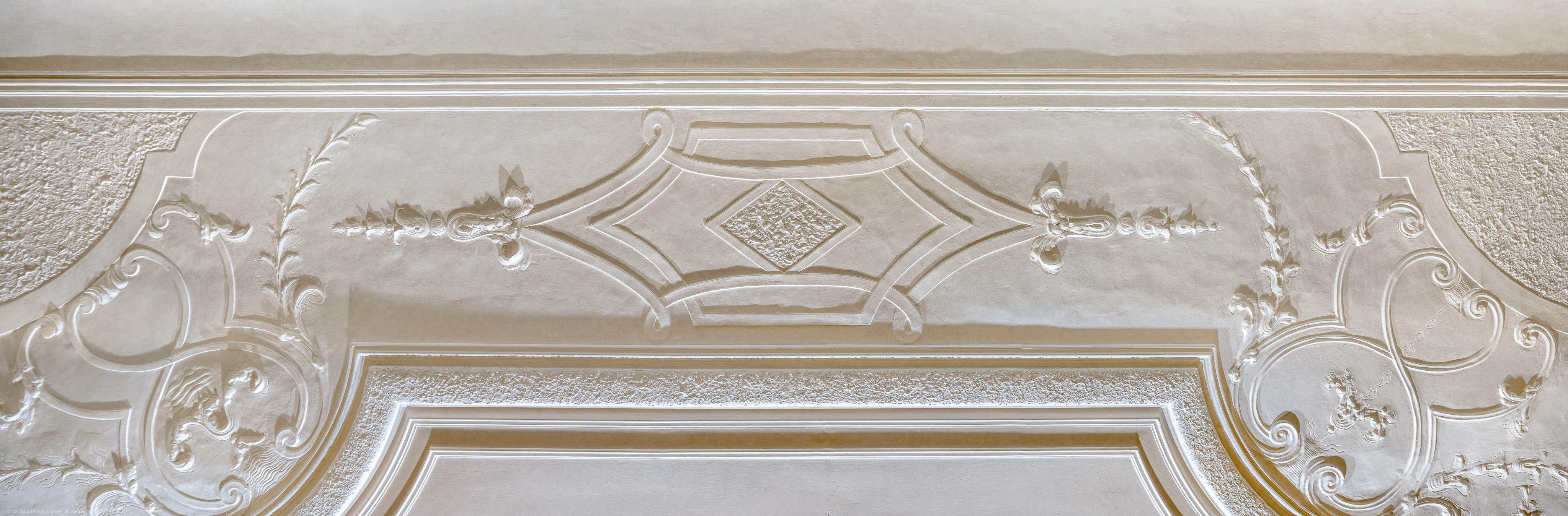 Schloss und Schlossgarten Schwetzingen - Schloss - Mittelbau - Von innen - 1. Obergeschoss - Appartment des Kurfürsten - Schlafzimmer - Decke - Ausschnitt aus dem mittleren Stuckstreifen an der Ostseite der Decke (aufgenommen im Januar 2026, am frühen Nachmittag)