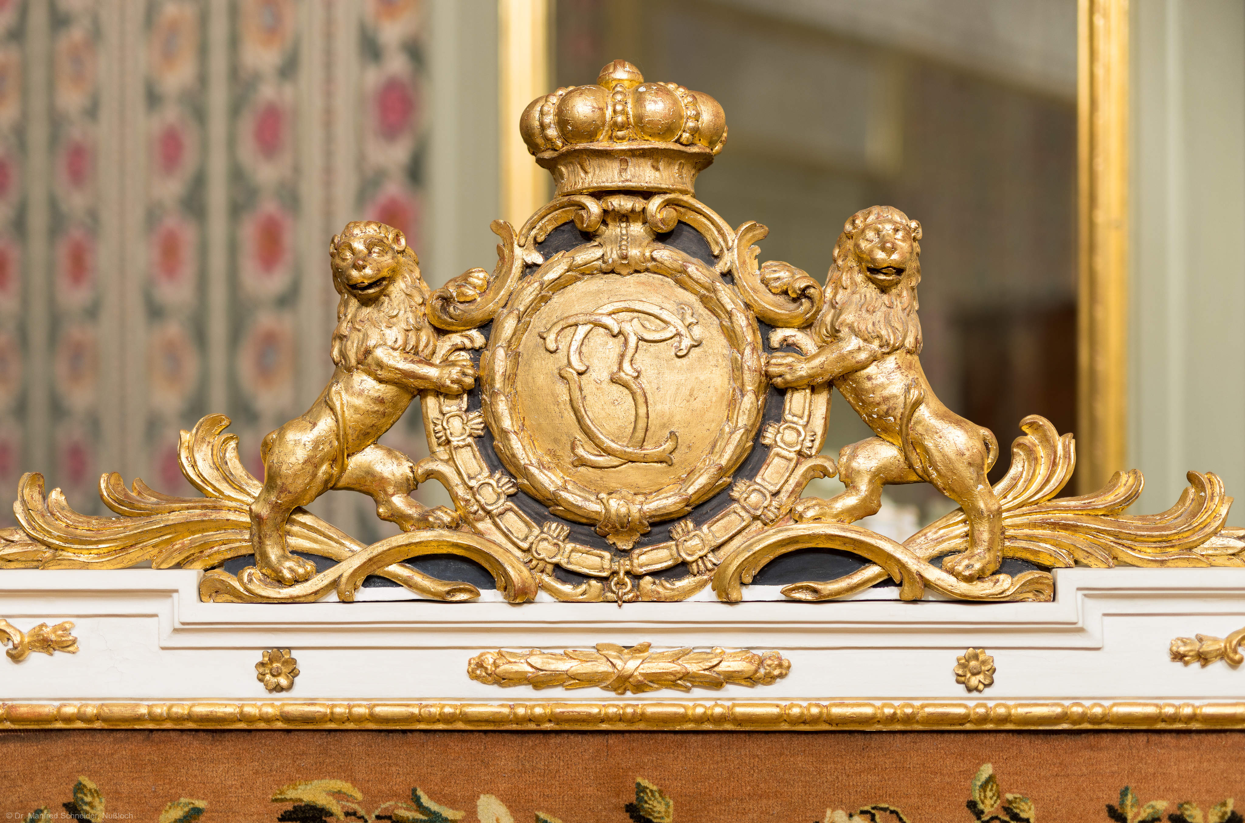 Schloss und Schlossgarten Schwetzingen - Schloss - Mittelbau - Von innen - 1. Obergeschoss - Appartment des Kurfürsten - Schlafzimmer - Südwand - Blick auf den Aufsatz des Kaminschirms (Datierung: um 1775; mit Monogramm "CT" für Carl Theodor, Ordenskette, zwei aufsteigenden Pfälzer Löwen, Kurhut und Schilfstengeln) (aufgenommen im Januar 2026, am späten Nachmittag)